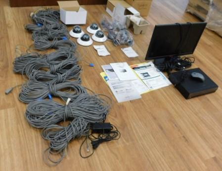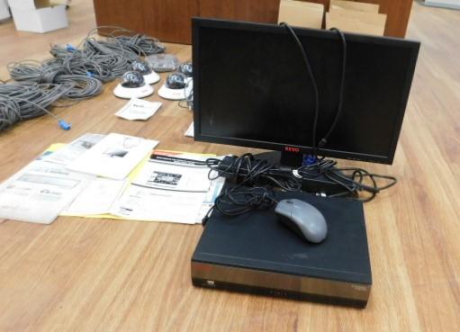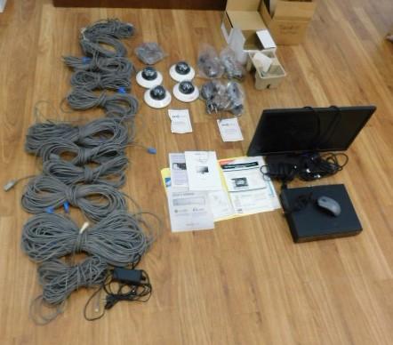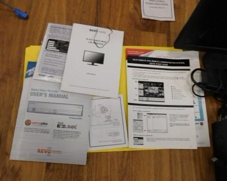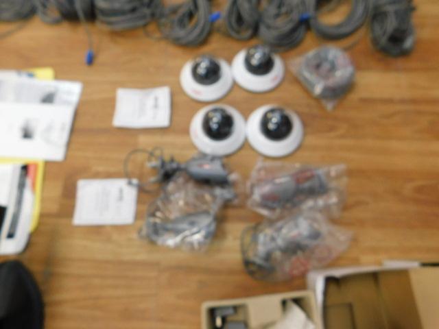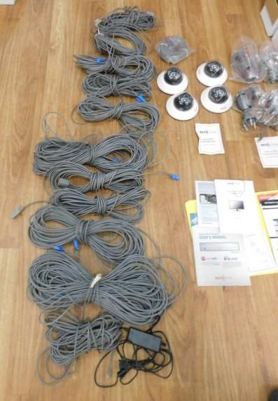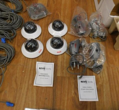 Complete Security Surveillance System by Revo Includes Cabling and 8 Cameras. Approximately 1500' of cabling, 4 indoor cameras and 4 indoor/outdoor cameras. Motion Detection drive.