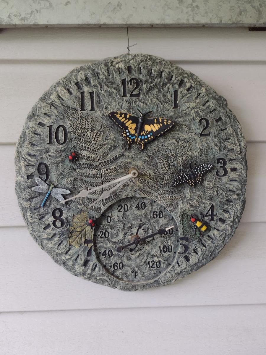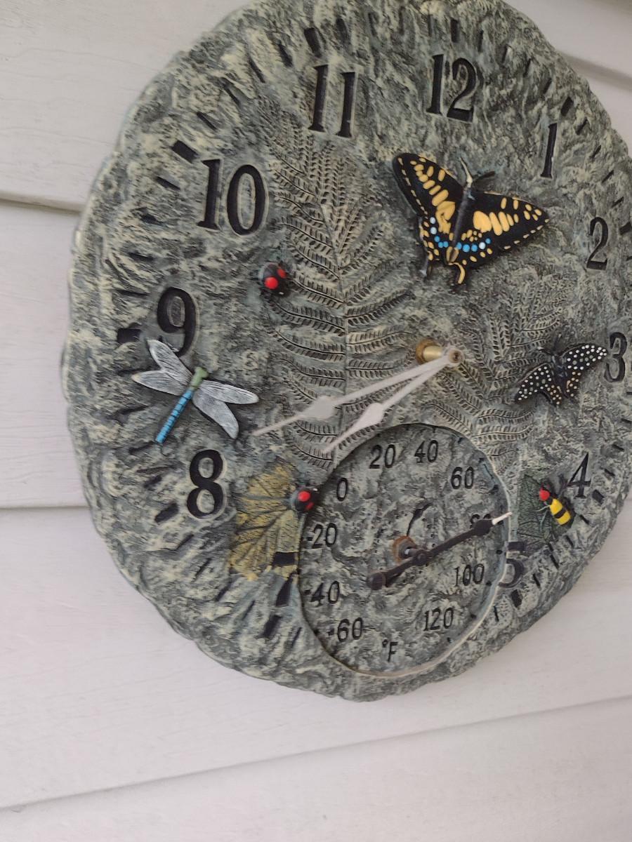 Composite Butterfly Design Clock Thermometer. Clock not functioning- may need new battery.