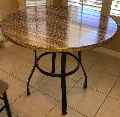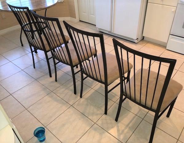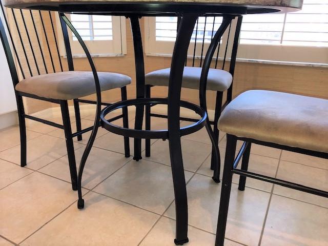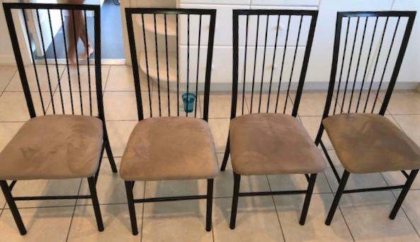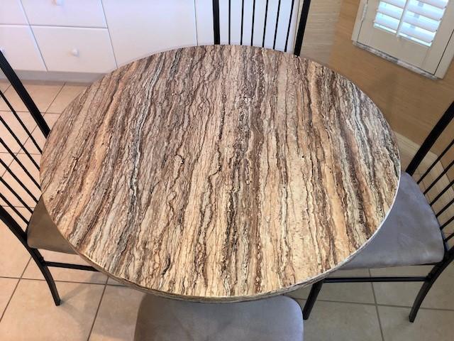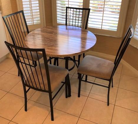 This dinette set is in very good overall condition. The top of this dinette table is a composite style of top. The seated areas of the chairs do show some stains however minor