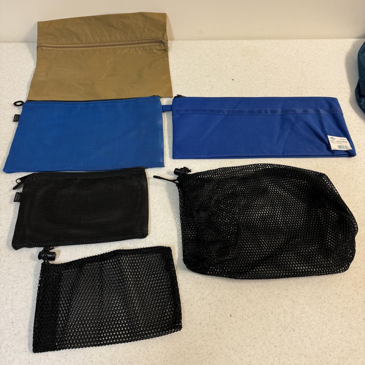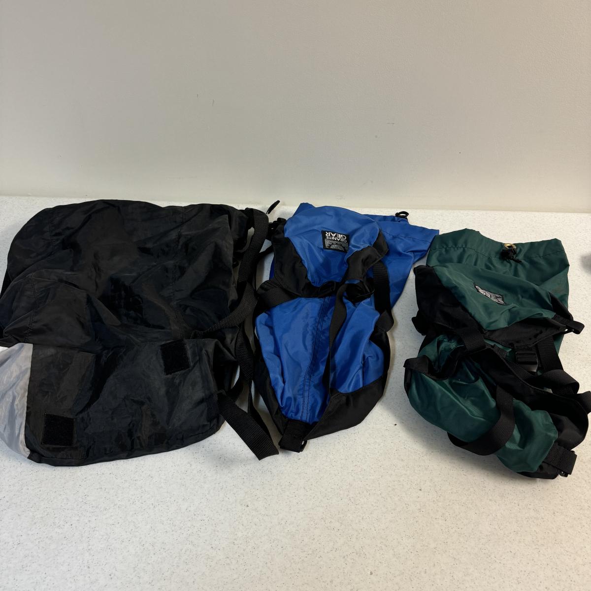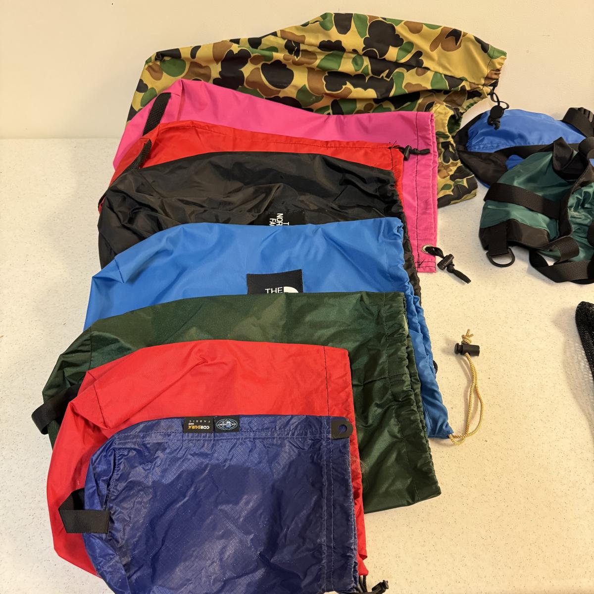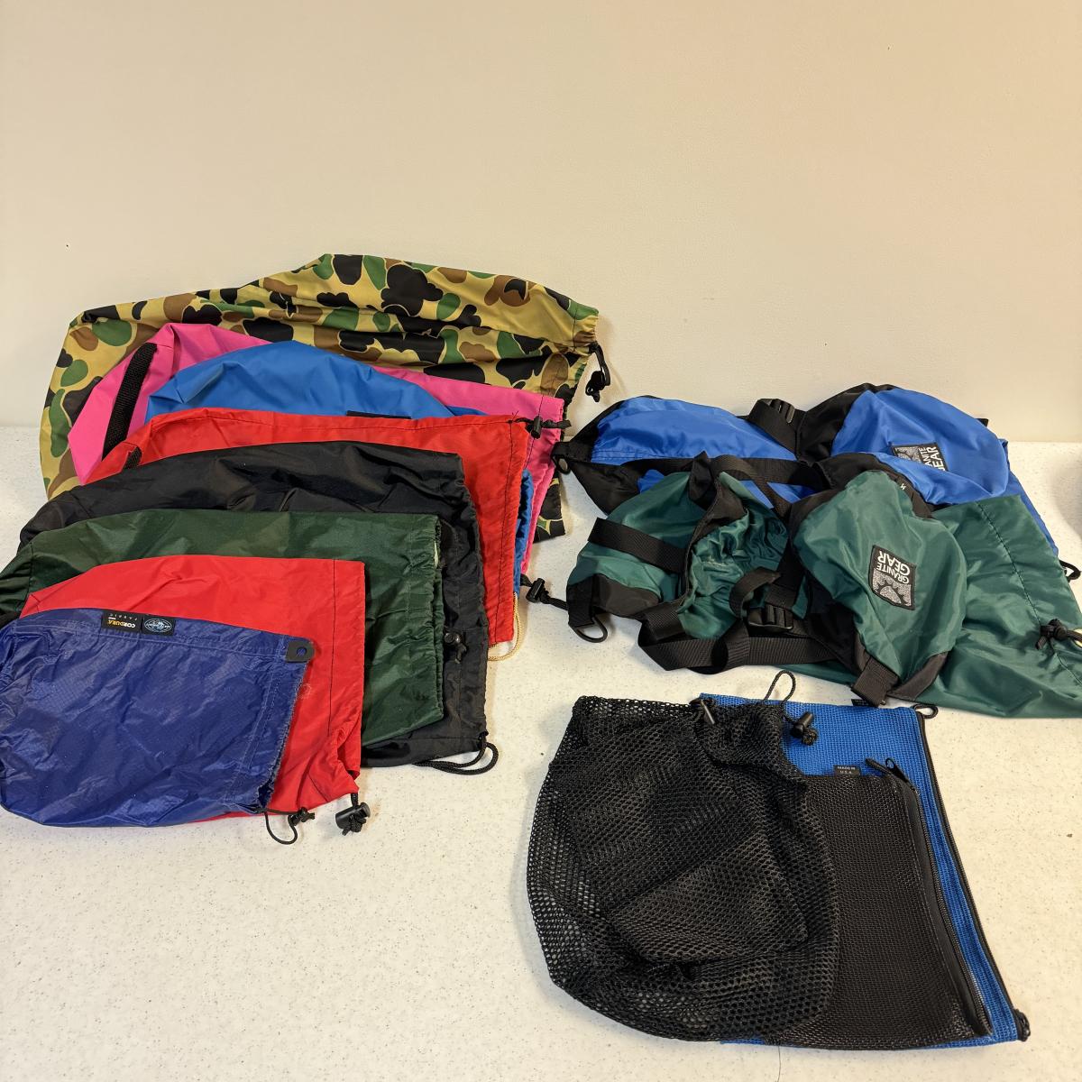 Several sizes of storage bags by North Face, Sea to Summit and unbranded. Largest camo one measures 22” long. Smallest one measures 10” long. Lot also includes three compression sacks, several zippered pouches, two small backpacks and two long skinny bags. Shipping available.