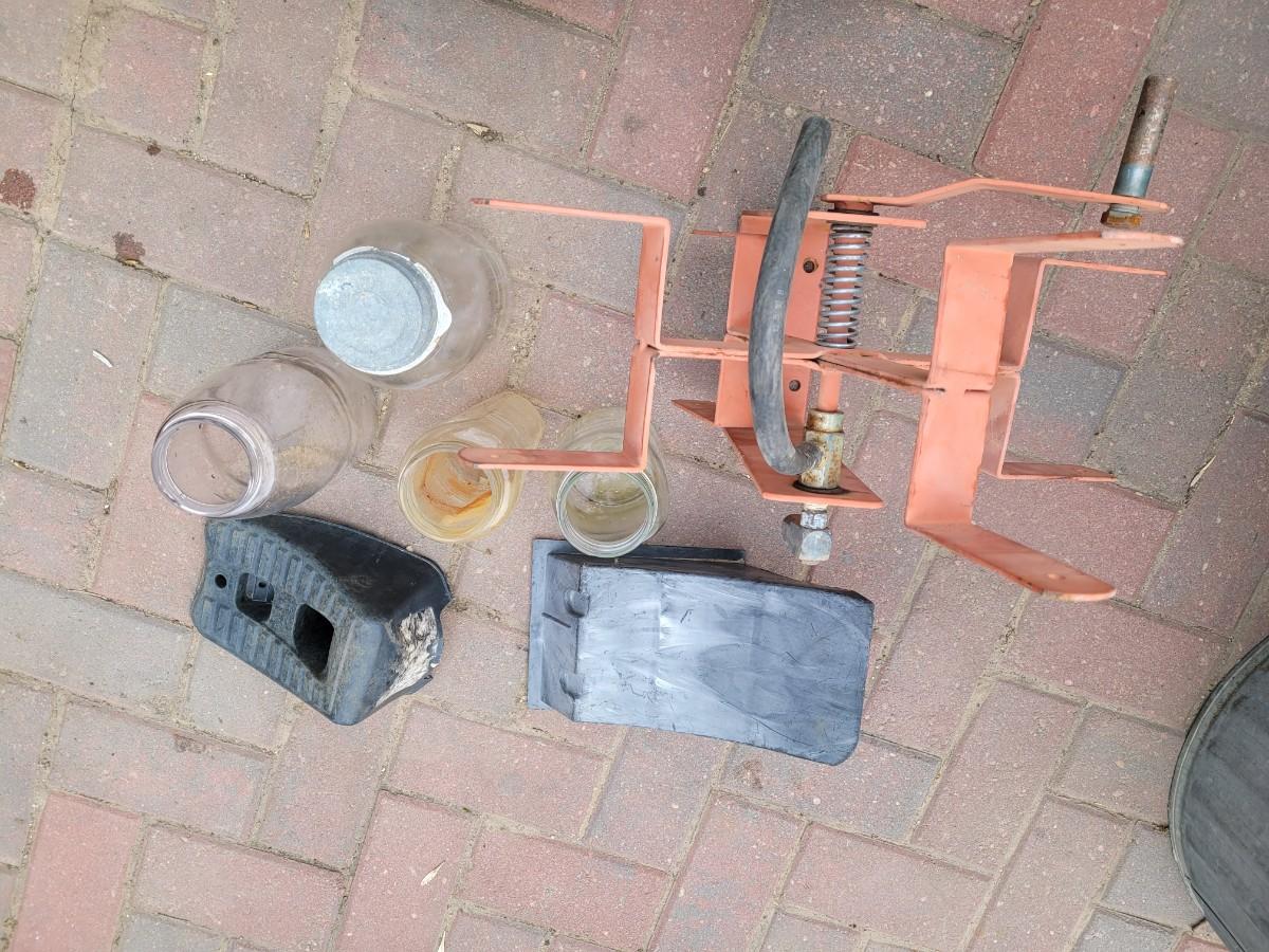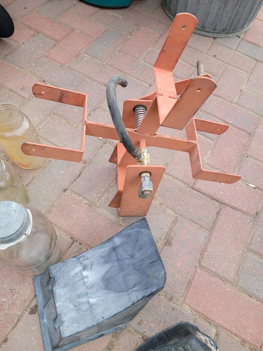 Compressor hose reel, vintage Mason jars and wheel chocks