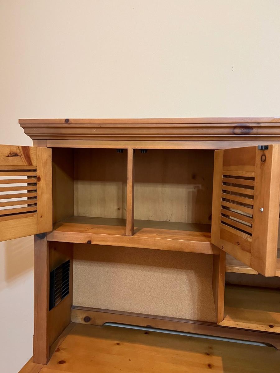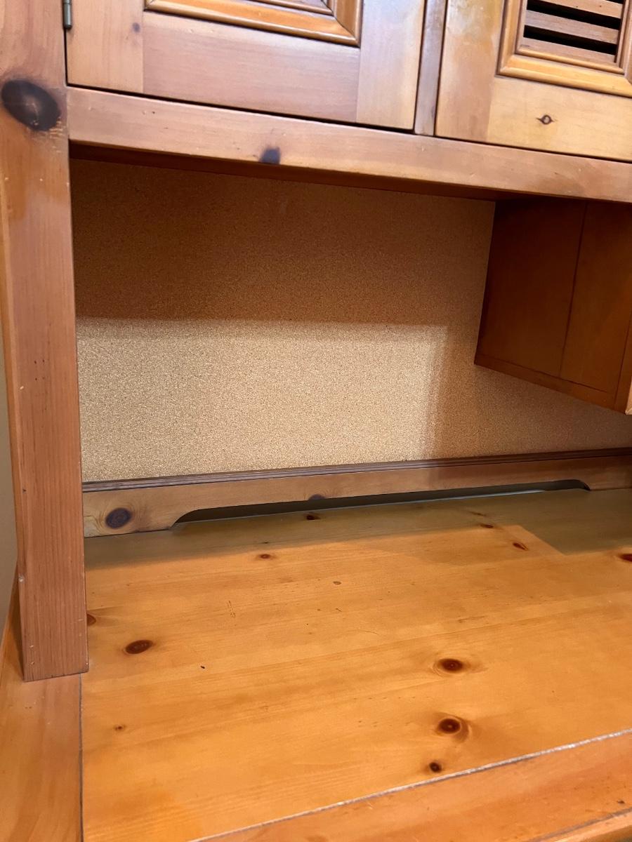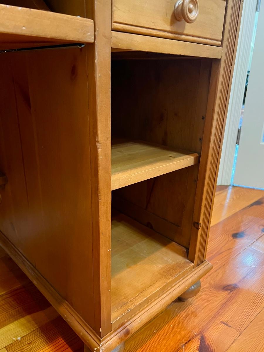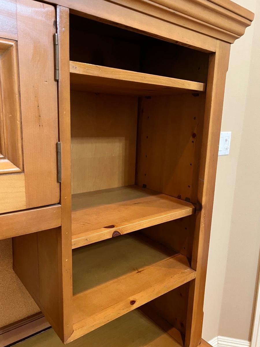 2-pieces ~ Drawer slides easy ~ Shelving is adjustable ~ Has peg board backing ~ *Has small nail sticking out a little bit in slide out keyboard drawer, see photos ~ 66.5” H x 46.50” W x 24.5” D ~ no name brand stamped on desk, but purchased from Hurwitz Mintz