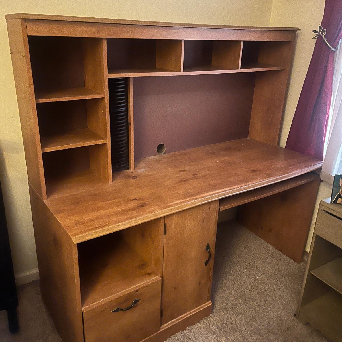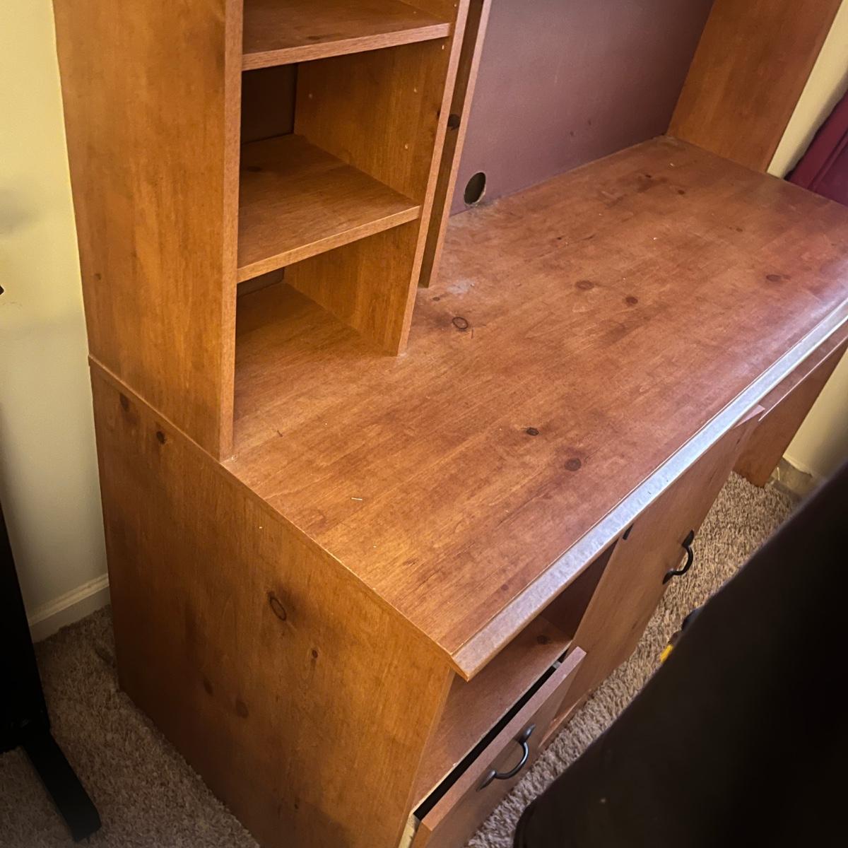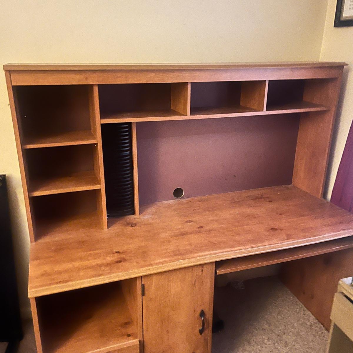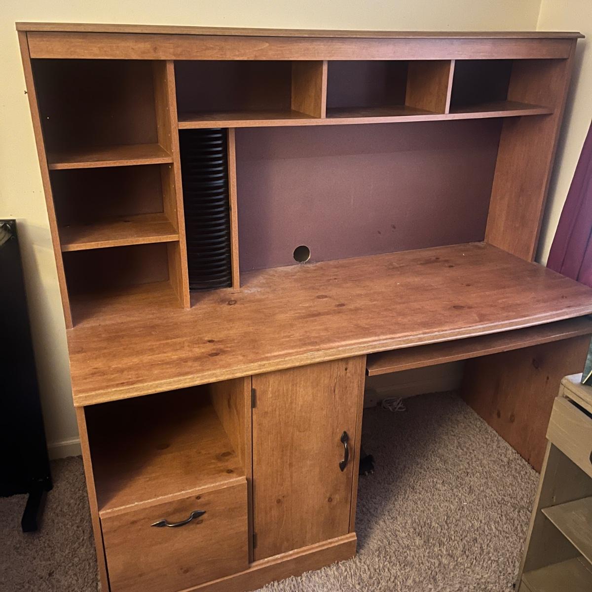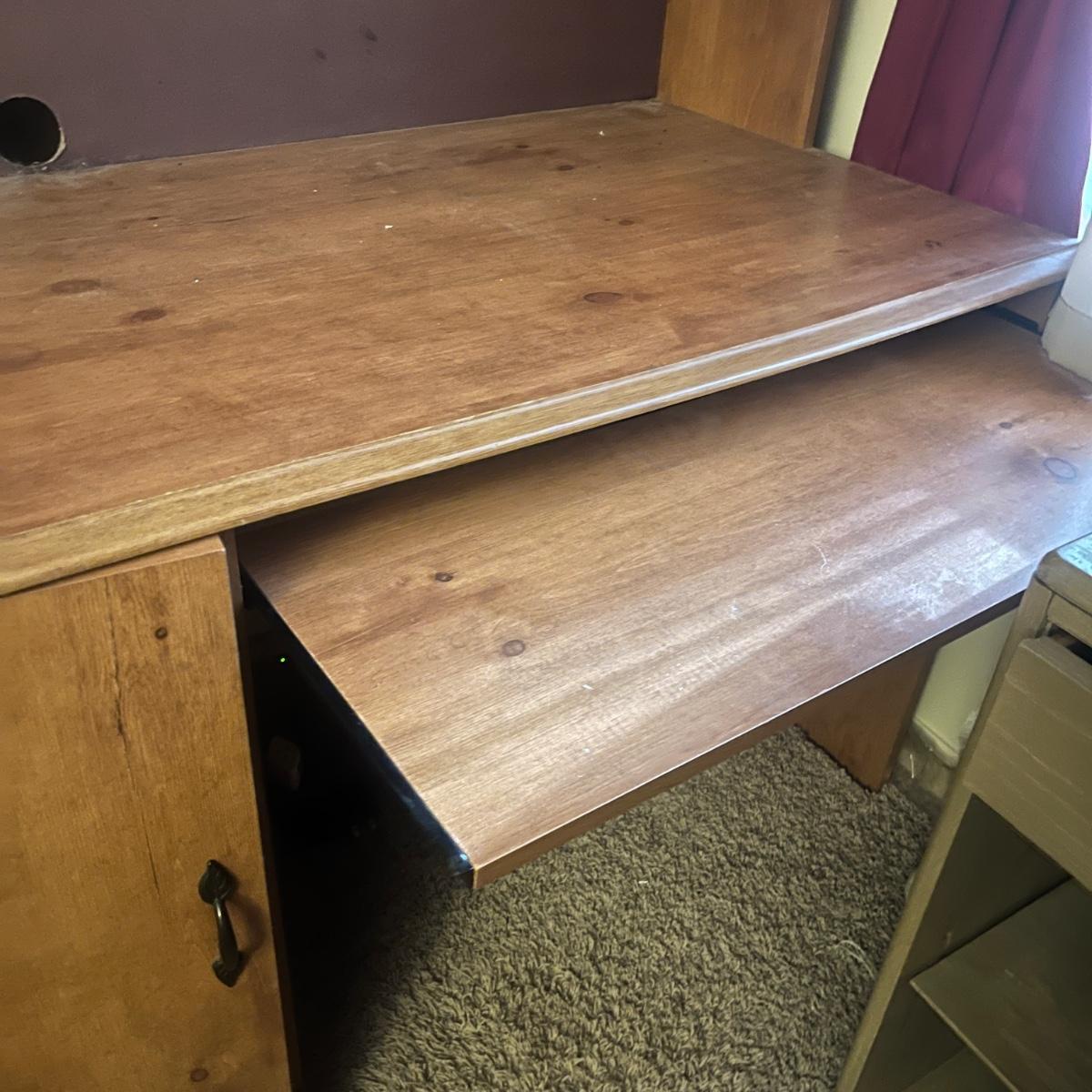 This computer desk has a keyboard drawer, CPU cabinet with cubby holes around the top and a CD holder. Desk measures 59” x 24” x 56”H and appears to be one piece and made from pressed wood.