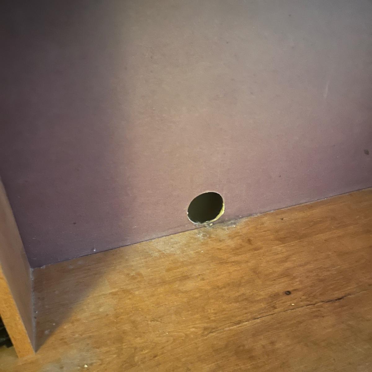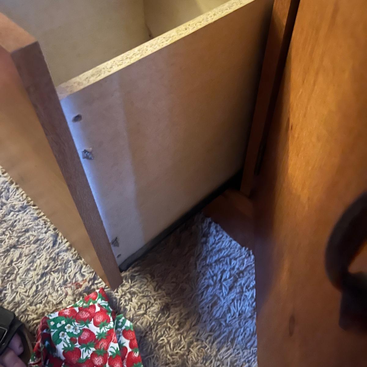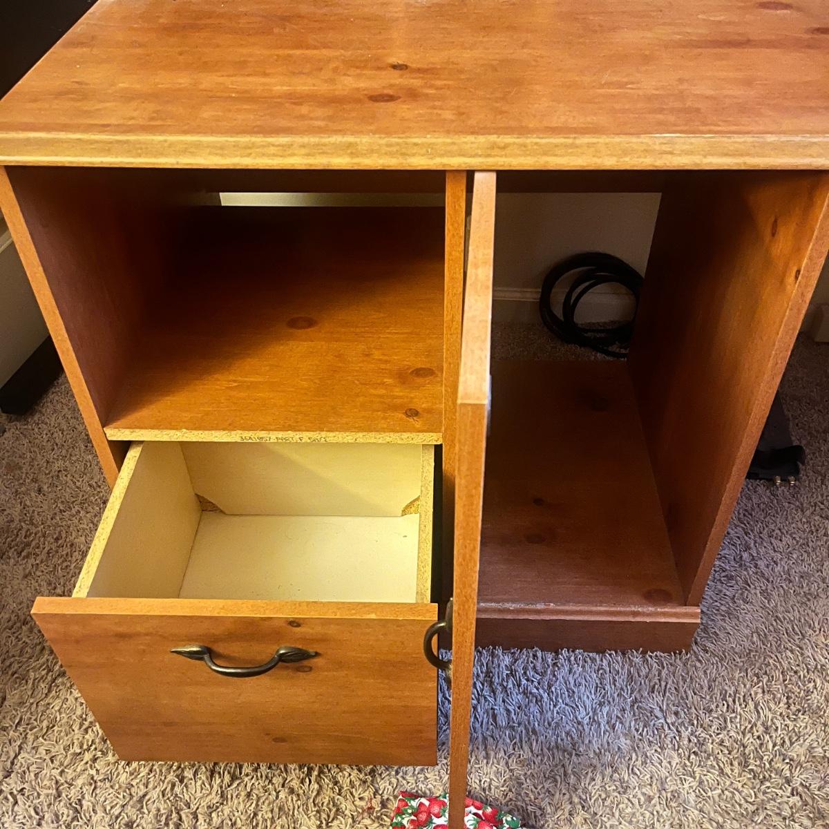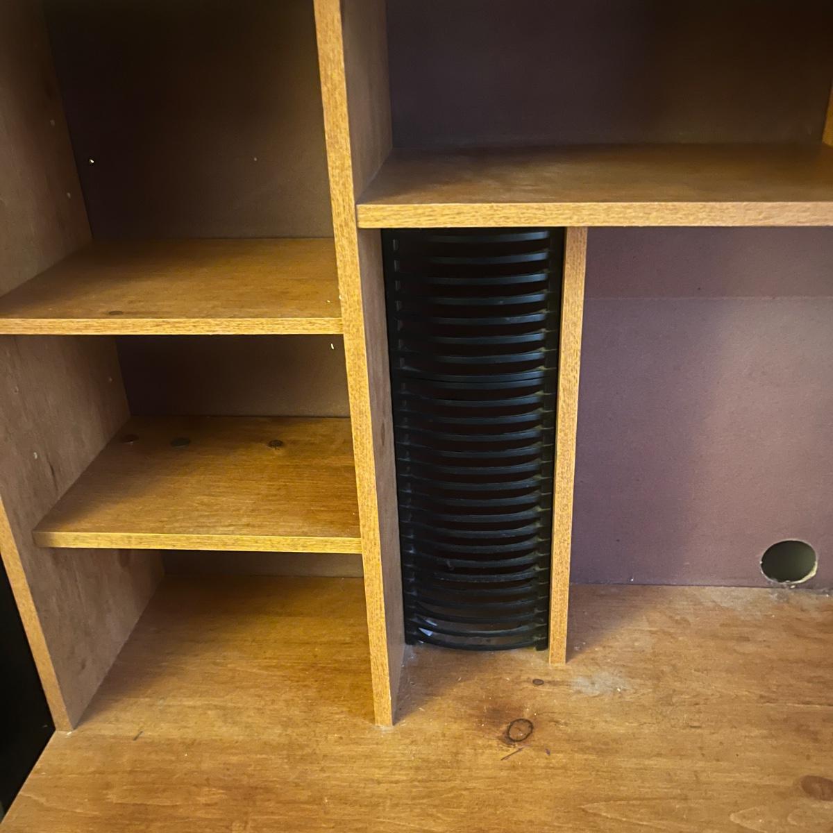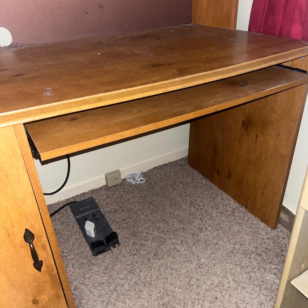 This computer desk has a keyboard drawer, CPU cabinet with cubby holes around the top and a CD holder. Desk measures 59” x 24” x 56”H and appears to be one piece and made from pressed wood.