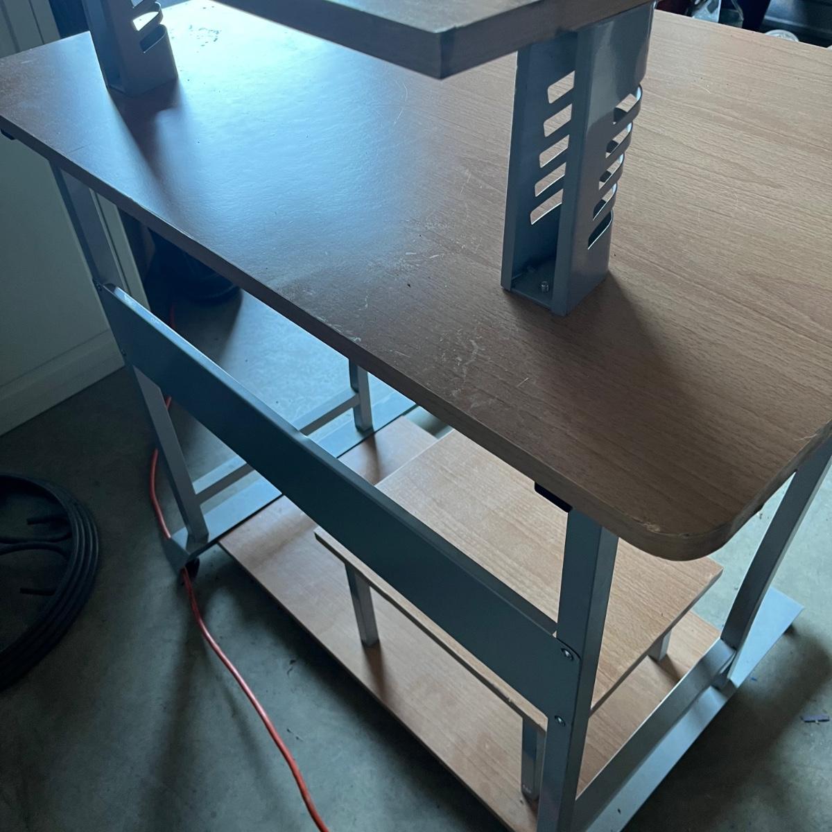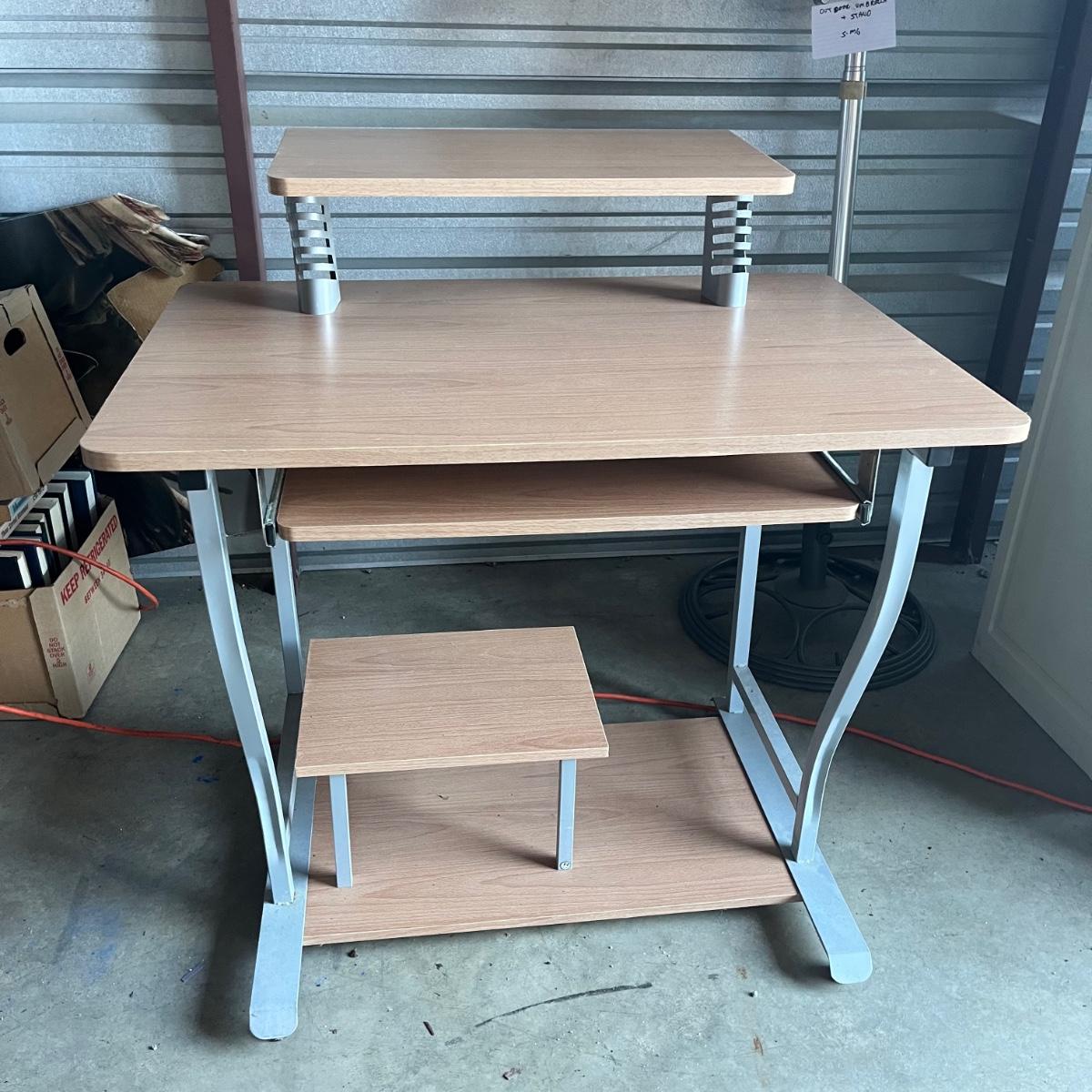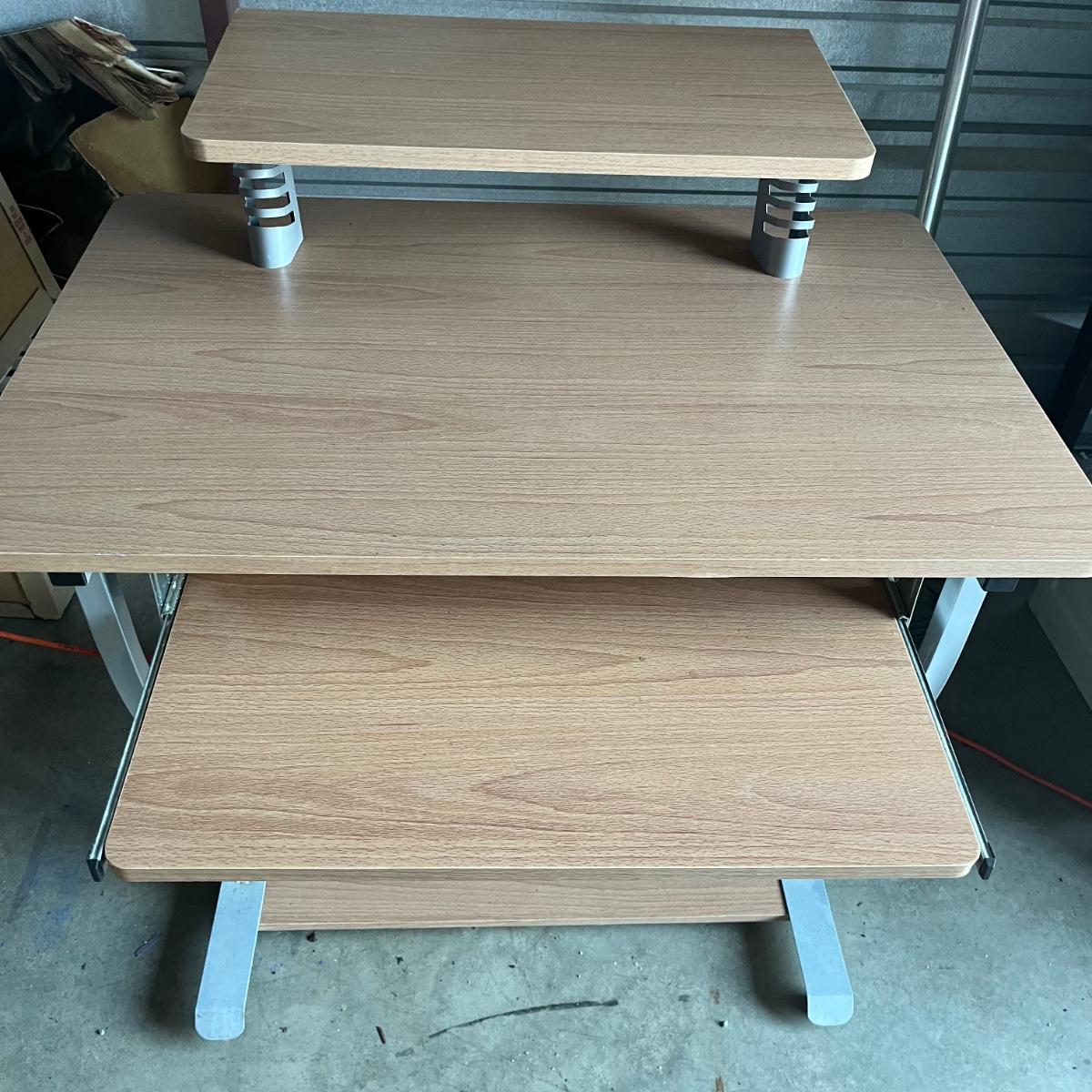 Lot includes a metal and press board computer desk with sliding keyboard drawer and raised monitor stand. Desk measures 23.5” x 35.5” x 38”.
