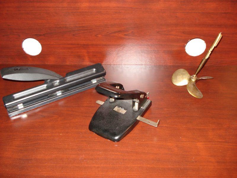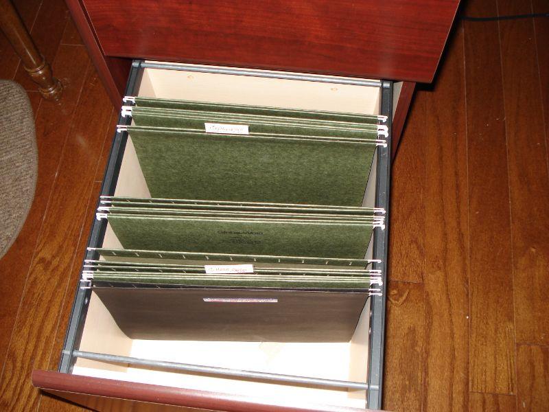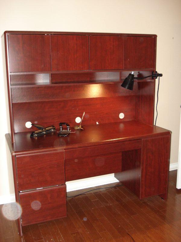 I'm sure this is fiberboard but it is a nicer one. door shelves on top, has 2 file drawers on the left, slide out for keyboard underdesk in the middle and the plastic piece that holds it in place is broken but it still works, storage on the right behind door. Comes also with hole punches, a propeller pen and clip on lamp. in Very Good condition.