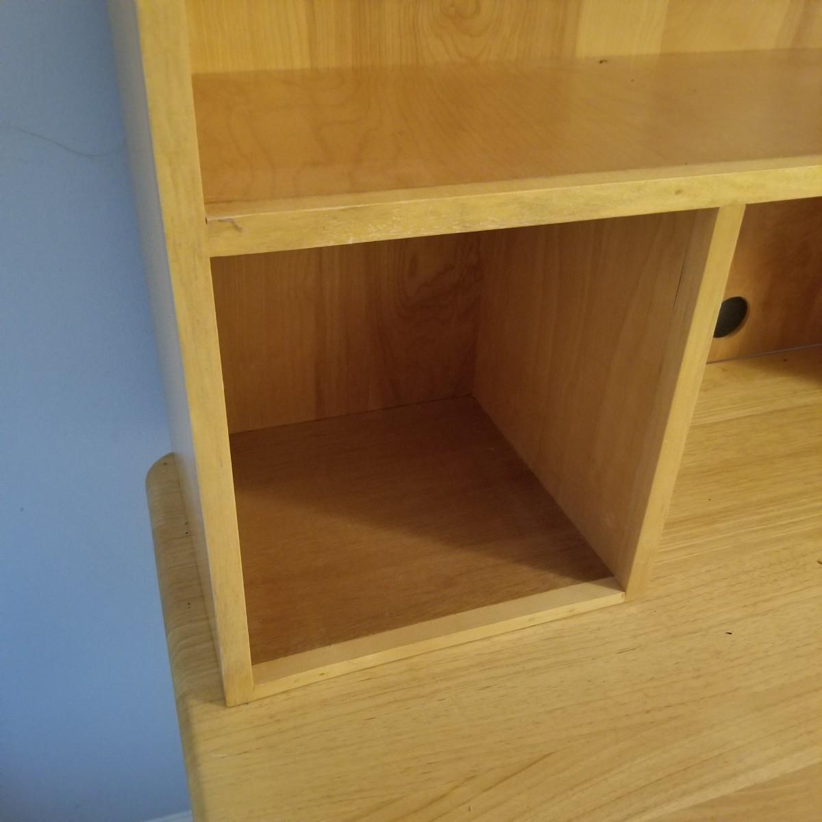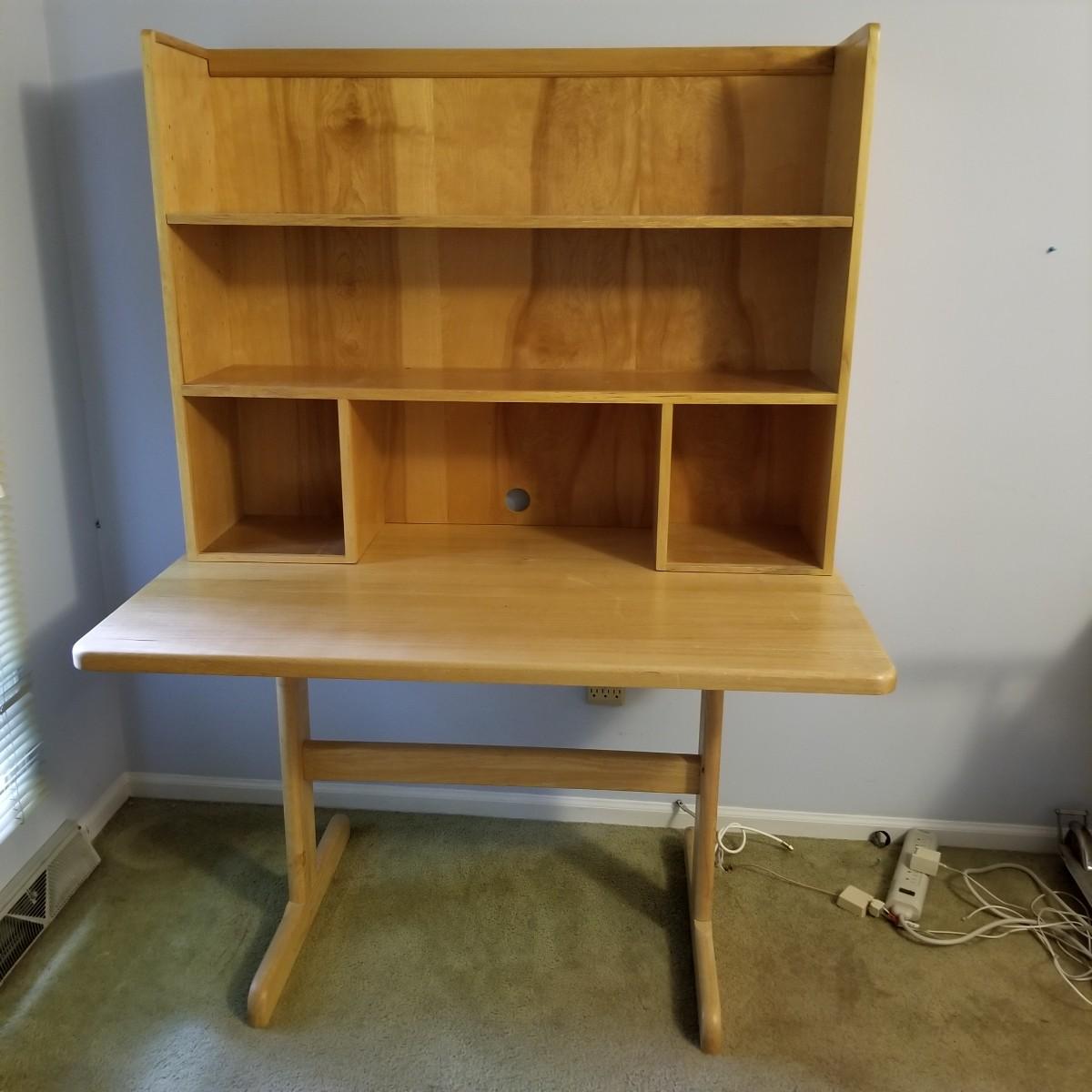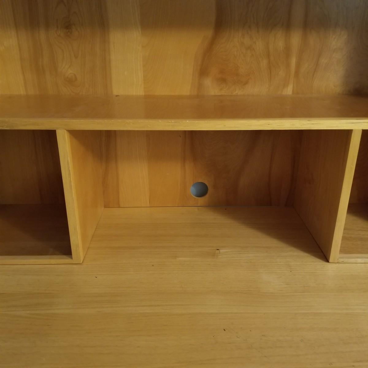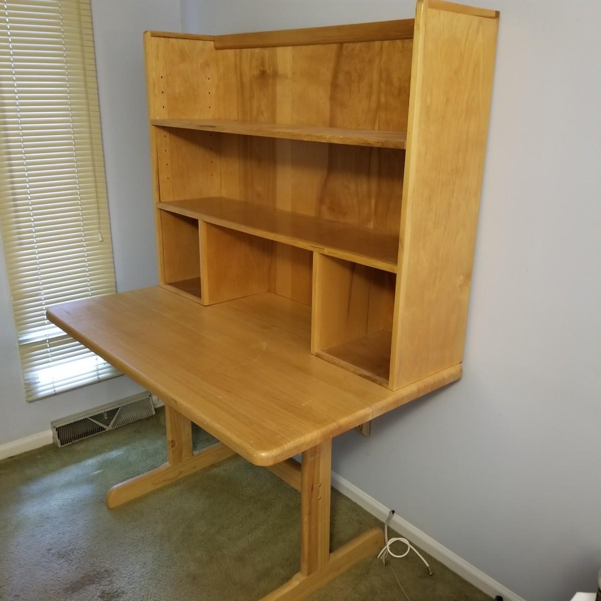 One maple colored desk with separate hutch top. Desk is pedestal style, hutch has openings for cable access, adjustable shelves. 50"x30"x66" with hutch. Desk height 29". Both are solid wood. See photos for details. Local pickup only, will need help to move.