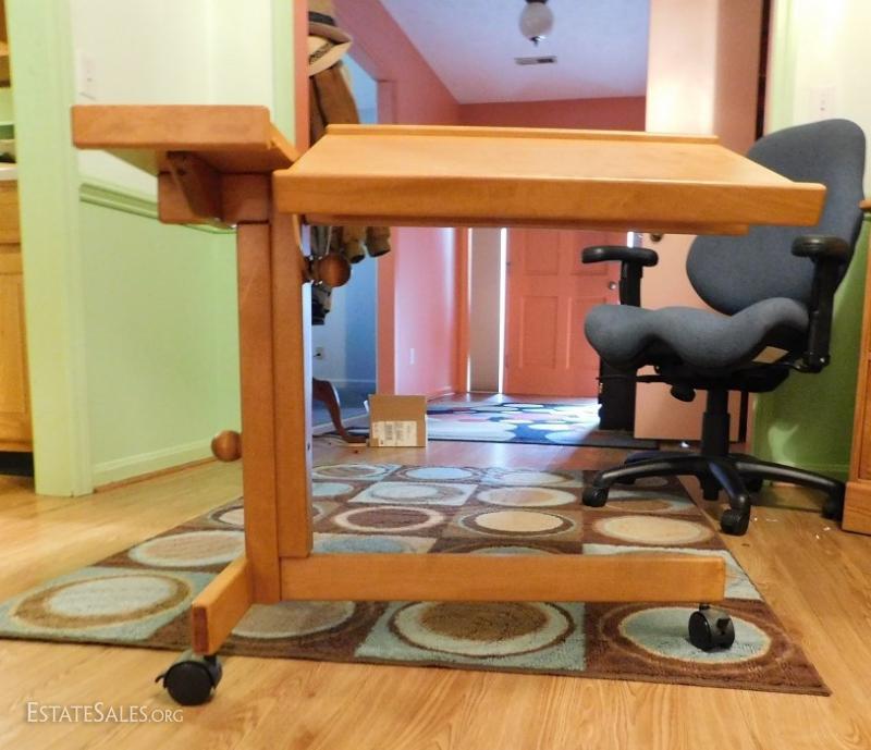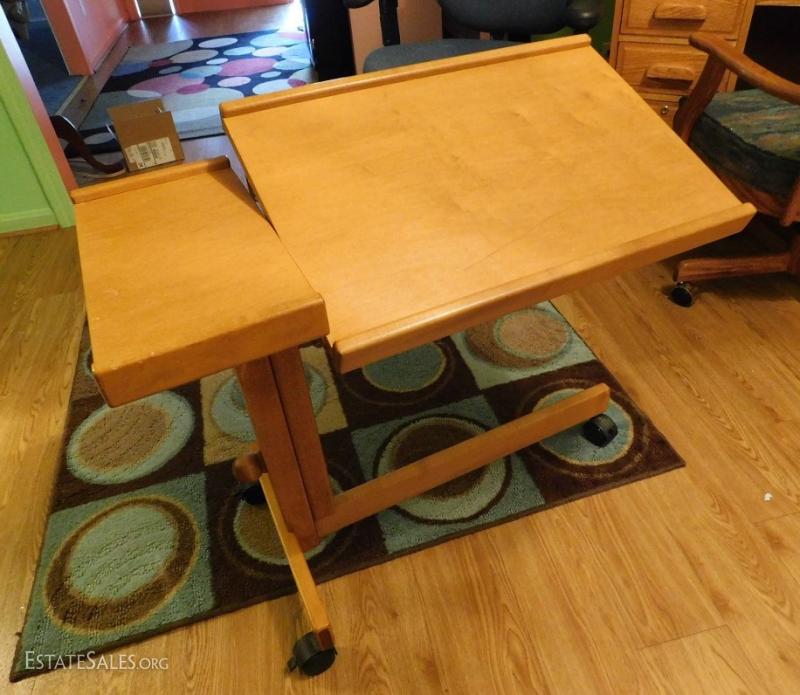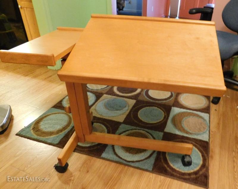 Very nice adjustable computer table fully mobile. Made of wood. Nice addition to the office or study. Very sturdy and built well.