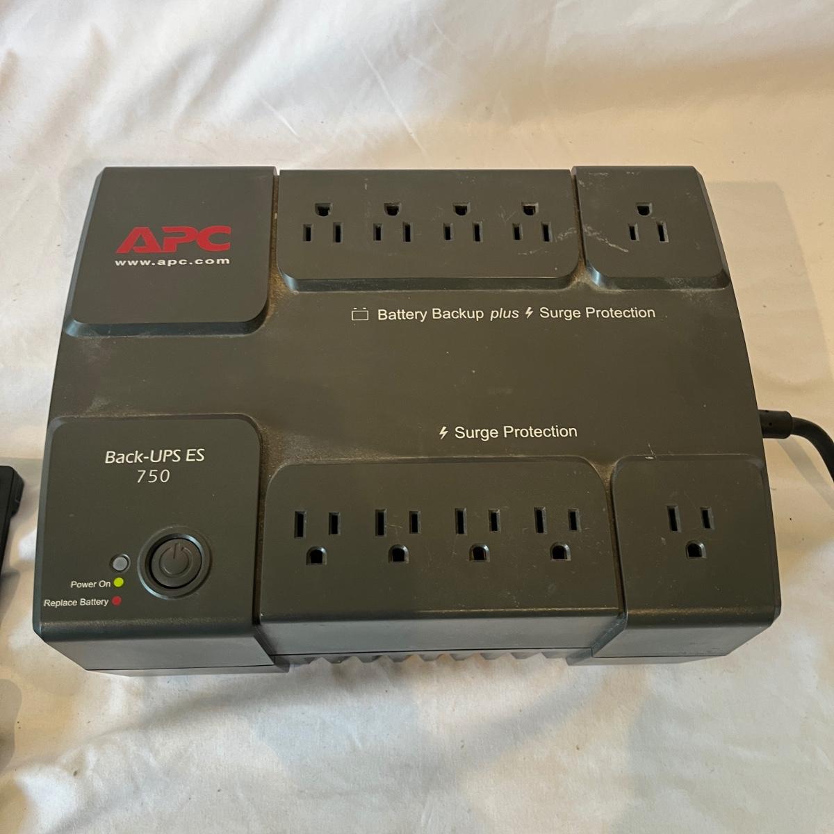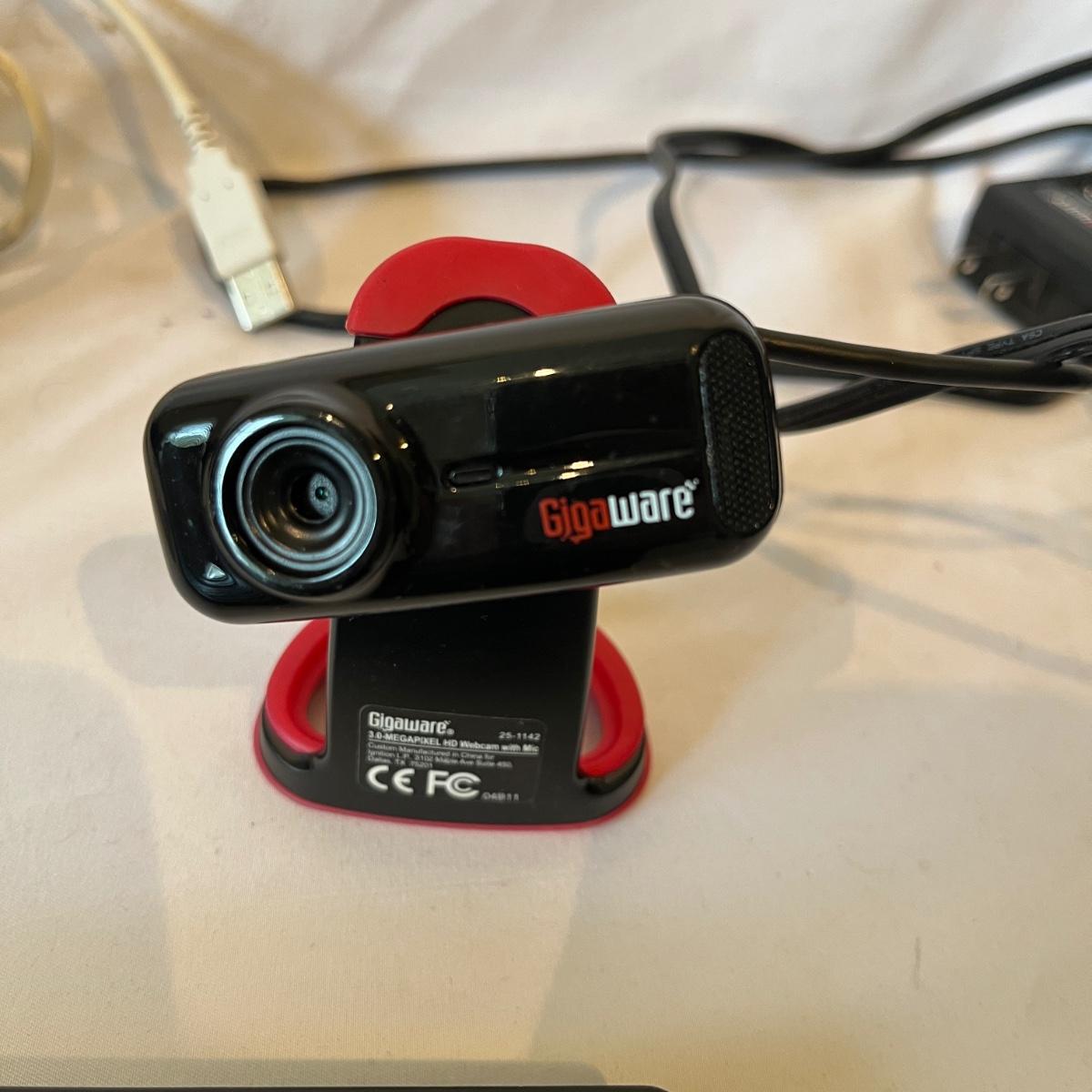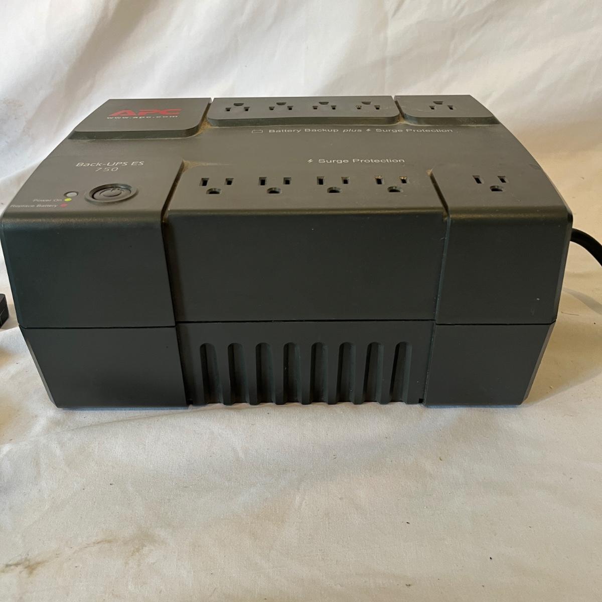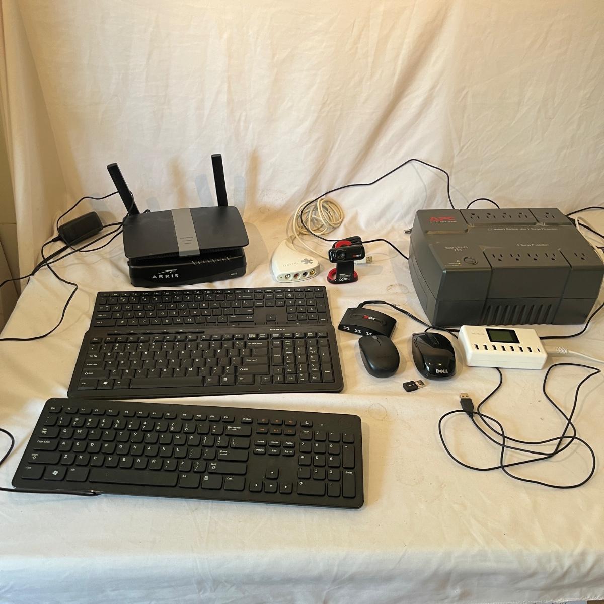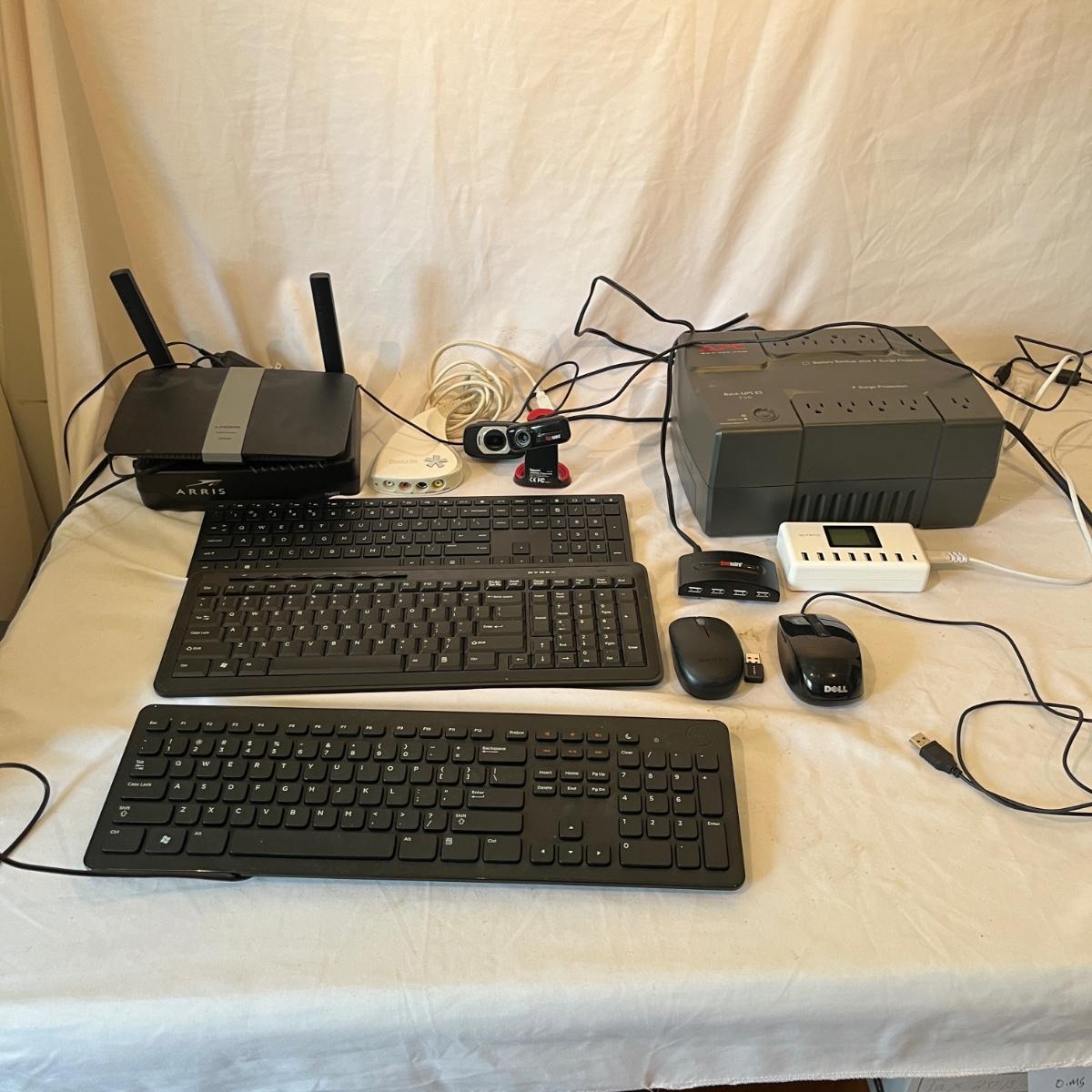 Lot includes a APC battery backup, two cordless keyboards Linksys and Arris routers, Gigaware camera and USB port, Logitech computer camera, and more APC battery backup measures 11” x 8” x 5”H and appears to need new battery. Both routers powered on when plugged in.