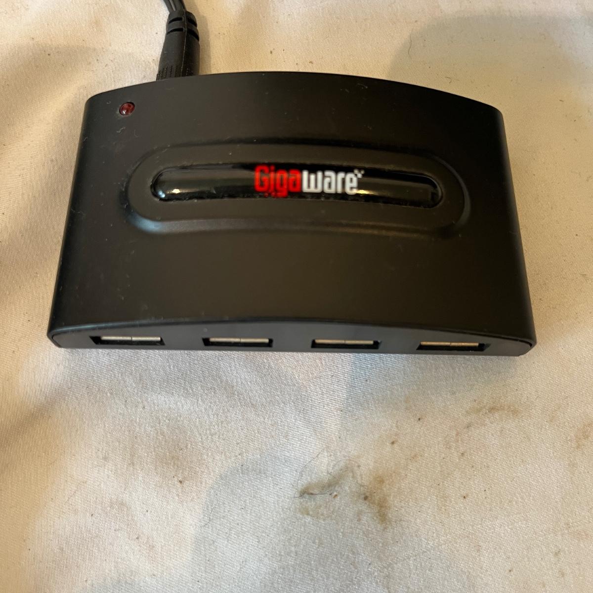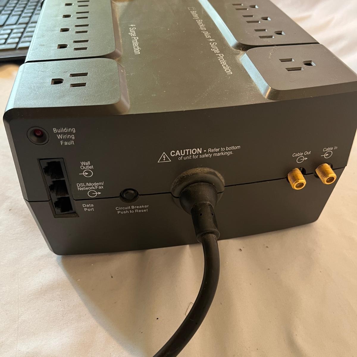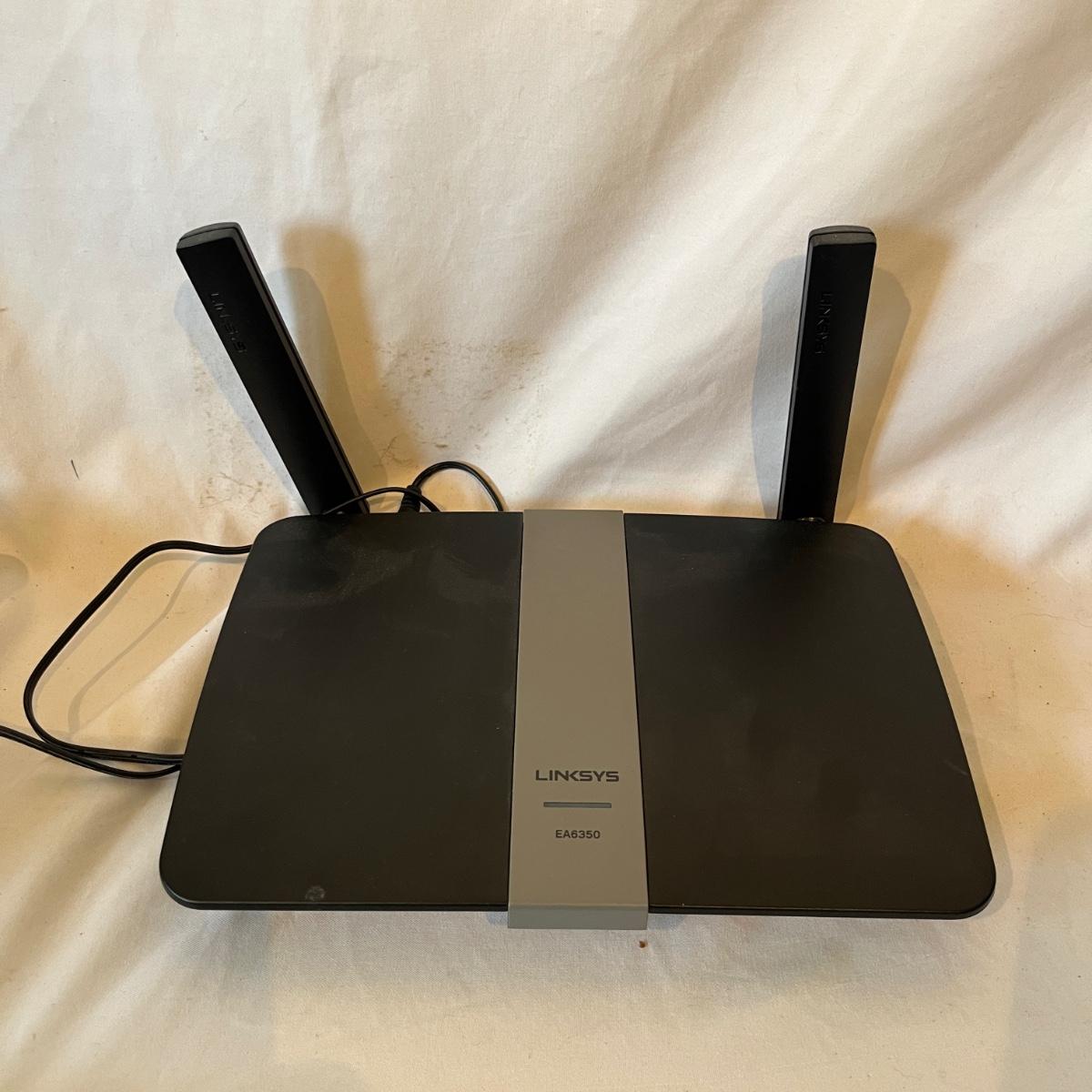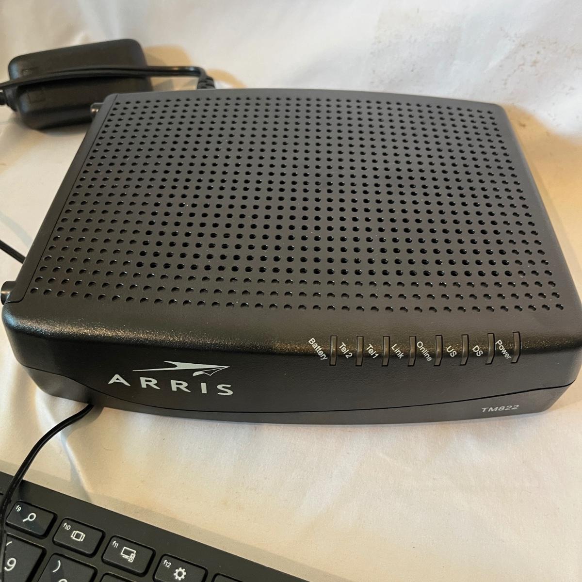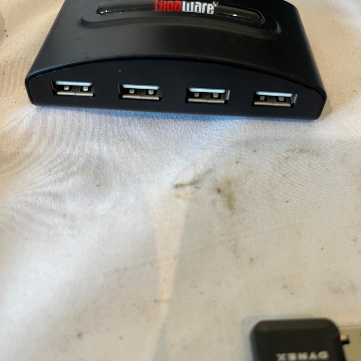 Lot includes a APC battery backup, two cordless keyboards Linksys and Arris routers, Gigaware camera and USB port, Logitech computer camera, and more APC battery backup measures 11” x 8” x 5”H and appears to need new battery. Both routers powered on when plugged in.