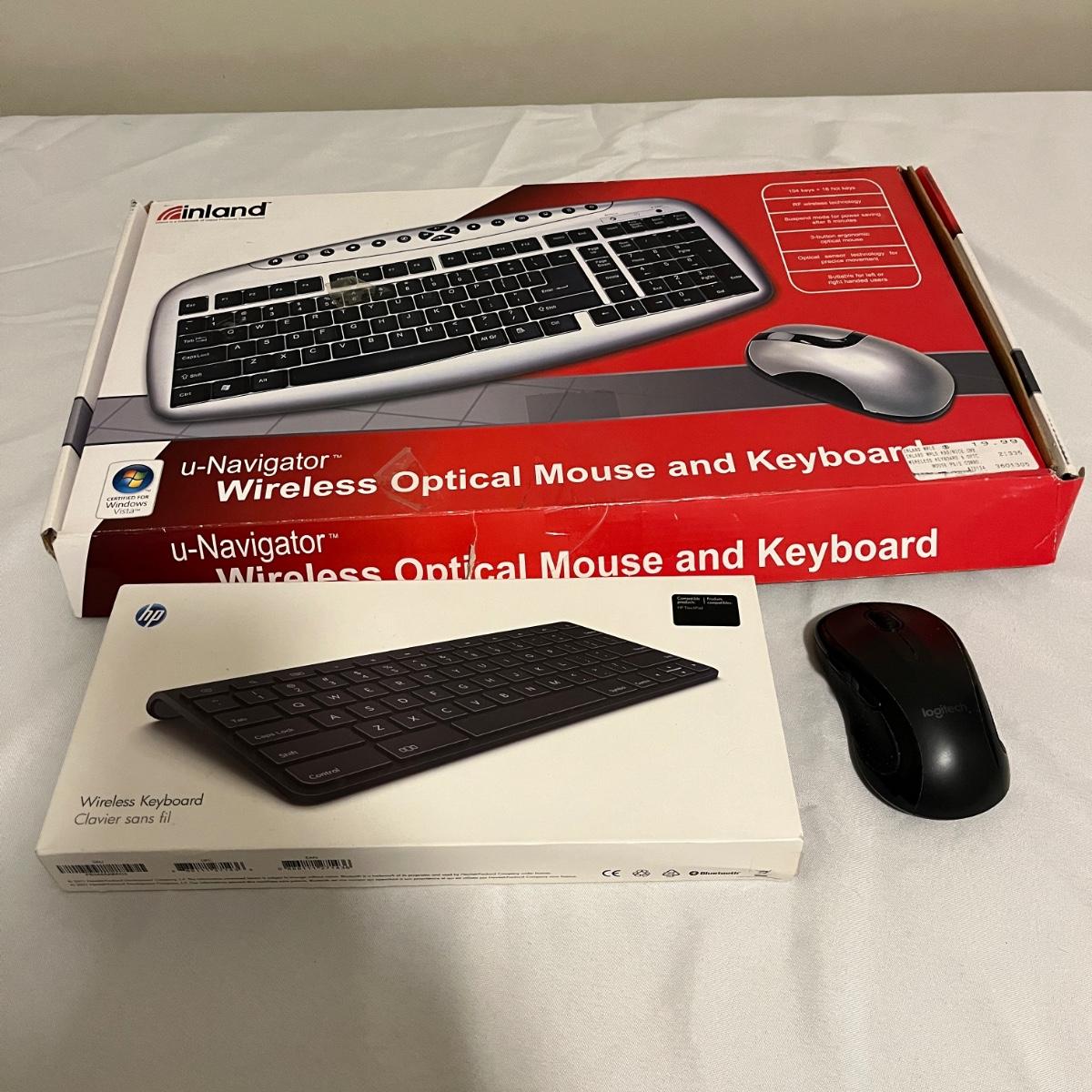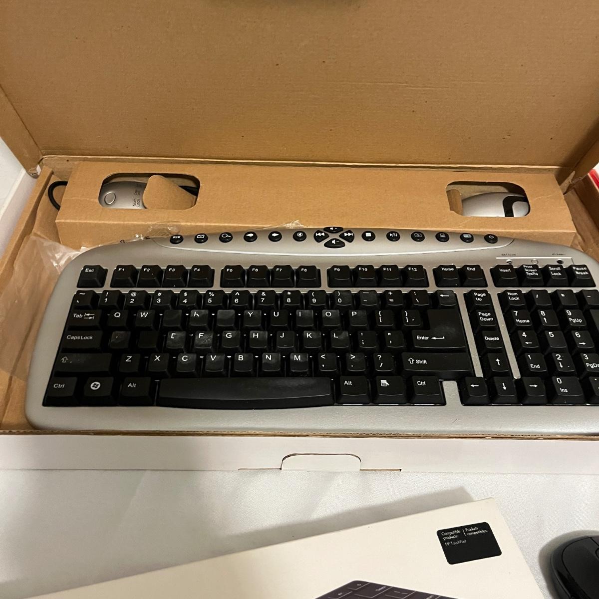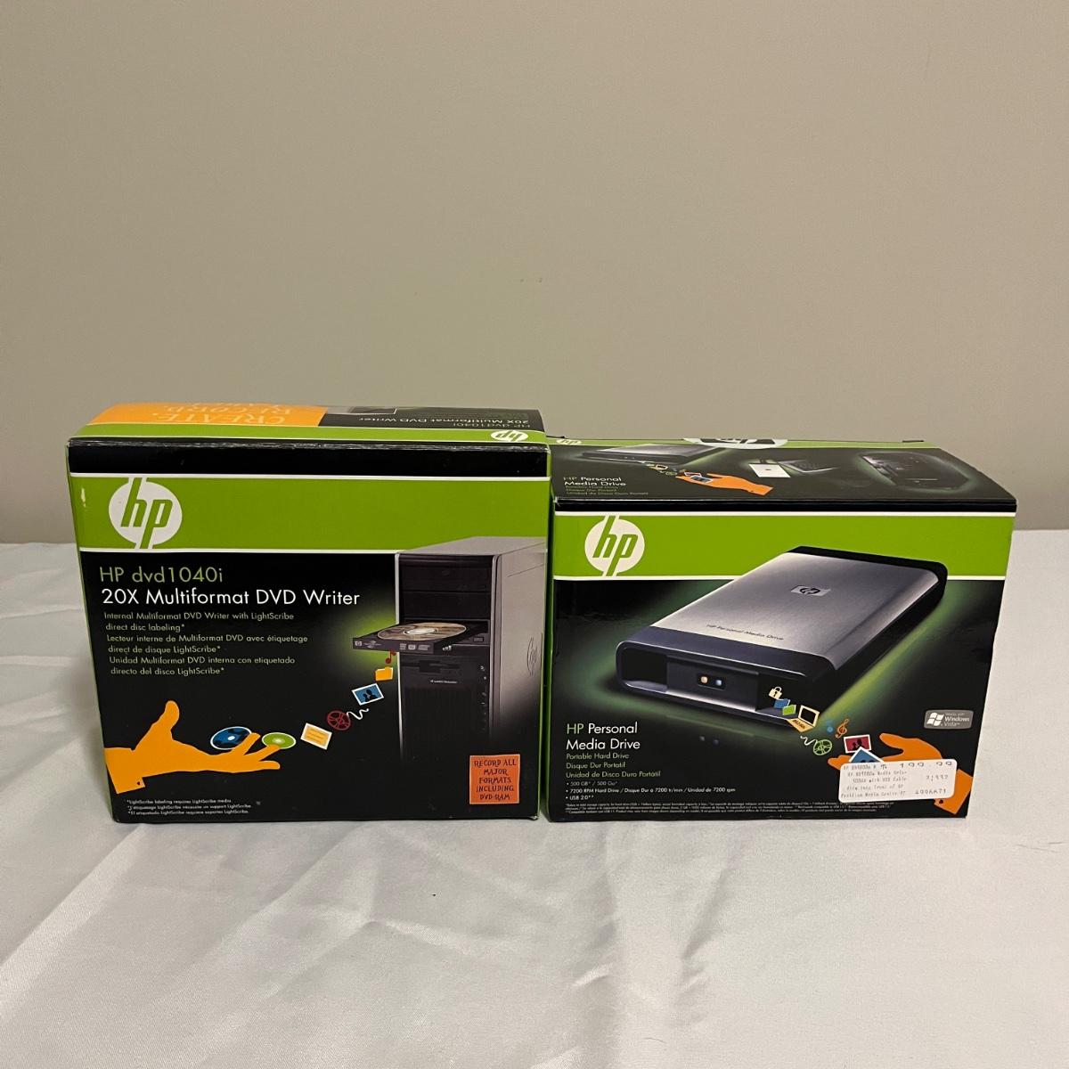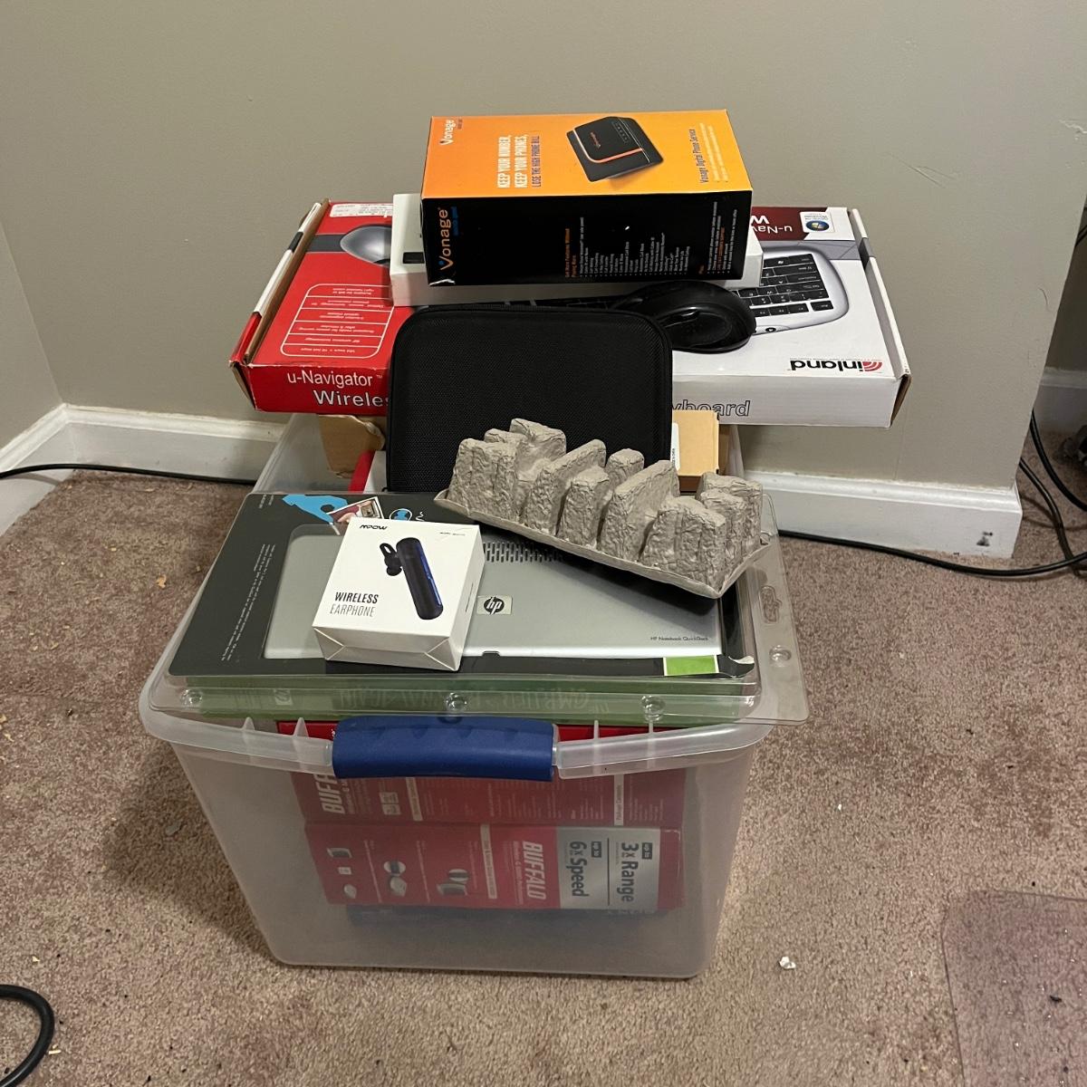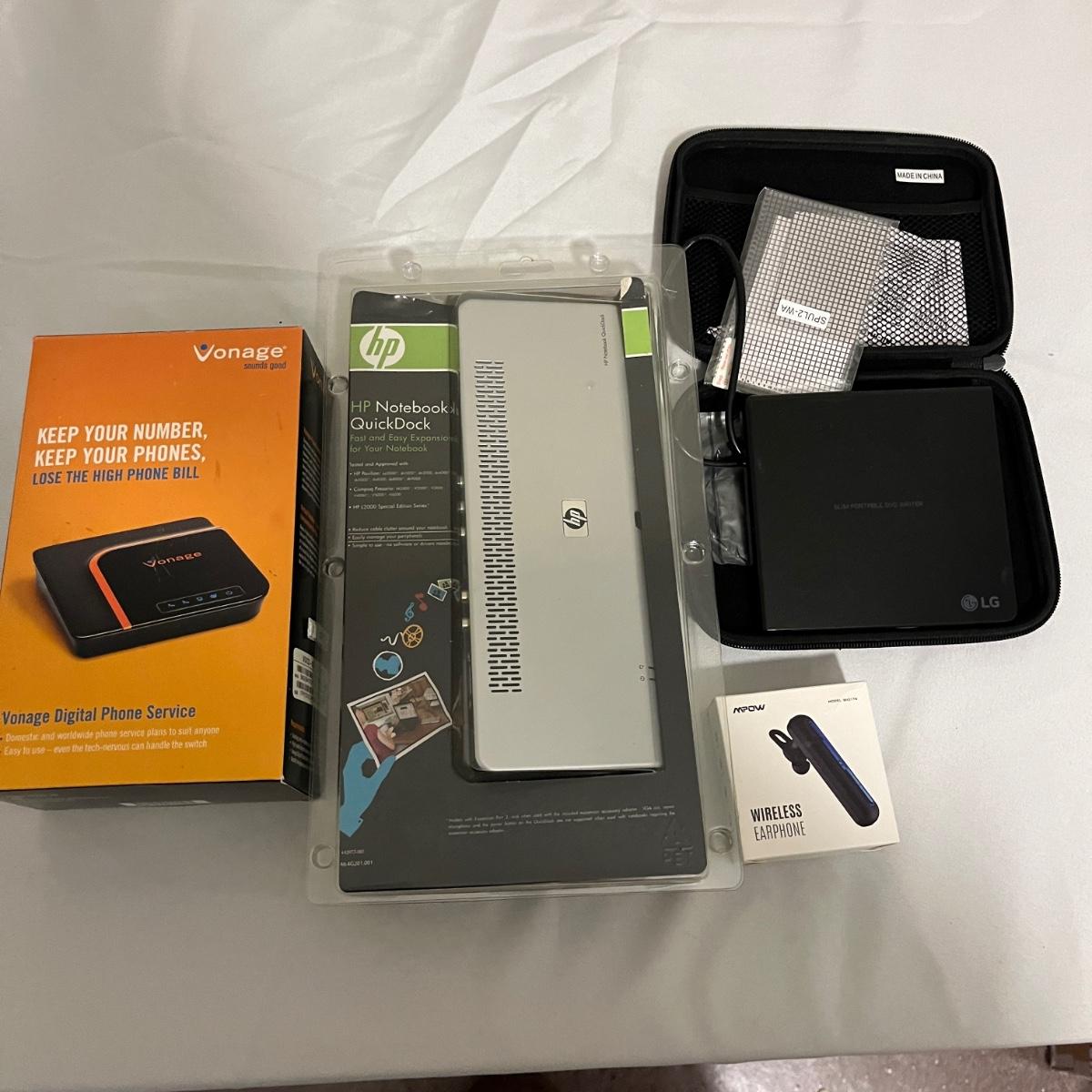 Lot includes HP portable hard drive, notebook quickdock, wireless keyboard and DVD writer, Buffalo router and Ethernet converter, Vonage digital phone service, Inland wireless keyboard and more. No items were tested.