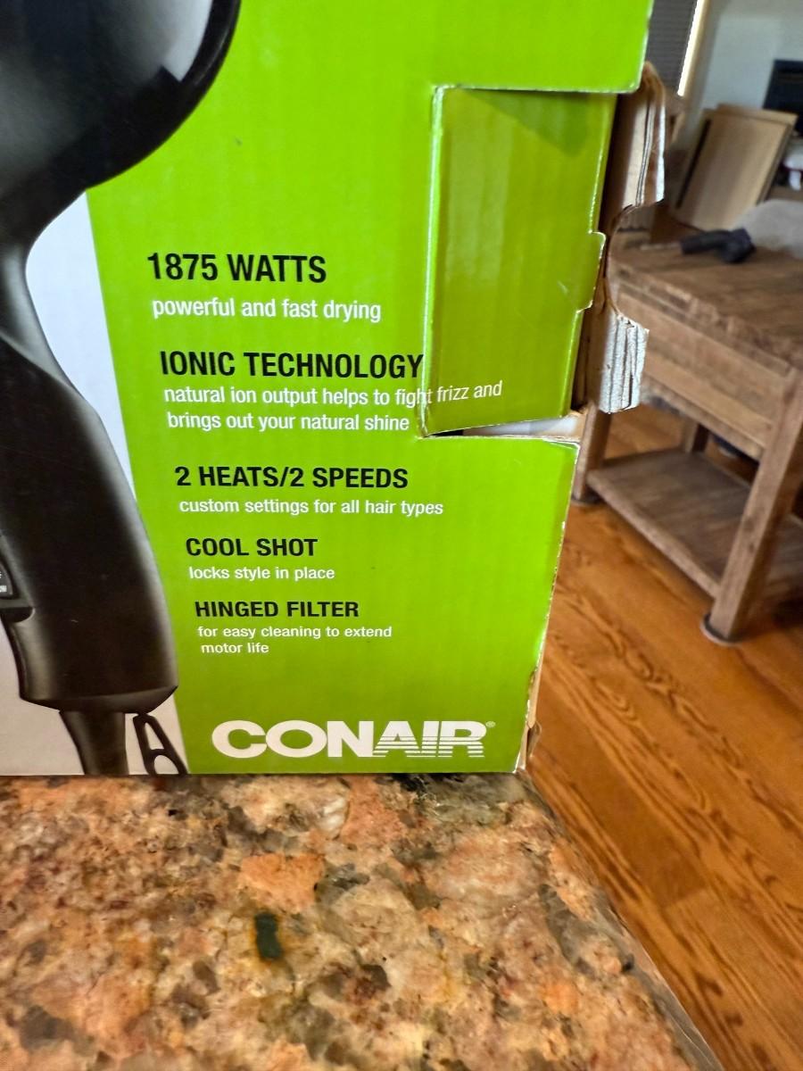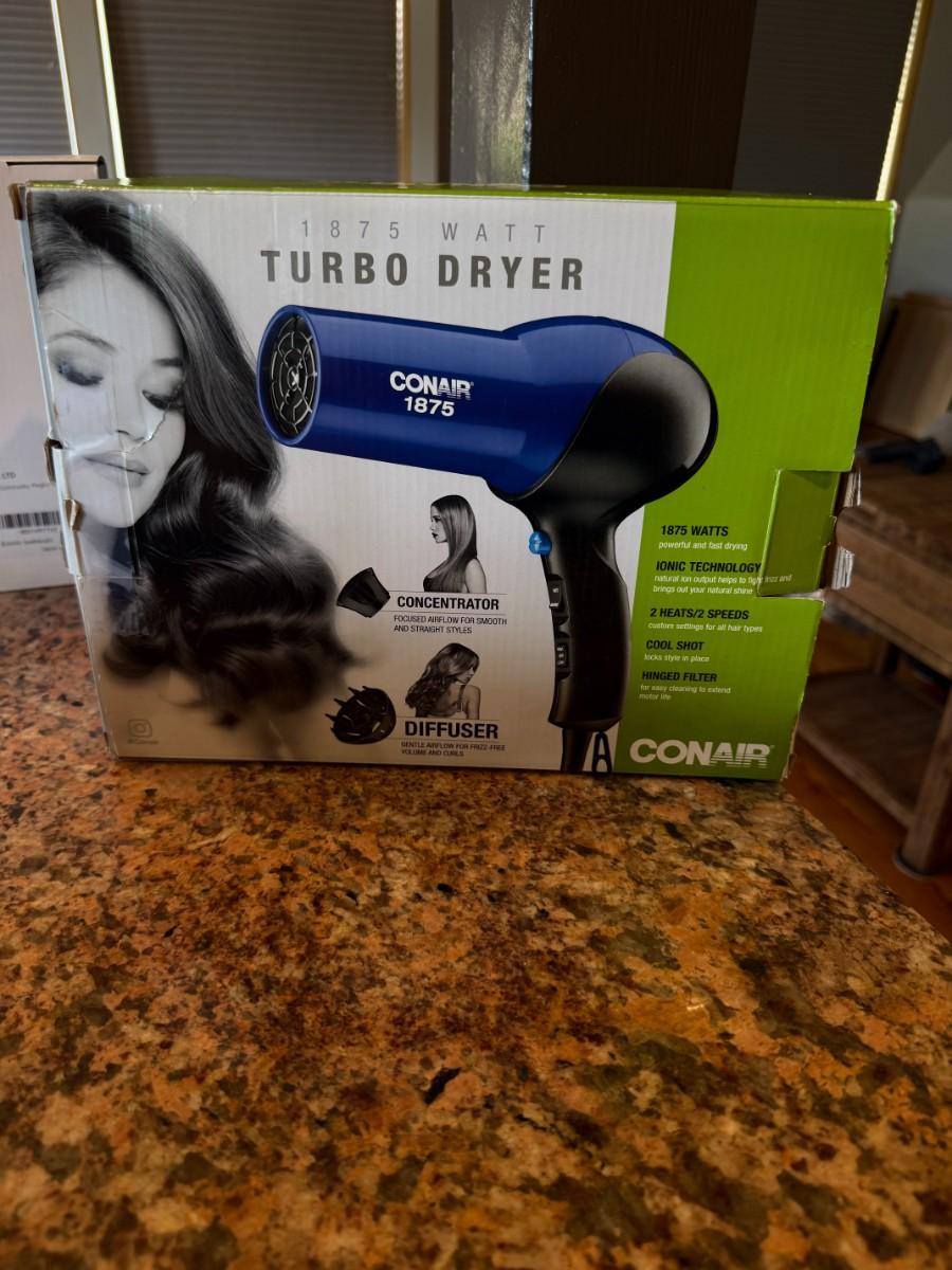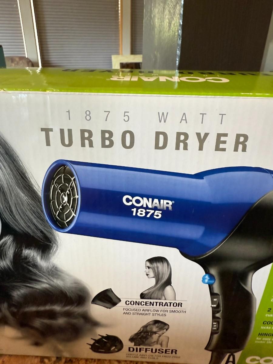 Powerful and compact, this Conair 1875 Turbo Dryer features ionic technology for smoother, shinier hair and faster drying. Comes brand new in original box with attachments included.