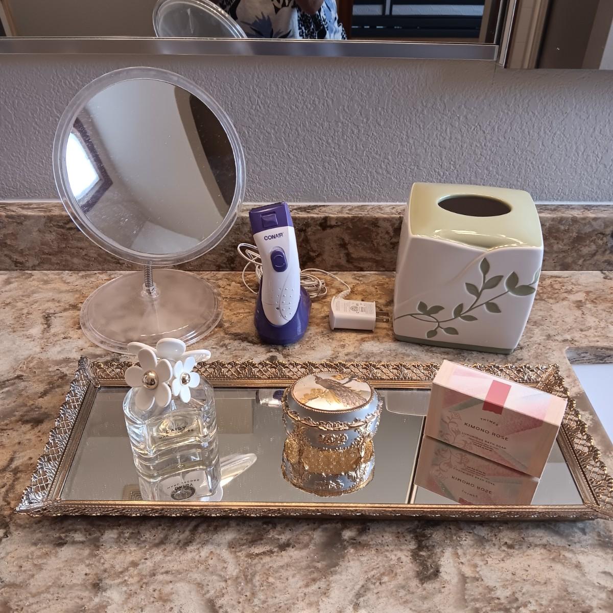 CONAIR ELECTRIC SHAVER, DRESSER MIRROR, MUSICAL TRINKET BOX AND MORE