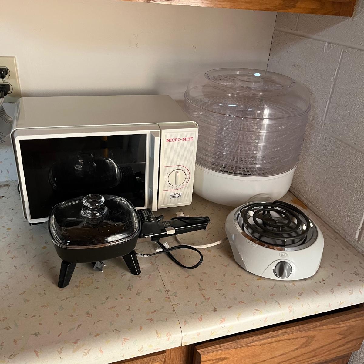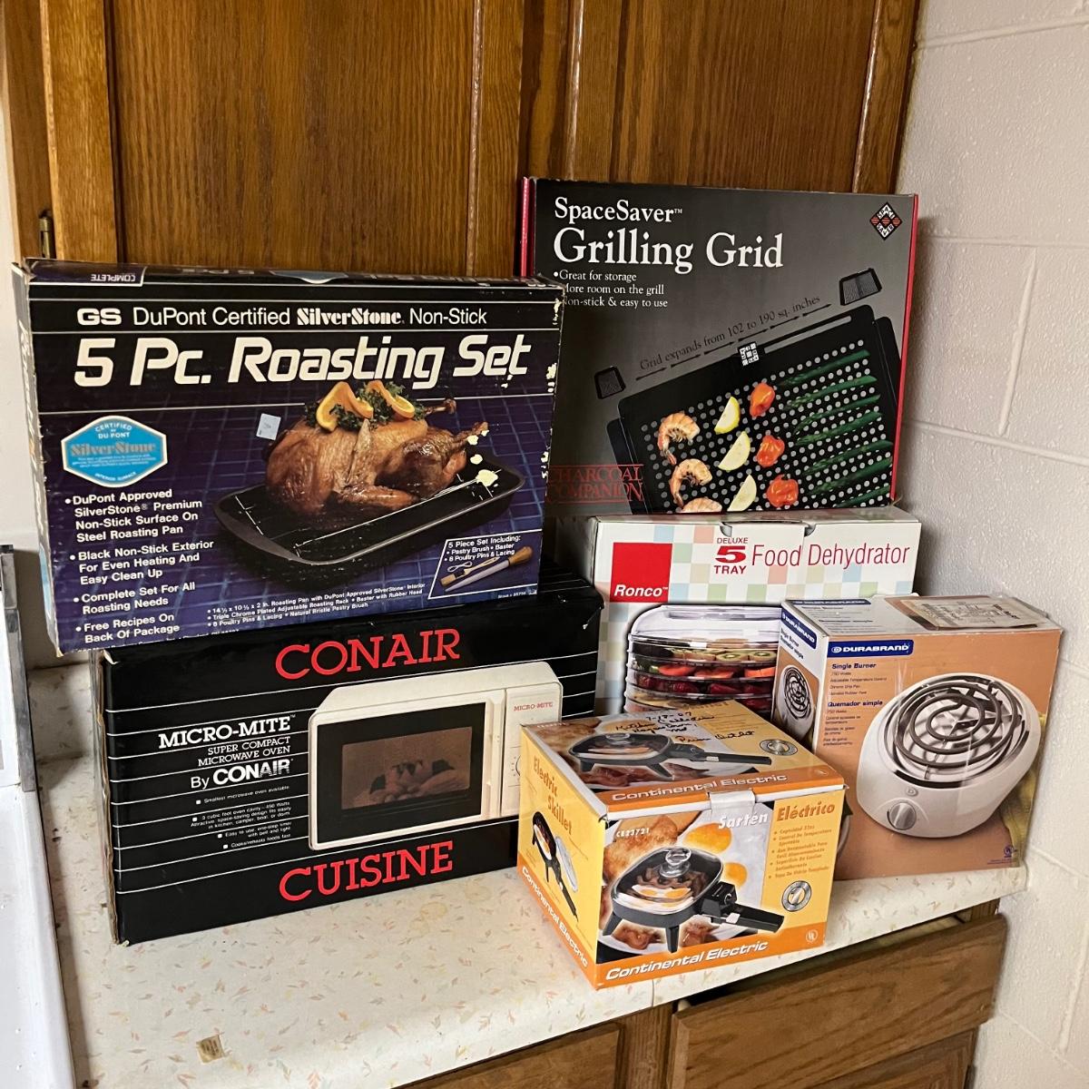 Lot includes a Conair microwave, Ronco food dehydrator, Dura Brand single burner, Continental electric skillet, five piece roasting and grilling grid that is missing bolt to adjust size. Microwave measures 9.5” x 15.5” x 9.5”. Items come with boxes and no items were powered on.