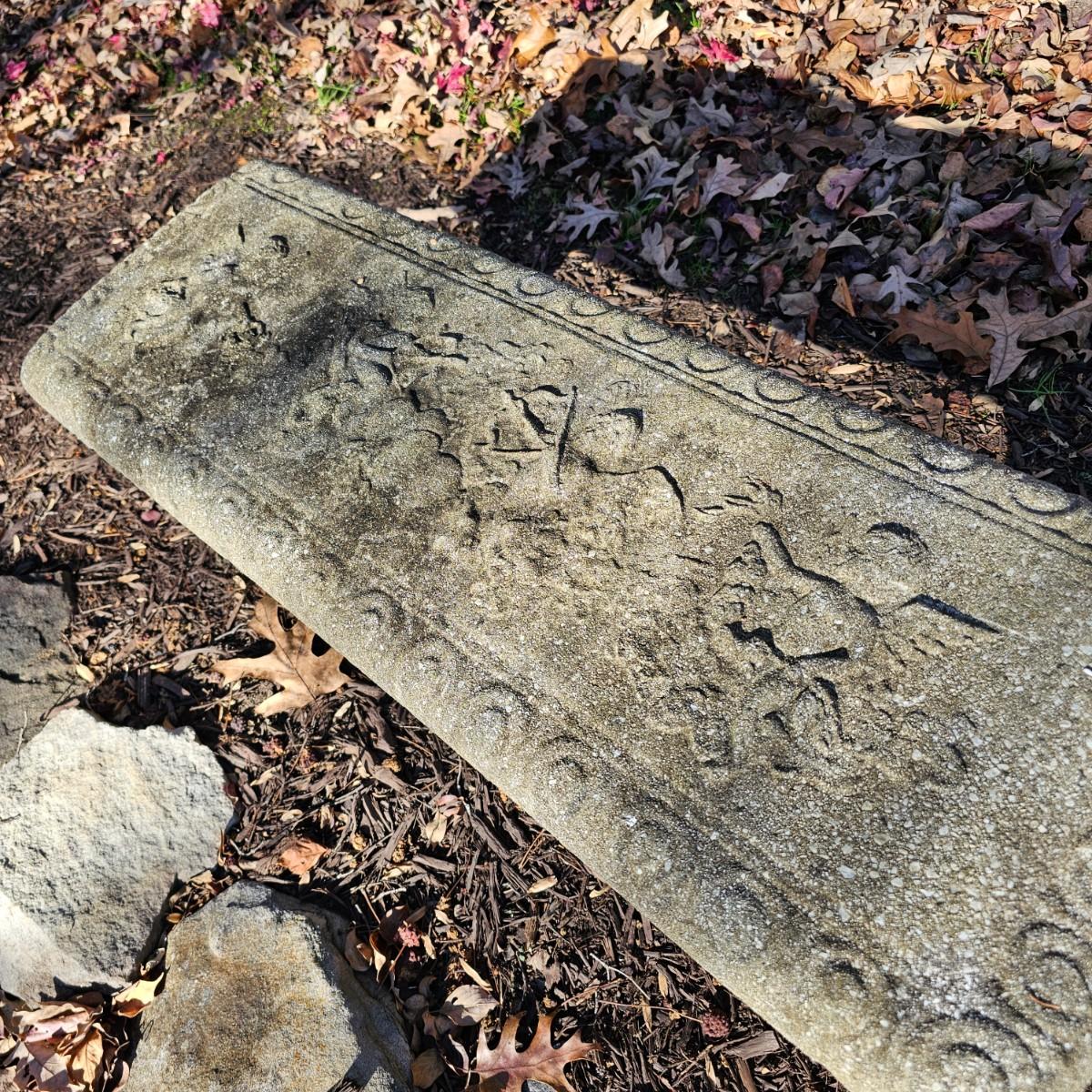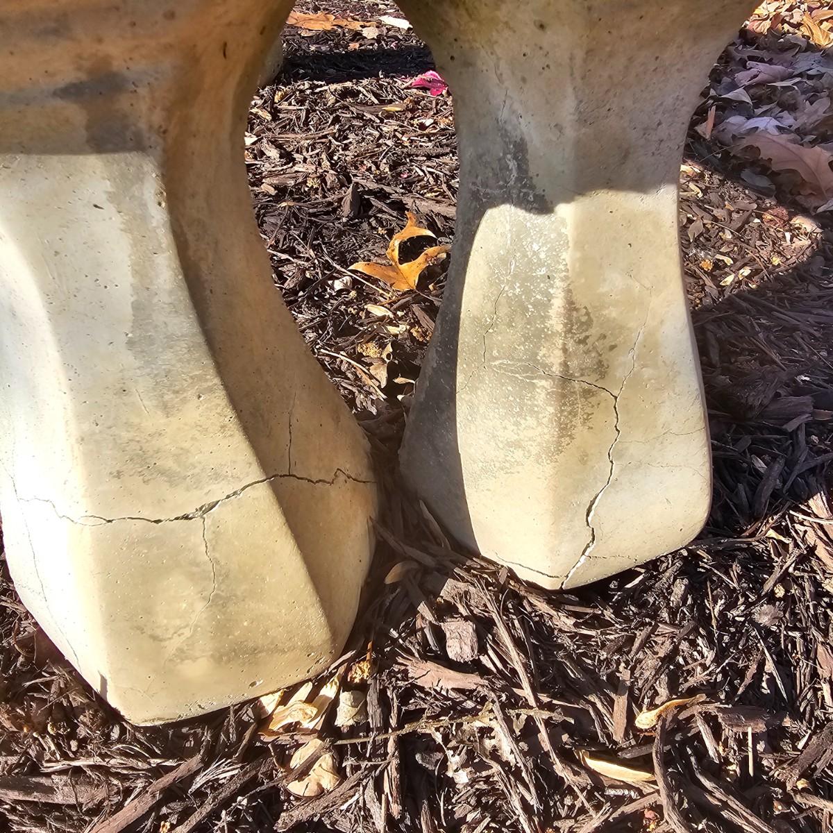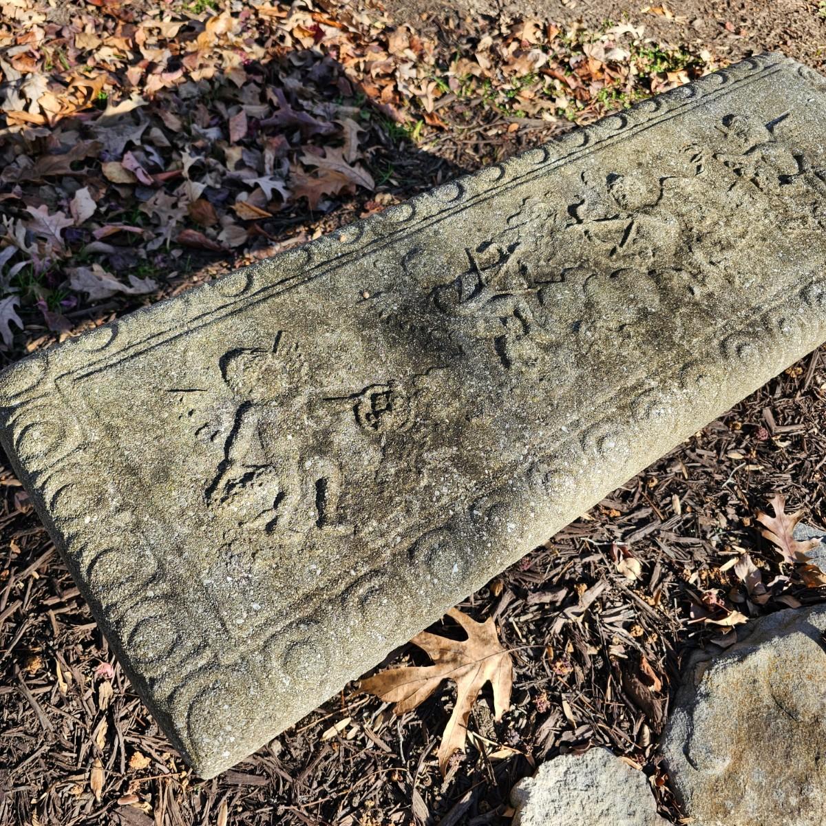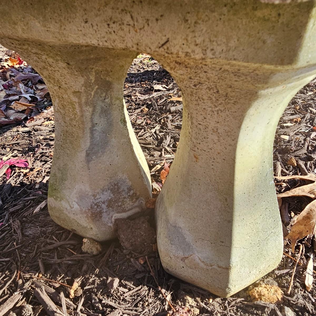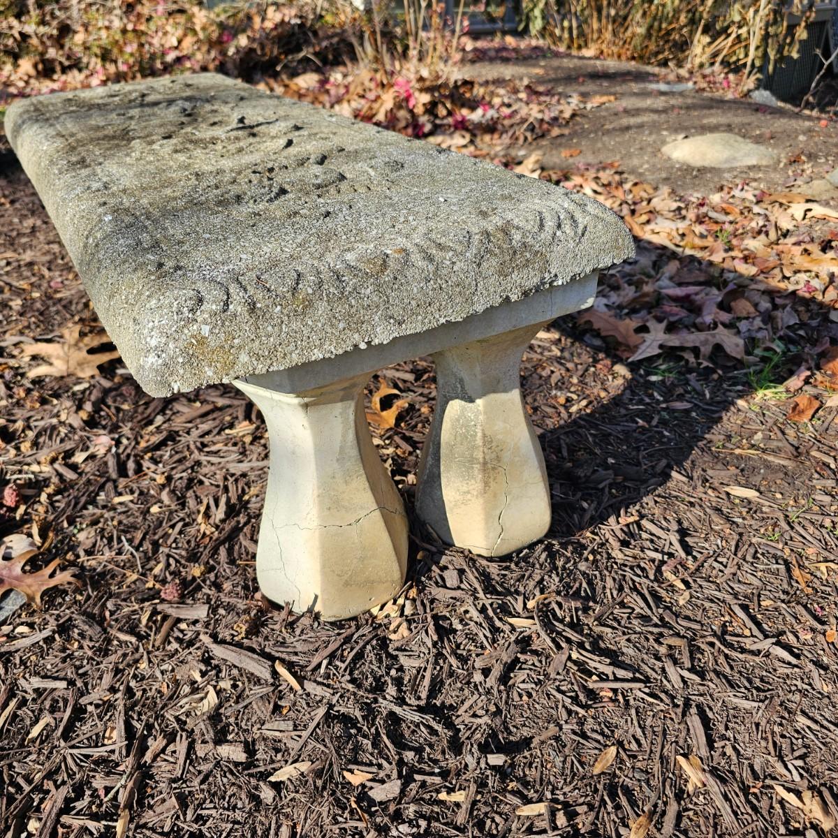 Figures of angels dance across the seat area of this outdoor concrete bench. Scalloped/decorated edges, twin pedestals on each end. Bench measures 40" x 13.5" x 13"H, also seat height. Pedestals have some cracks near their bases, and normal weathering on rest of pieces. See photos for details. Local pickup only. Winning bidder must bring assistance to help move and load this item due to its weight and/or size.