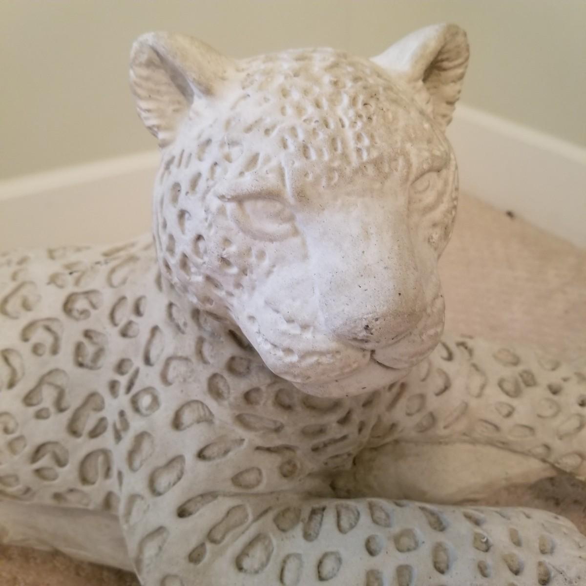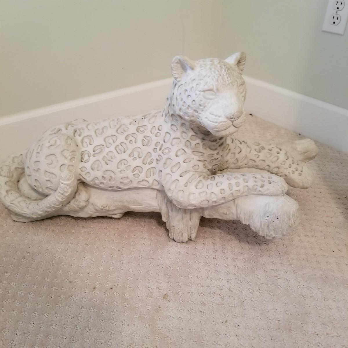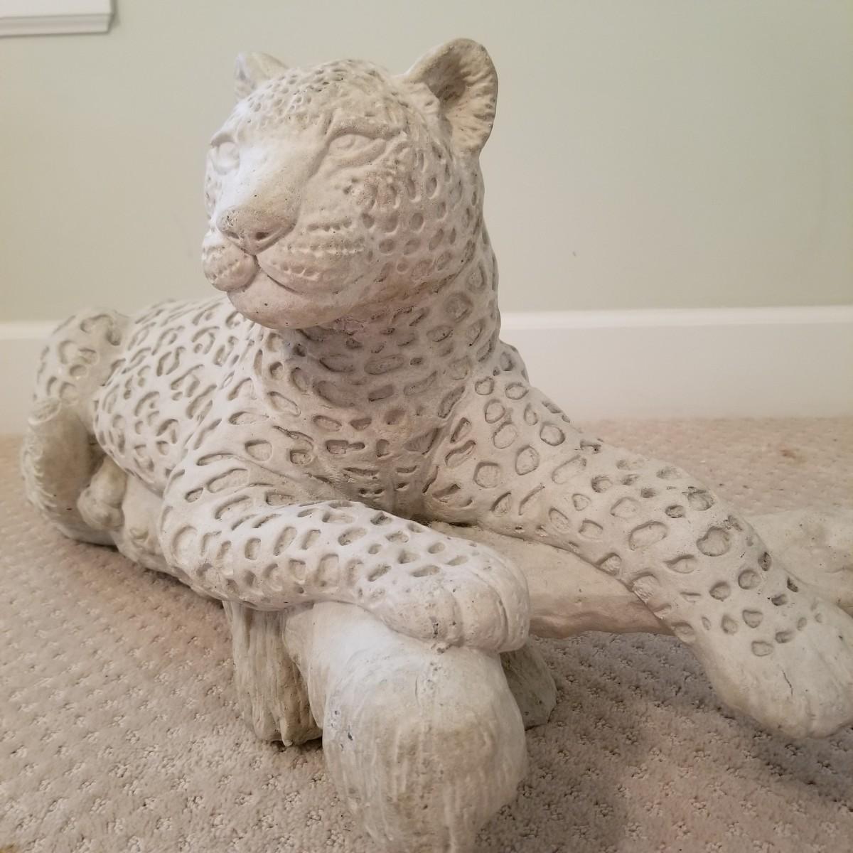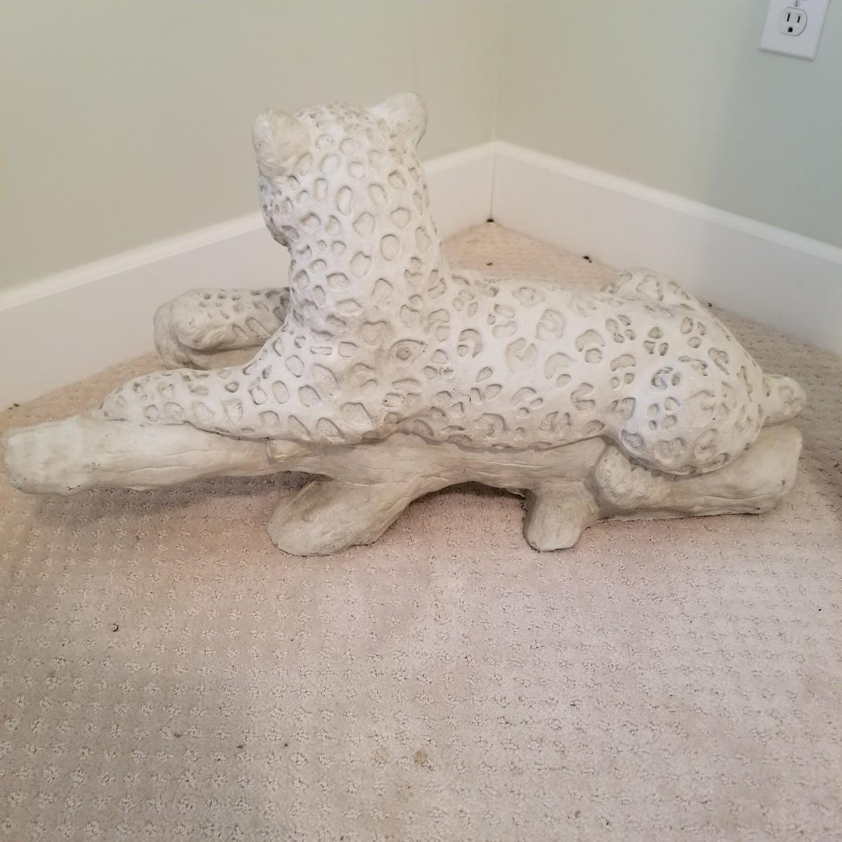 A nice patterned sculpture of a cheetah on a log. Spotted areas are relief imprinted into piece. Uniform grey/off white coloring. Piece measures 27"x12"x15". See photos for details. Local pickup only, this piece is very heavy and will need assistance to move, is in basement room.