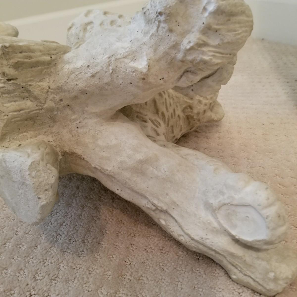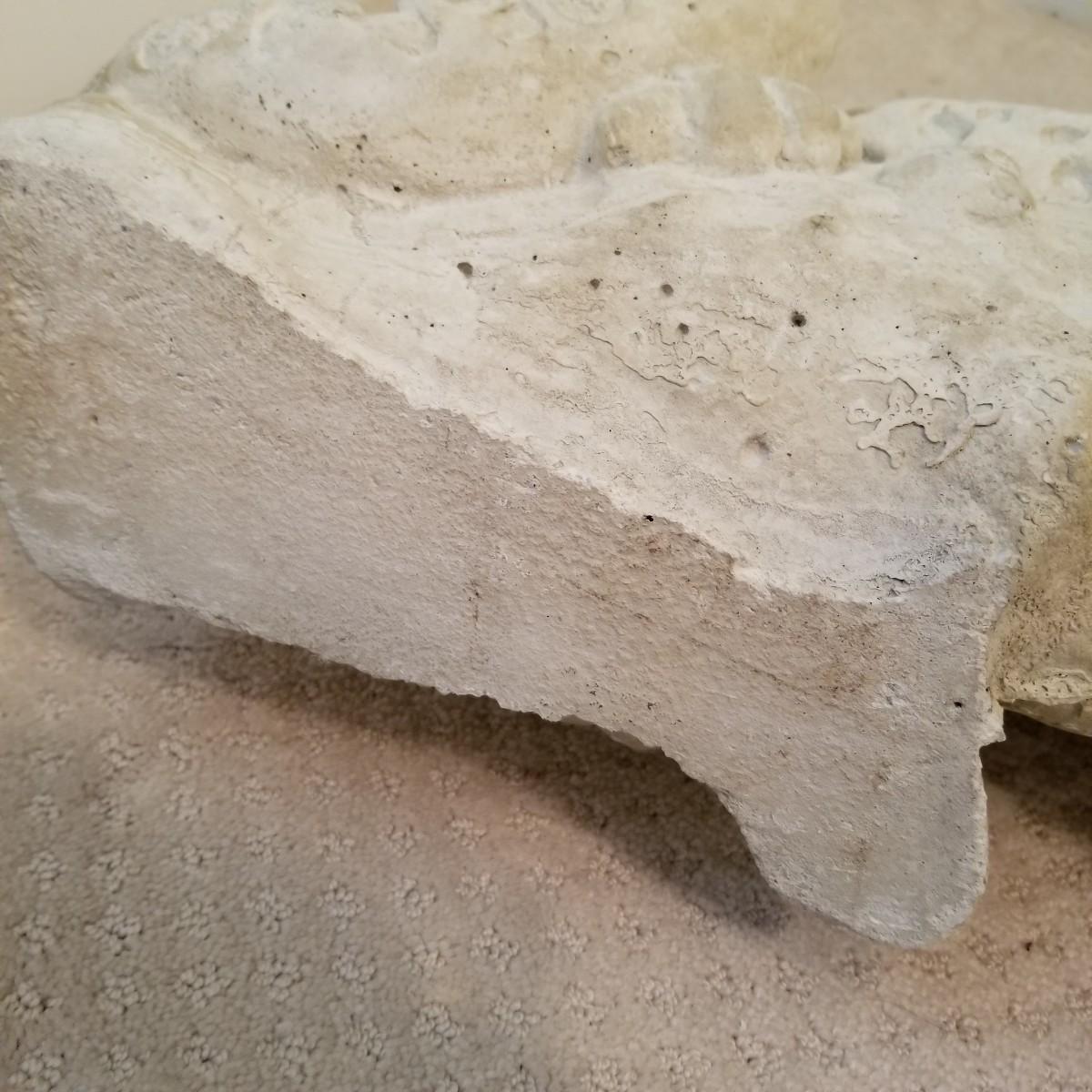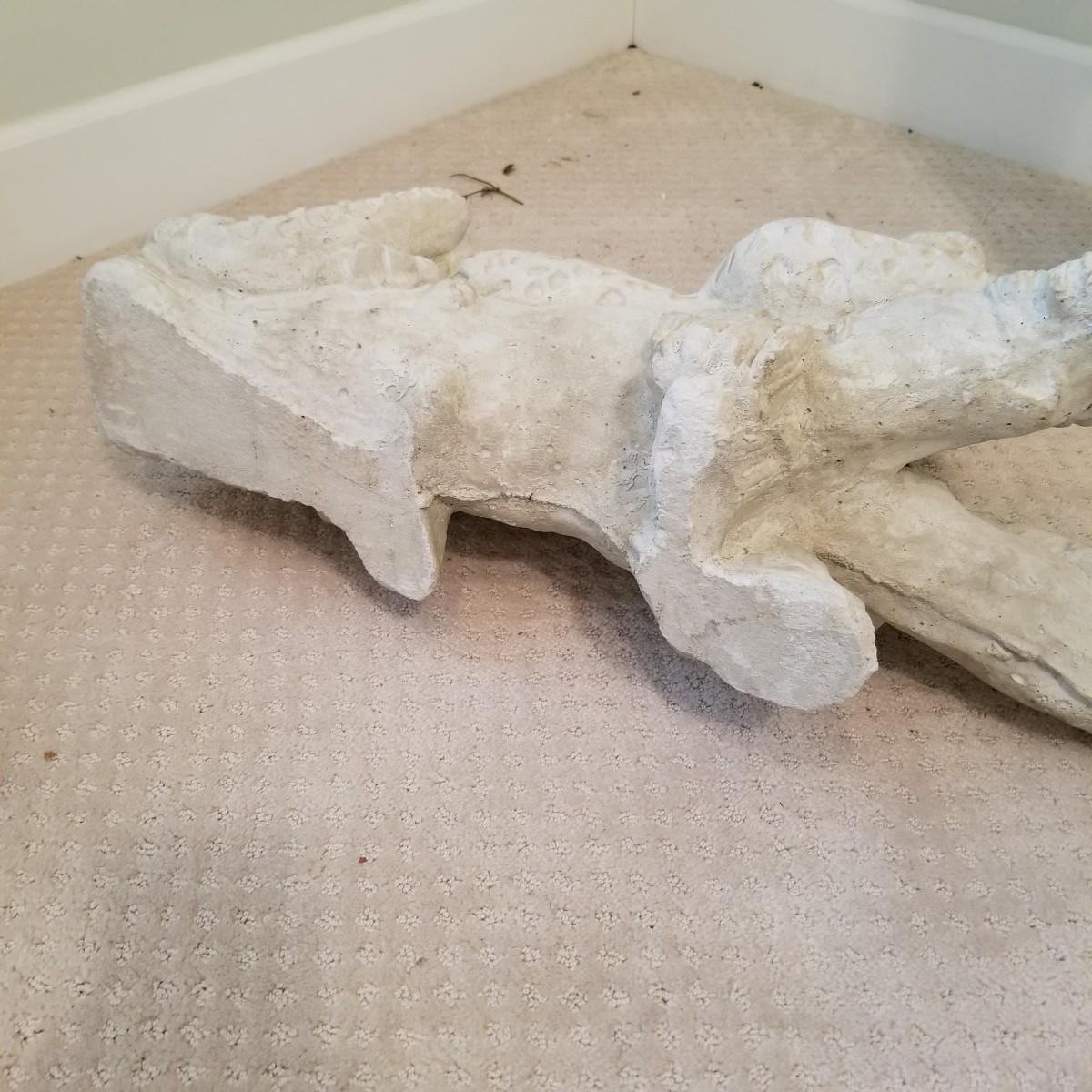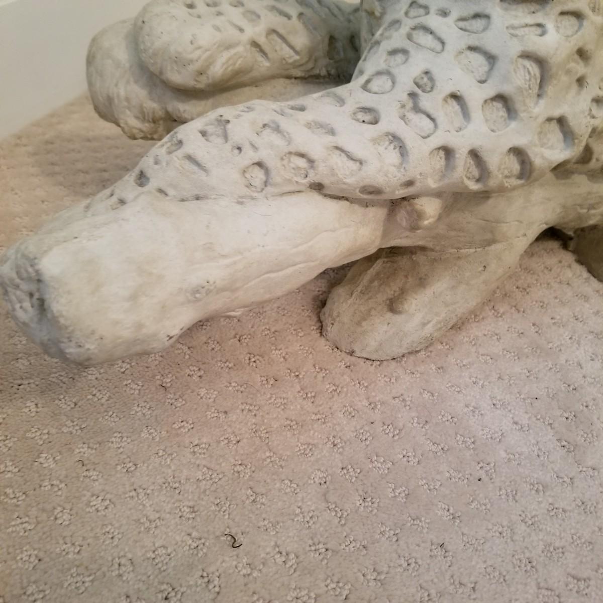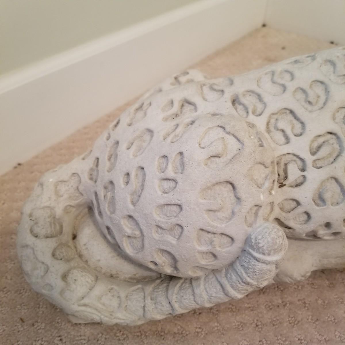 A nice patterned sculpture of a cheetah on a log. Spotted areas are relief imprinted into piece. Uniform grey/off white coloring. Piece measures 27"x12"x15". See photos for details. Local pickup only, this piece is very heavy and will need assistance to move, is in basement room.