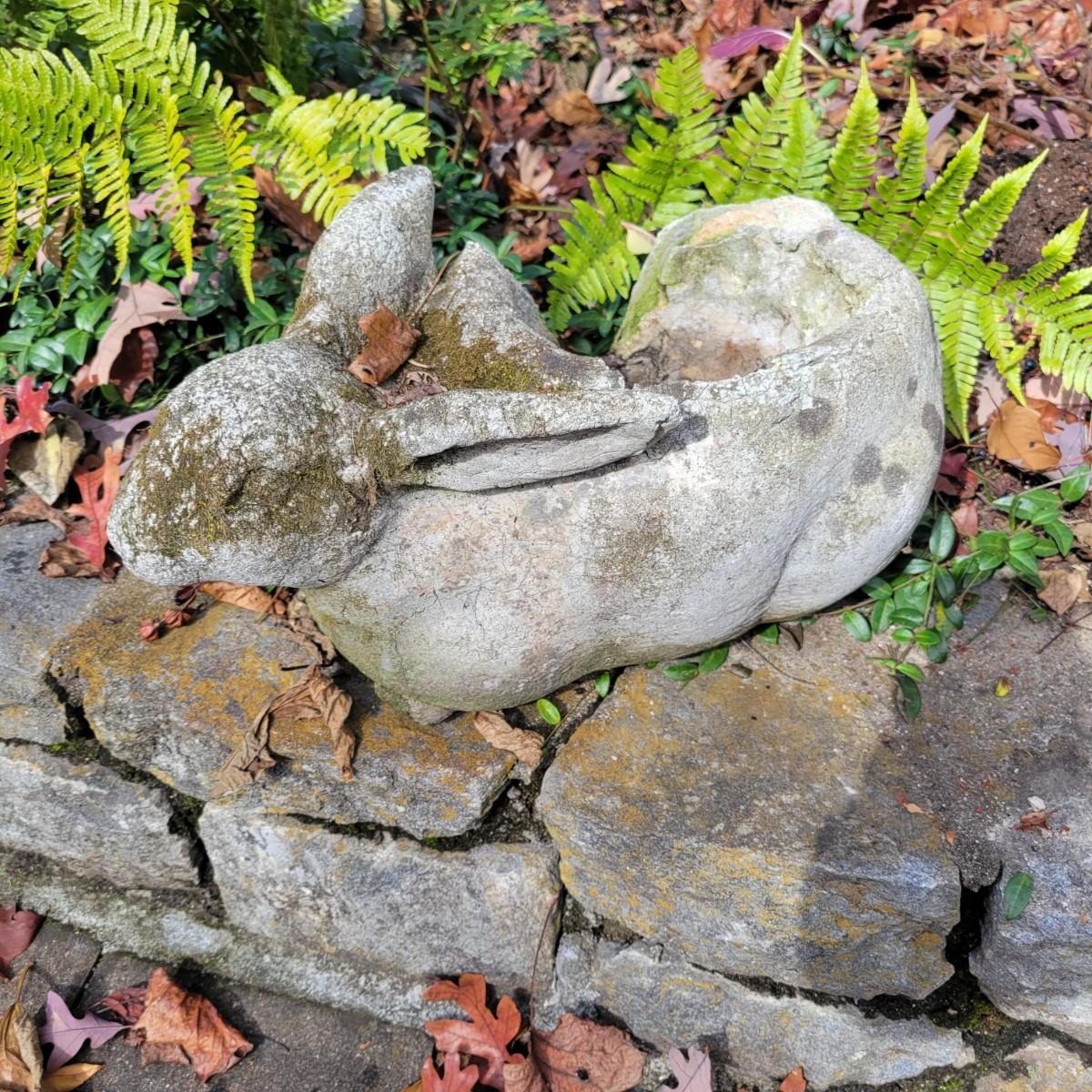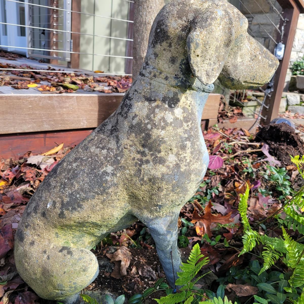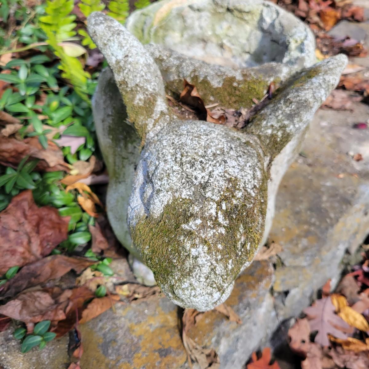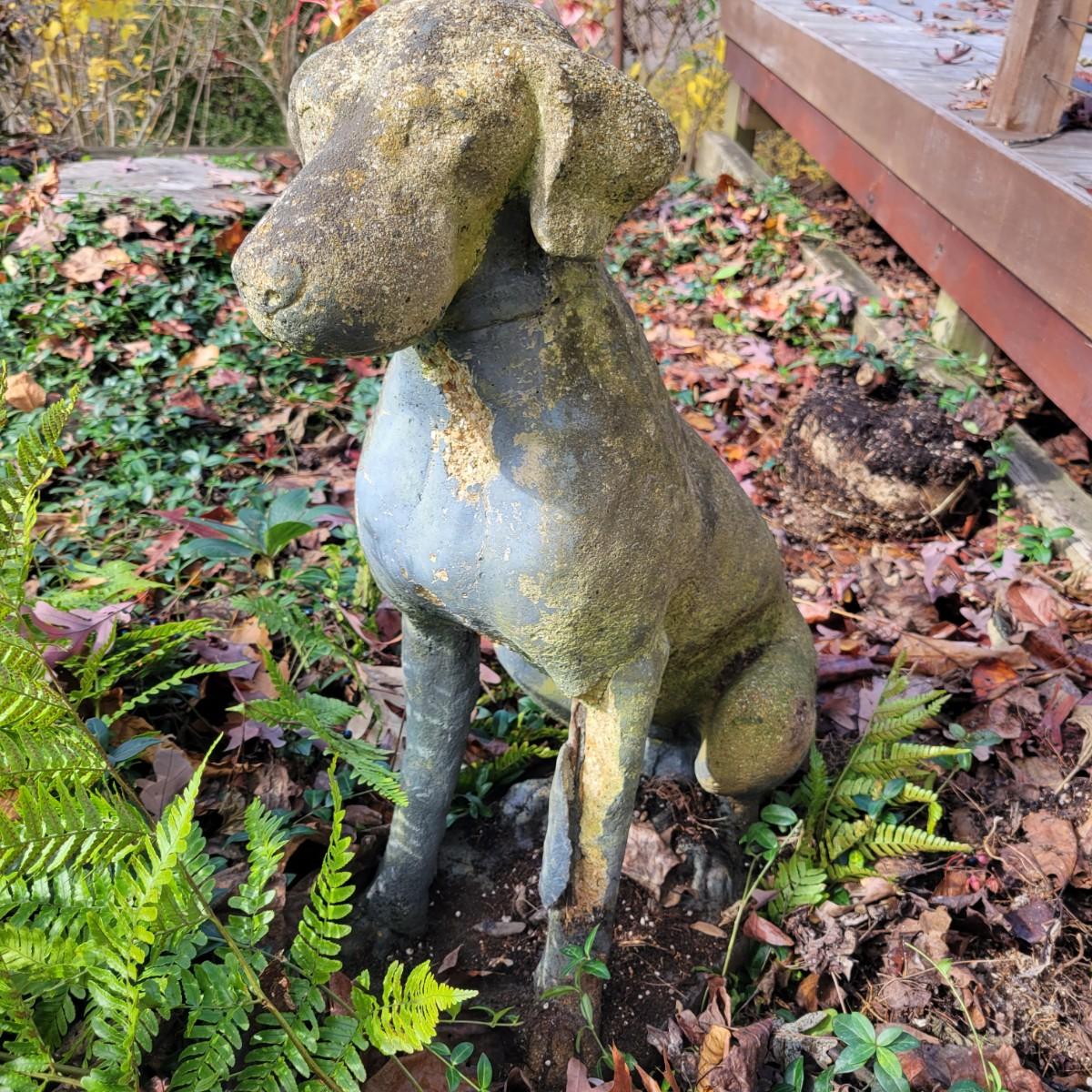 A concrete dog and bunny statue in fair condition with some notable damage. The bunny has a notable section missing from one side, bit can still be a unique planter for one's yard. The dog has a large crack in one forearm that has exposed its steel internal support. Overall, still in very usable condition. Dog measures approximately 20" x 10" x 27". Local pickup only. Winning bidder will need to bring assistance to move as piece is substantial.