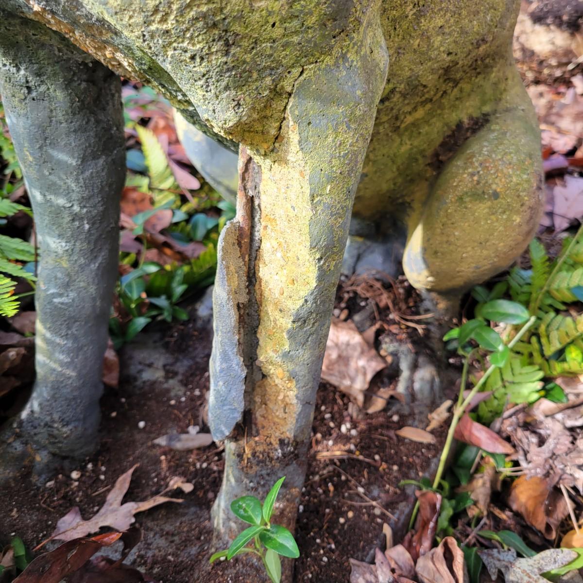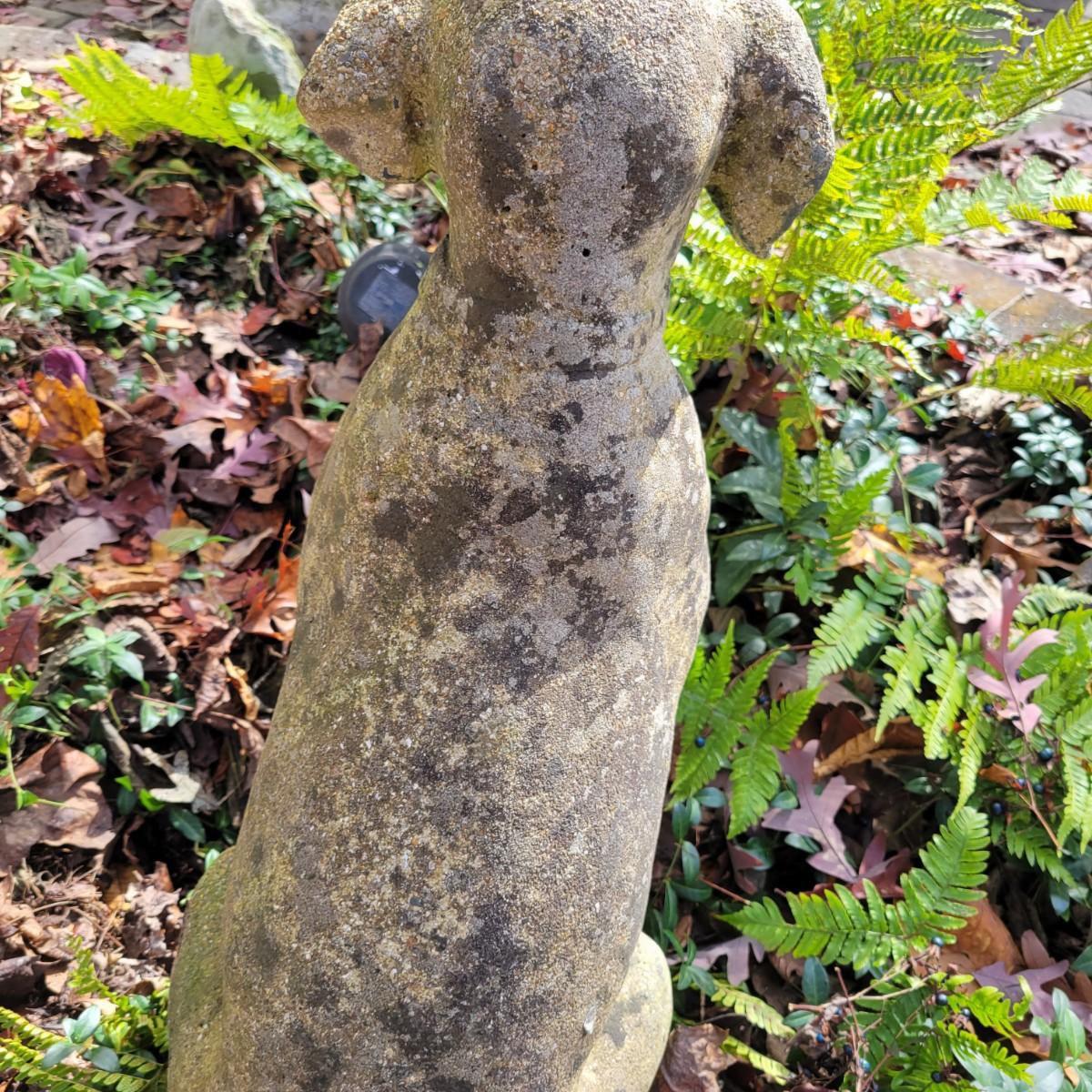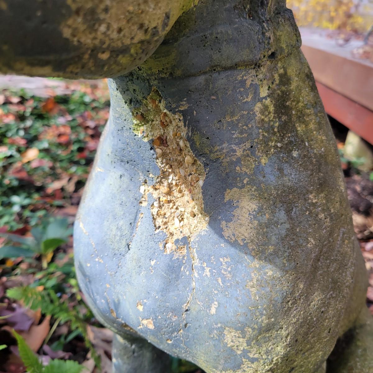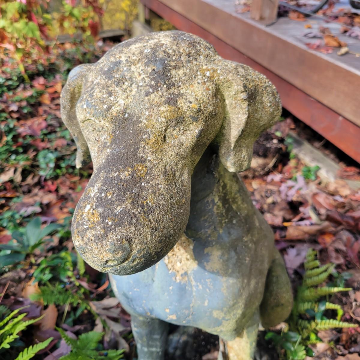 A concrete dog and bunny statue in fair condition with some notable damage. The bunny has a notable section missing from one side, bit can still be a unique planter for one's yard. The dog has a large crack in one forearm that has exposed its steel internal support. Overall, still in very usable condition. Dog measures approximately 20" x 10" x 27". Local pickup only. Winning bidder will need to bring assistance to move as piece is substantial.