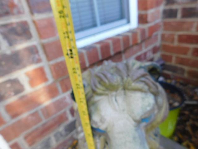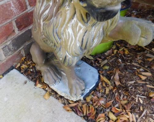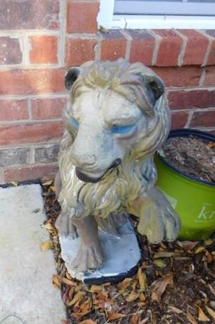 Concrete Figural Lion Statue Raised Paw Painted 23" base has some damage as shown