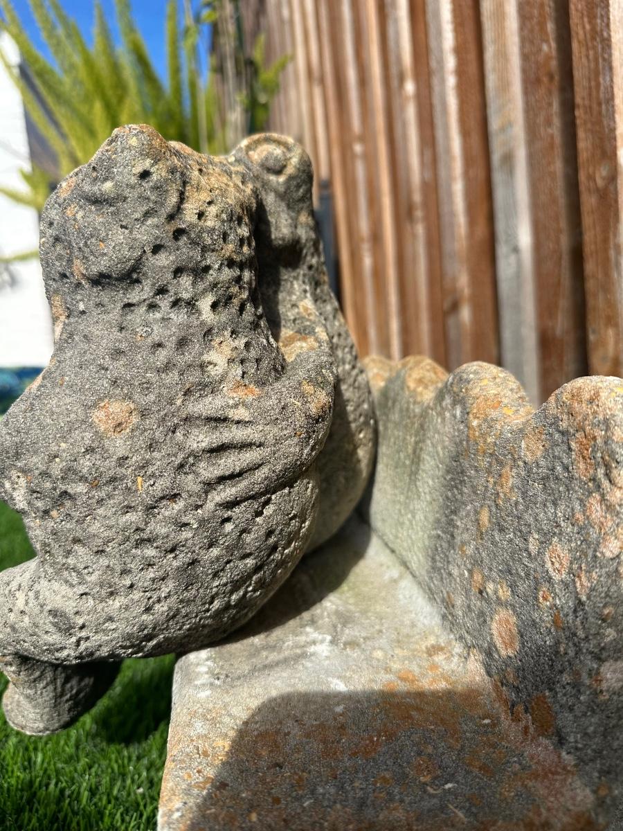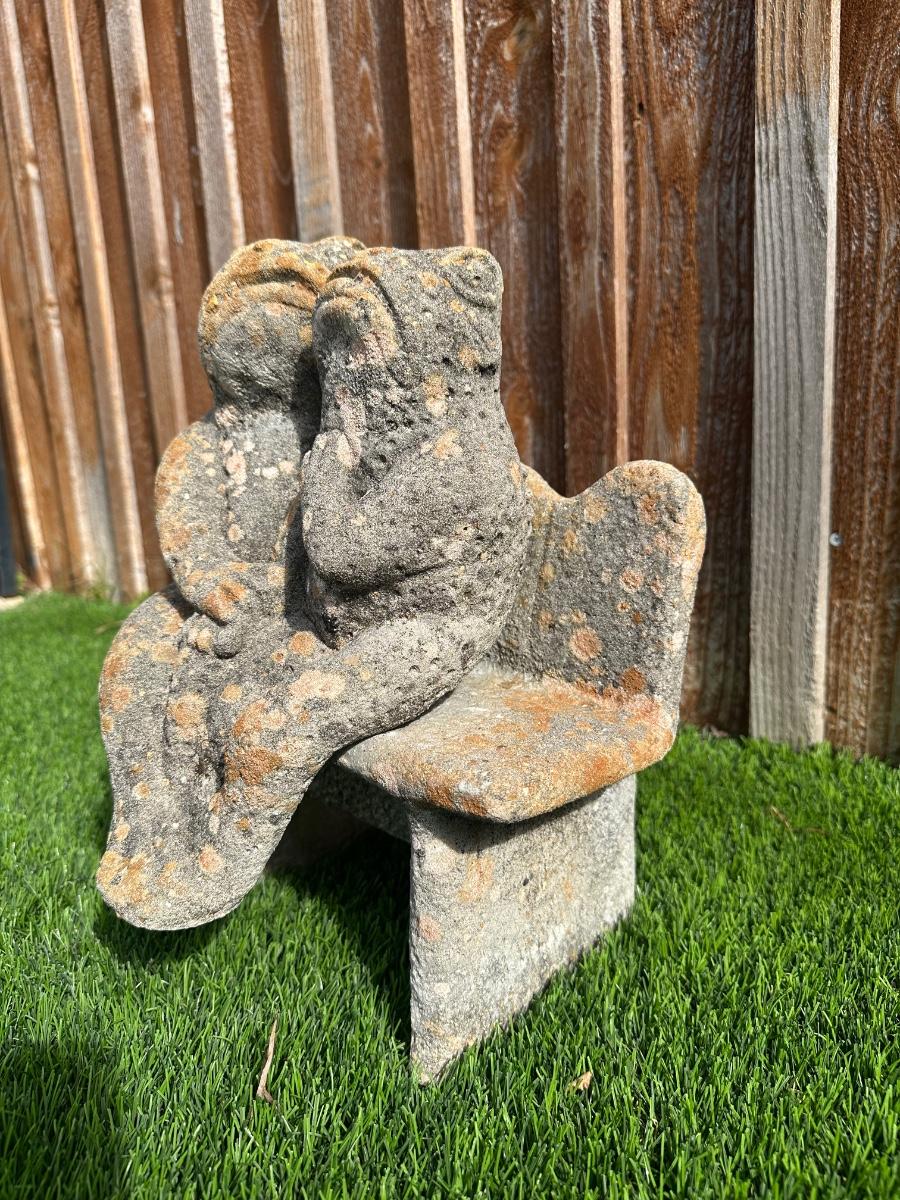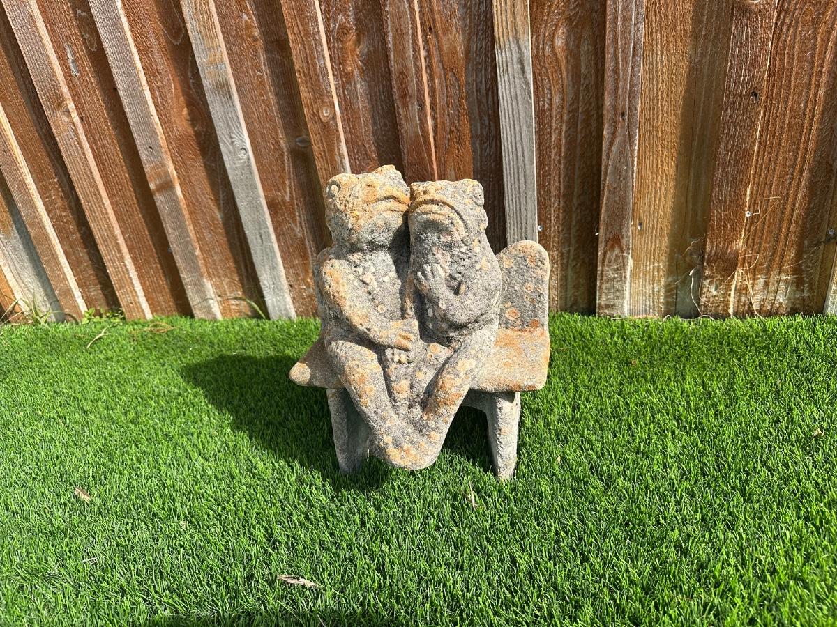 Heavy concrete garden bench featuring two seated frog figures.