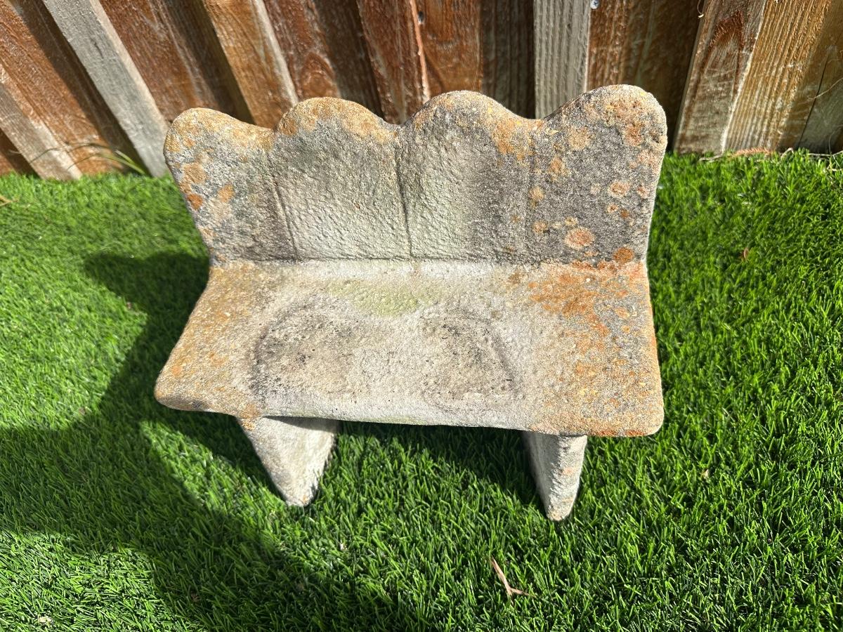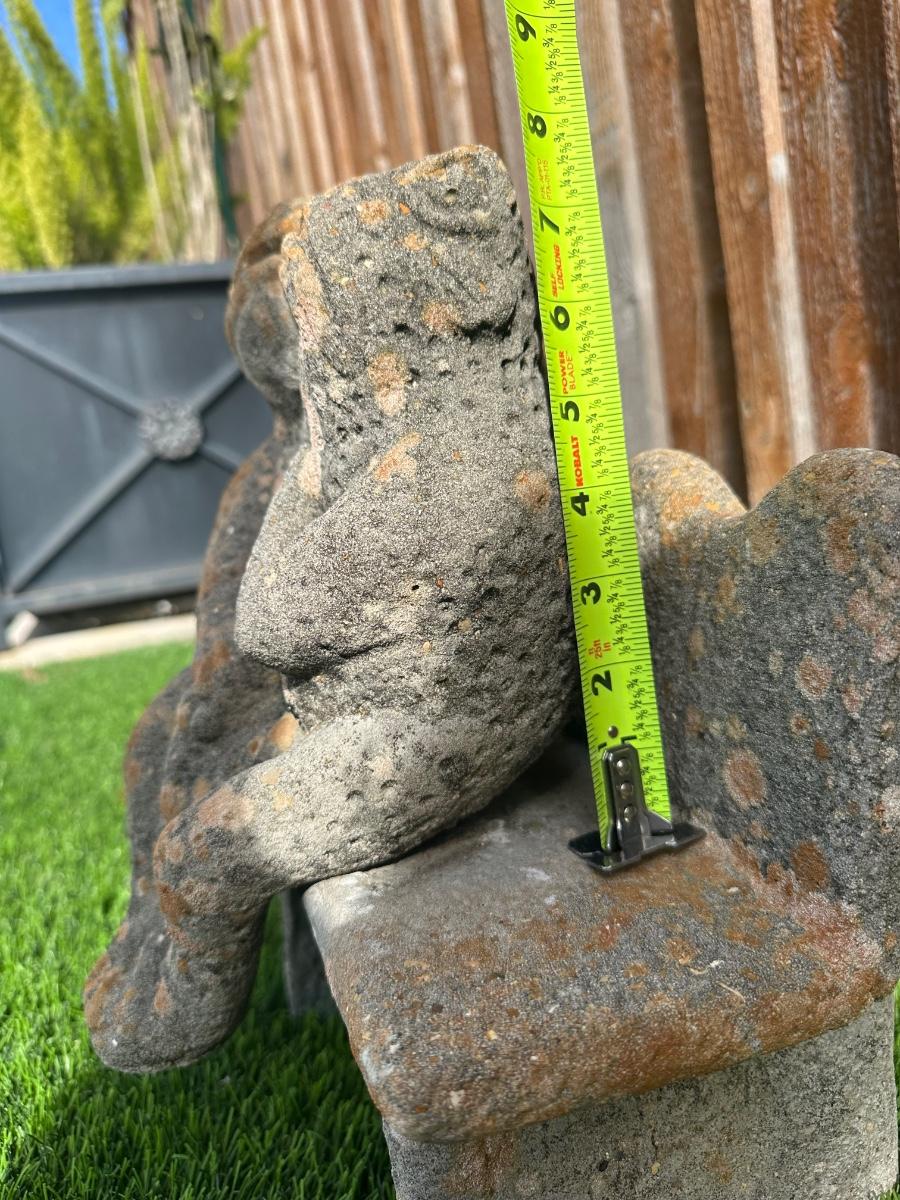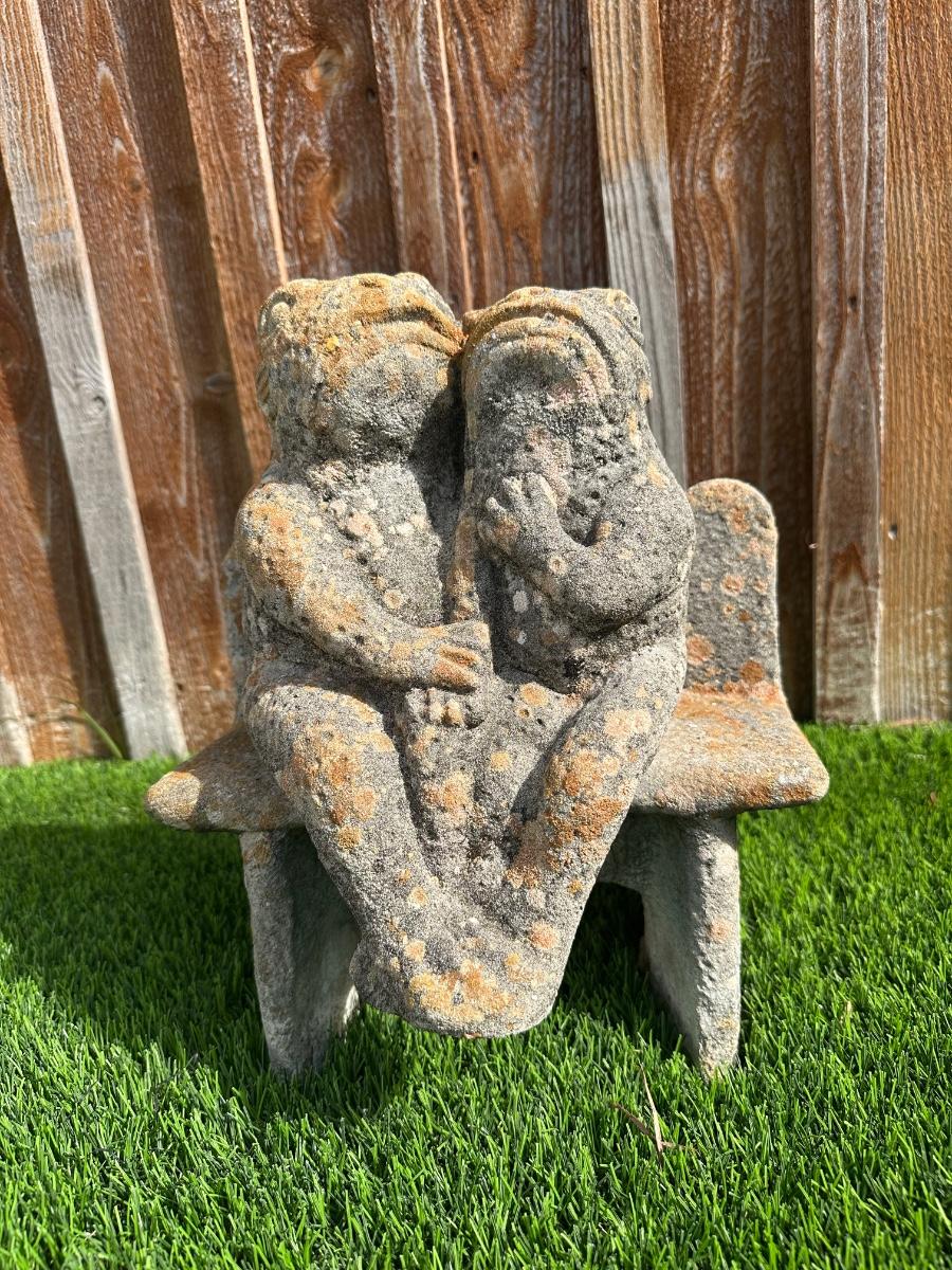 Heavy concrete garden bench featuring two seated frog figures.