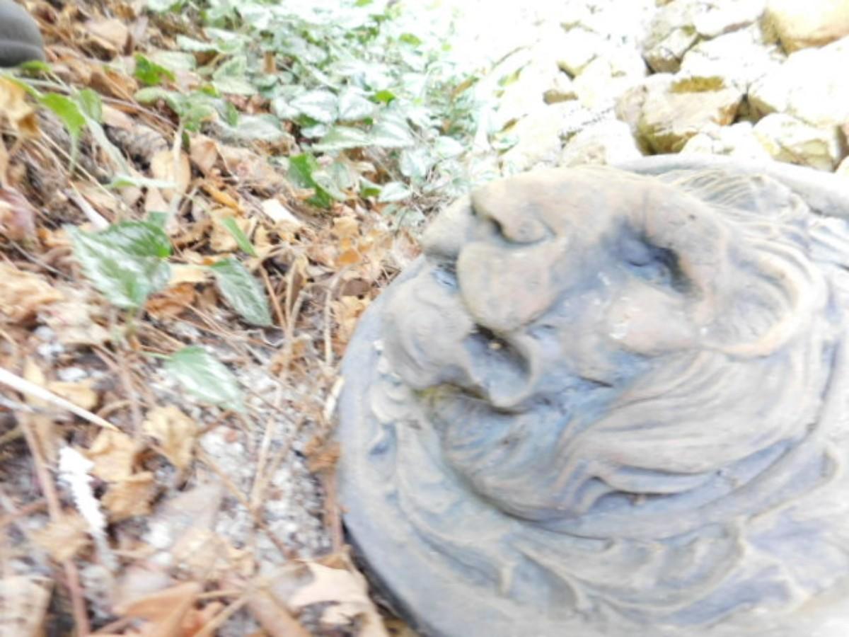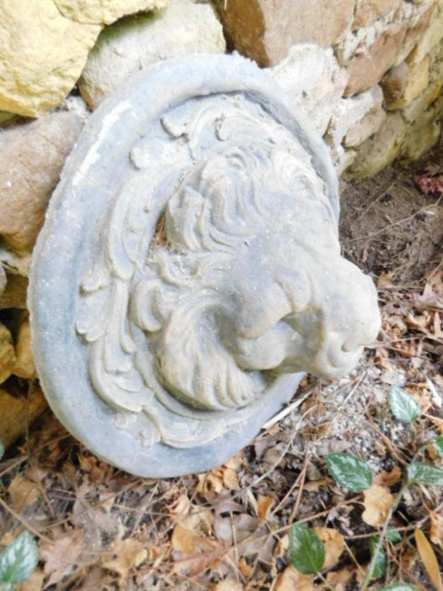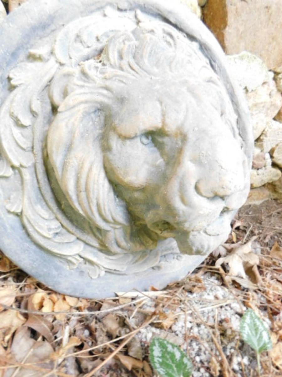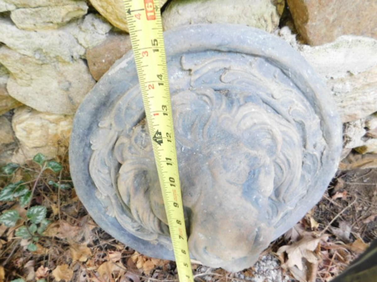 Concrete Lion's Head Garden Plaque May need to bring help removing from yard. Expect weathering and color fade.