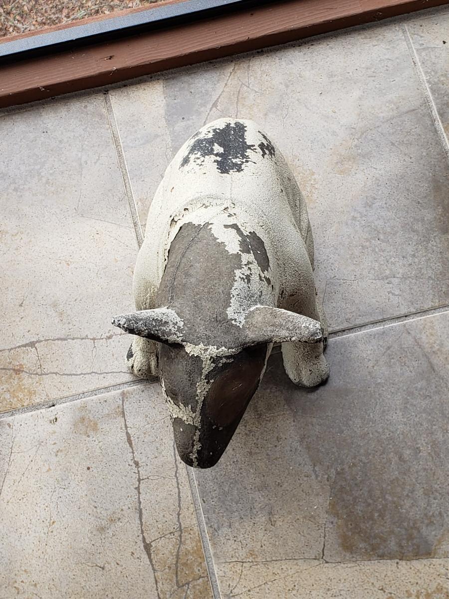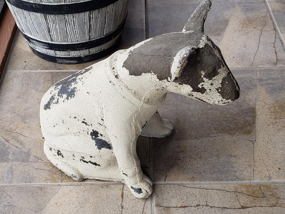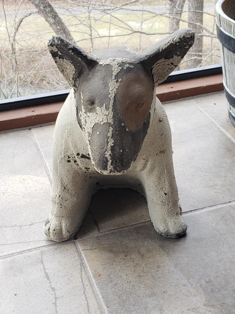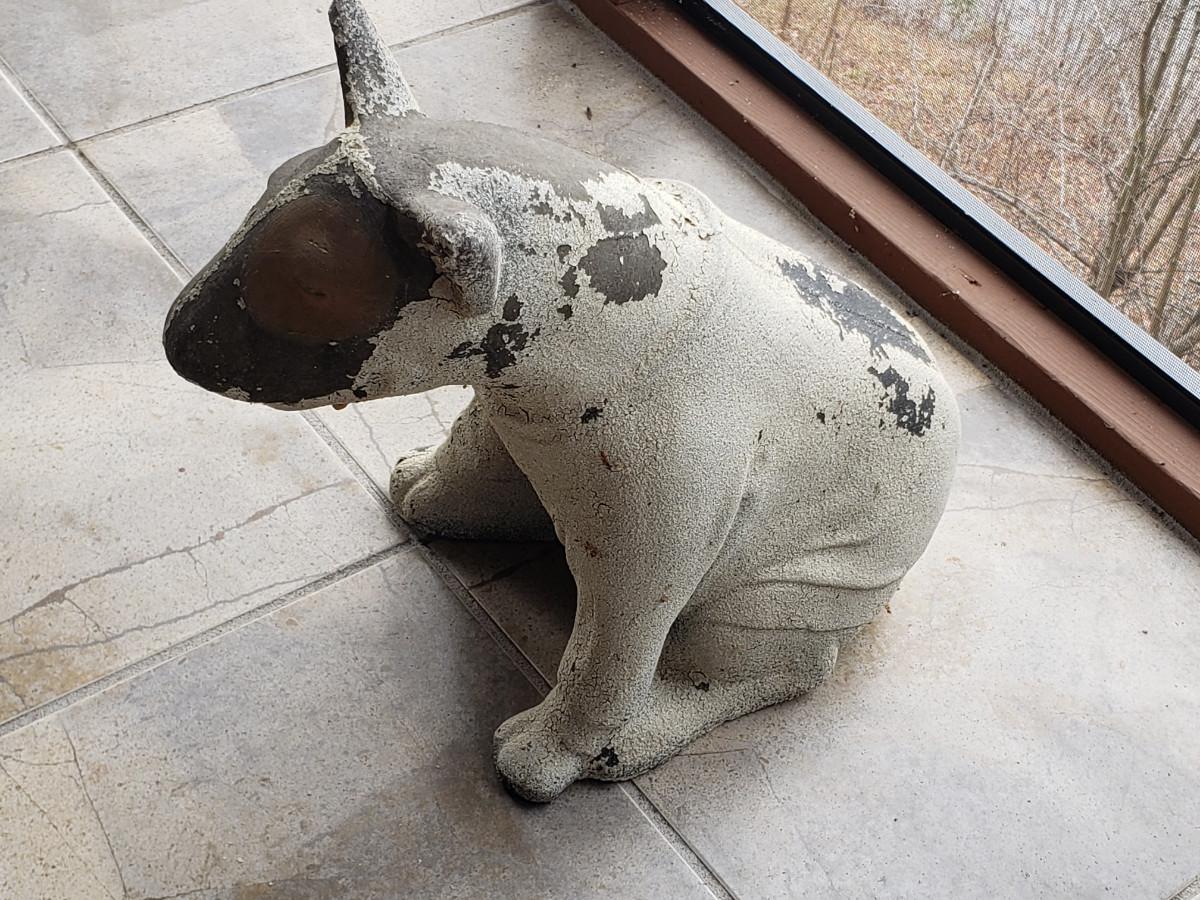 Although our concrete dog needs some new paint, he's still a good boy! Someone with artistic inclinations could paint him to resemble Spuds MacKenzie or maybe Petey from the Little Rascals. See pictures for more details.