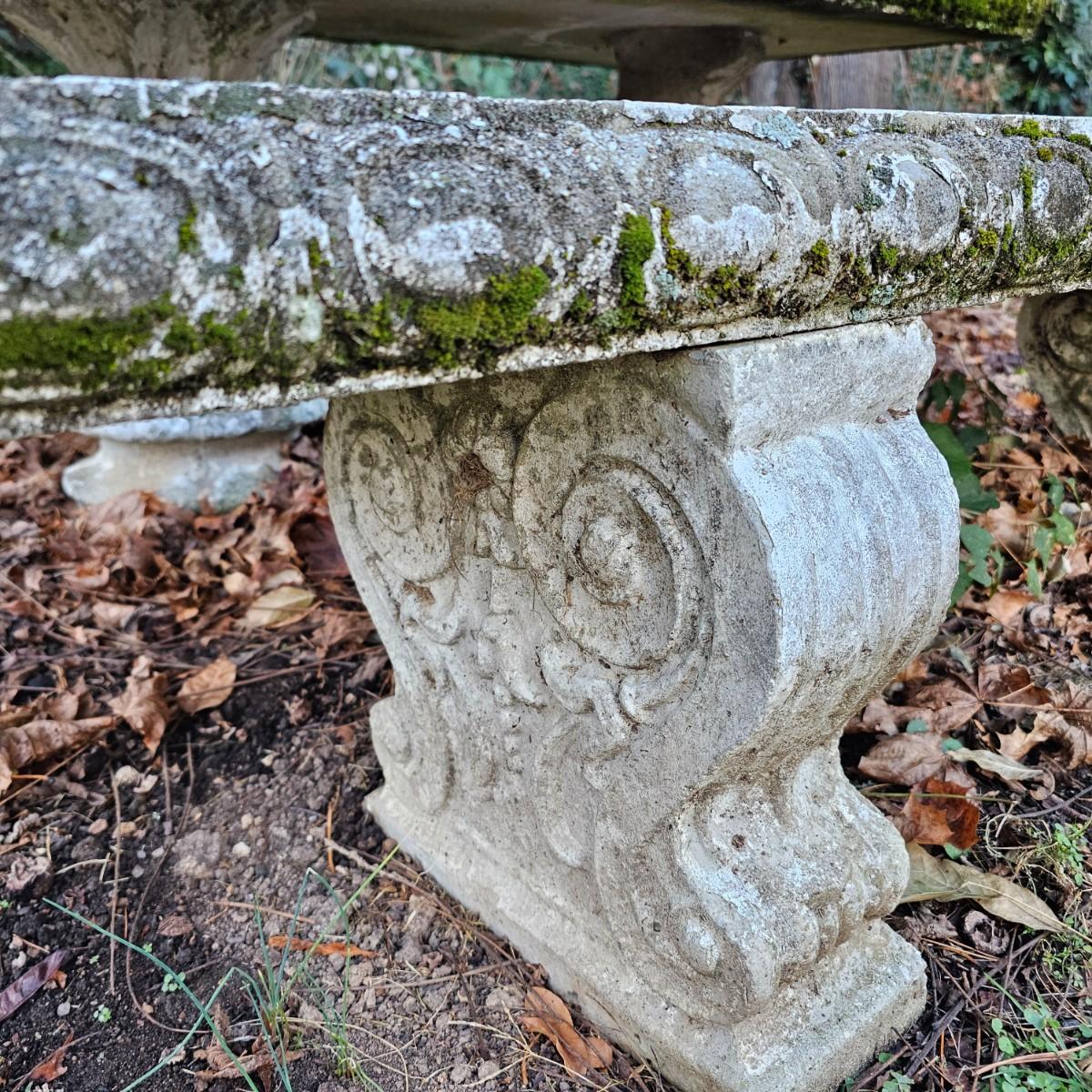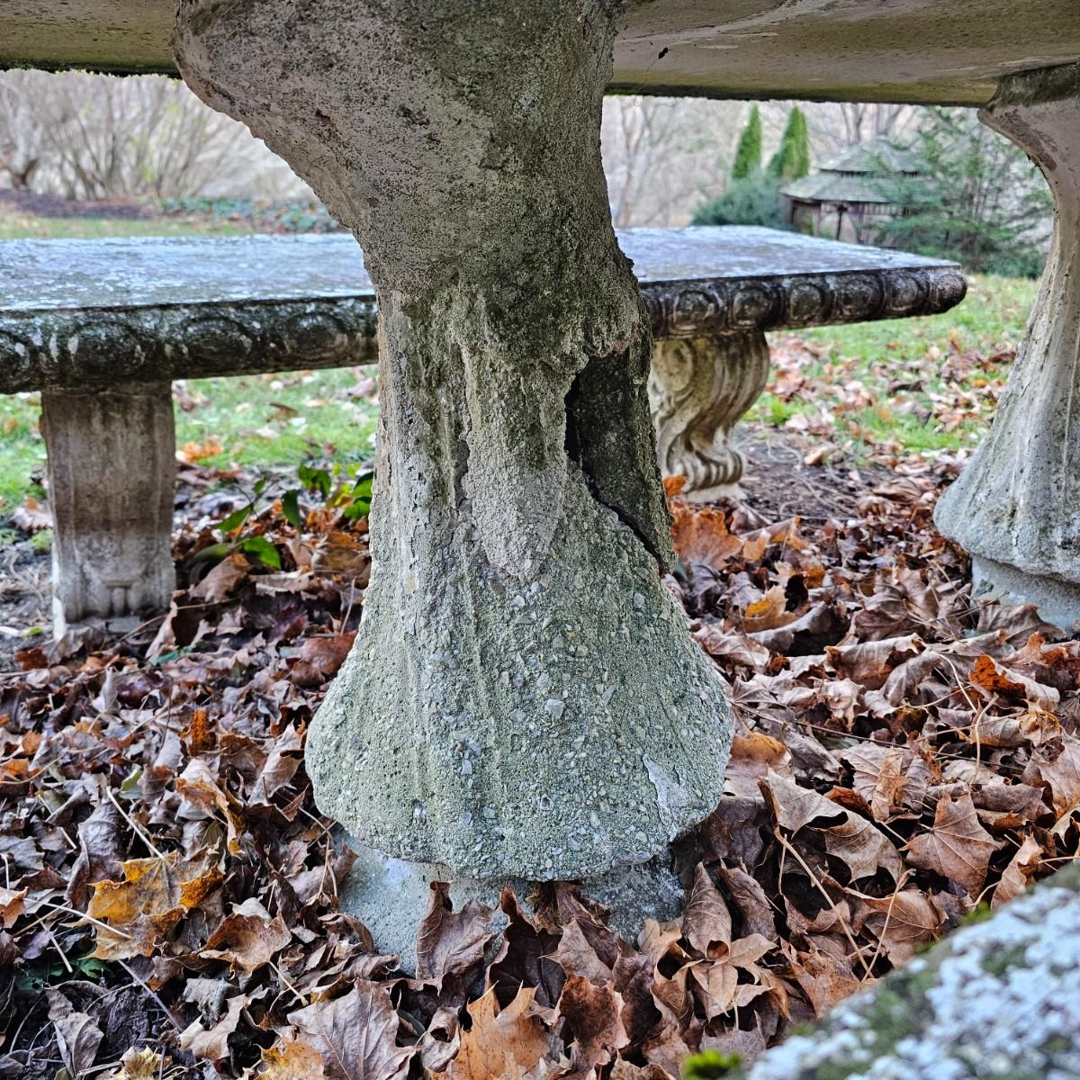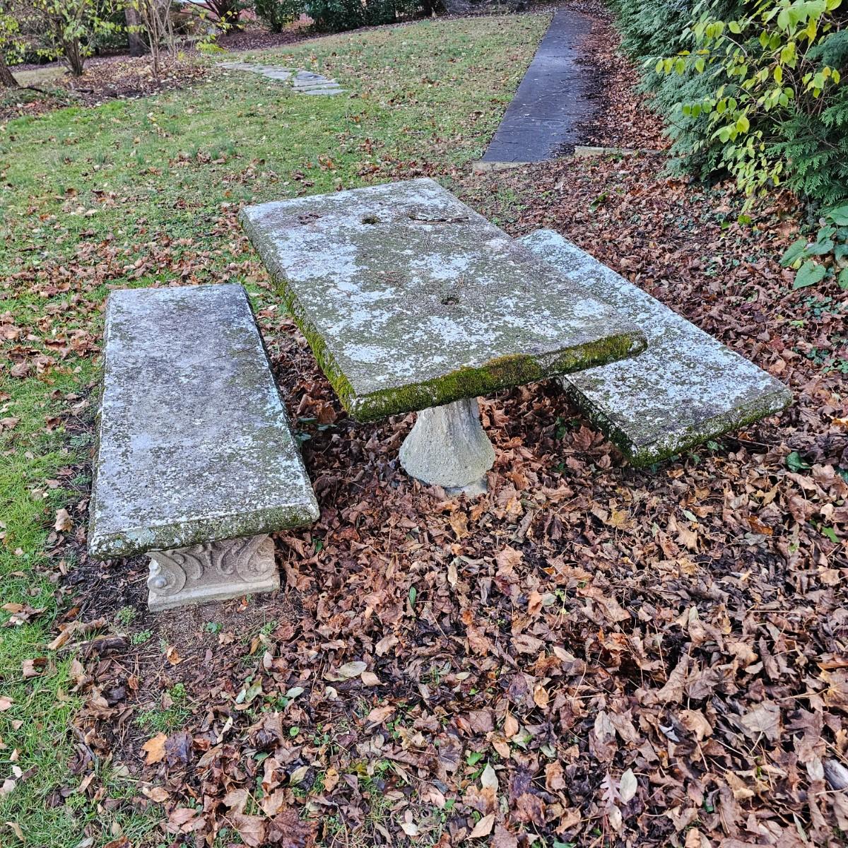 Massive concrete top on two ornate pedestals, this piece reminds us of lazy afternoons at Grandma's house. Two matching benches complete the set. Table is 30" x 57" x 26"H, benches are 19.5" x 57" x 17"H which is also seat height. There are two pedestals per piece., and all tops arec3.5" thick. Table set has been outside for a time, has moss and verdigris on most all surfaces. See photos for details. Local pickup only. Winning bidder must bring assistance to help move and load this item due to its weight and/or size.