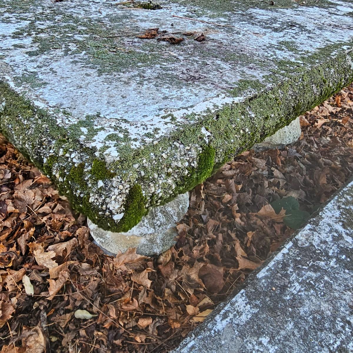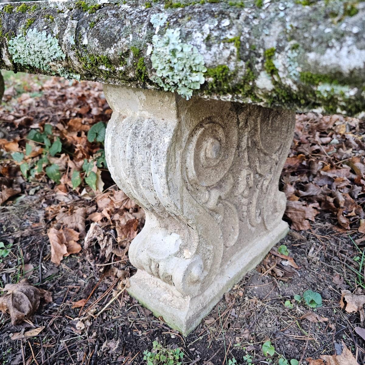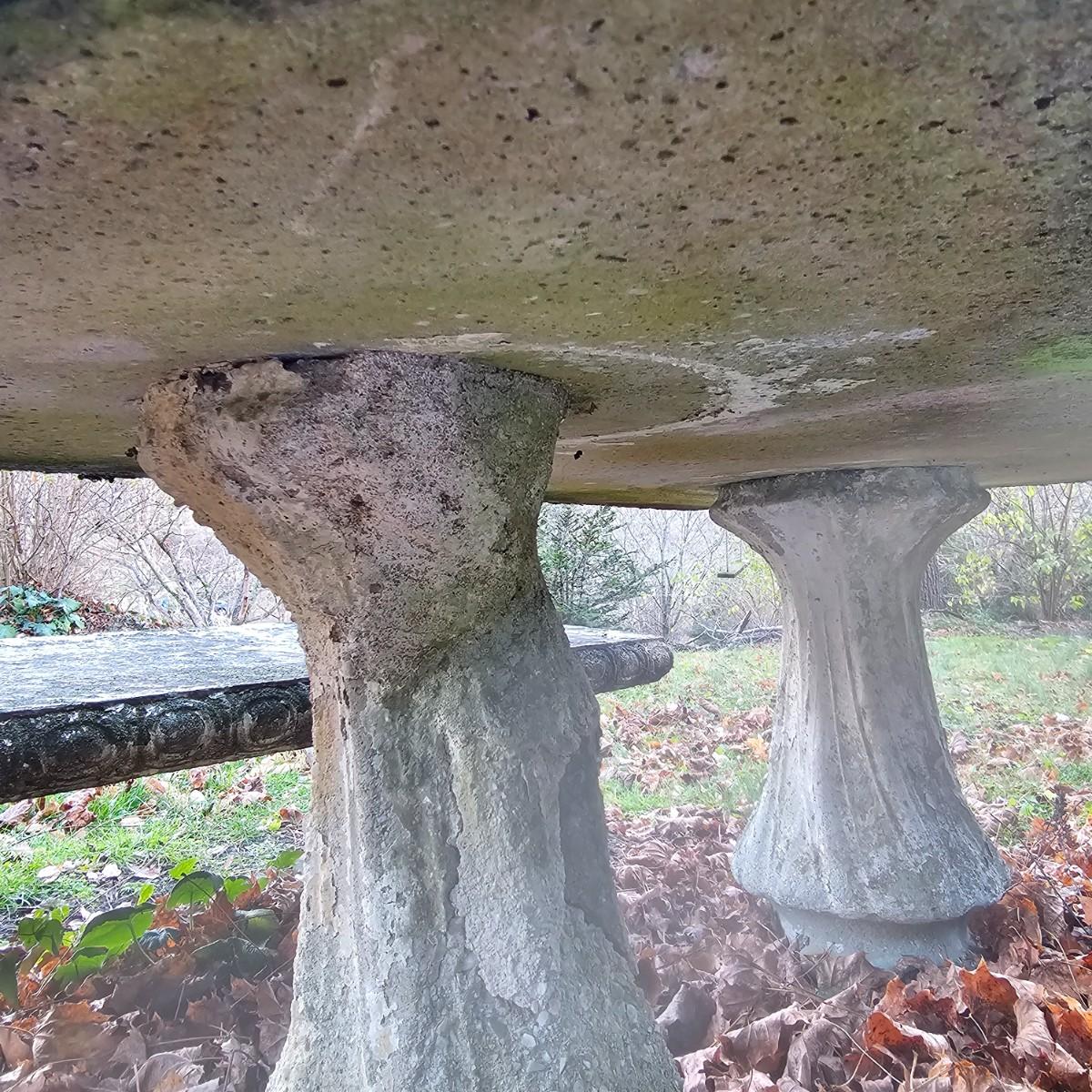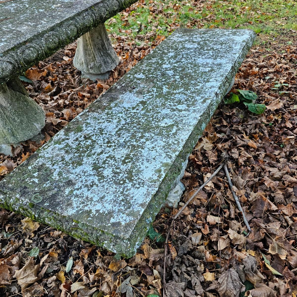 Massive concrete top on two ornate pedestals, this piece reminds us of lazy afternoons at Grandma's house. Two matching benches complete the set. Table is 30" x 57" x 26"H, benches are 19.5" x 57" x 17"H which is also seat height. There are two pedestals per piece., and all tops arec3.5" thick. Table set has been outside for a time, has moss and verdigris on most all surfaces. See photos for details. Local pickup only. Winning bidder must bring assistance to help move and load this item due to its weight and/or size.