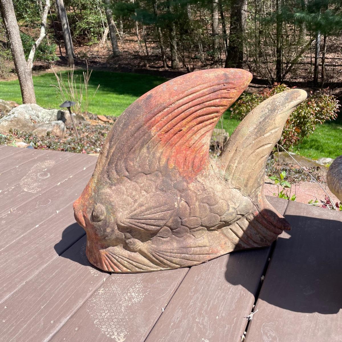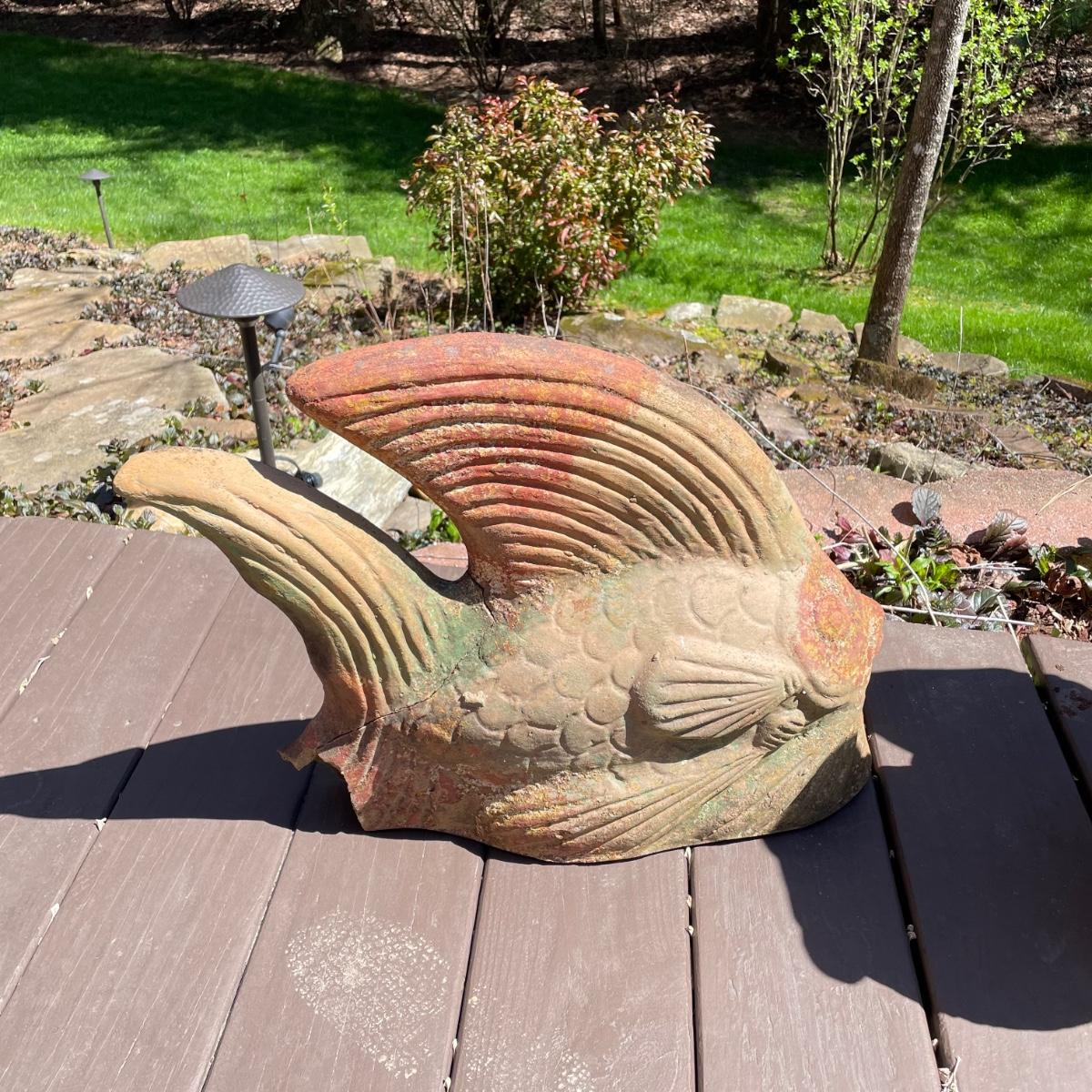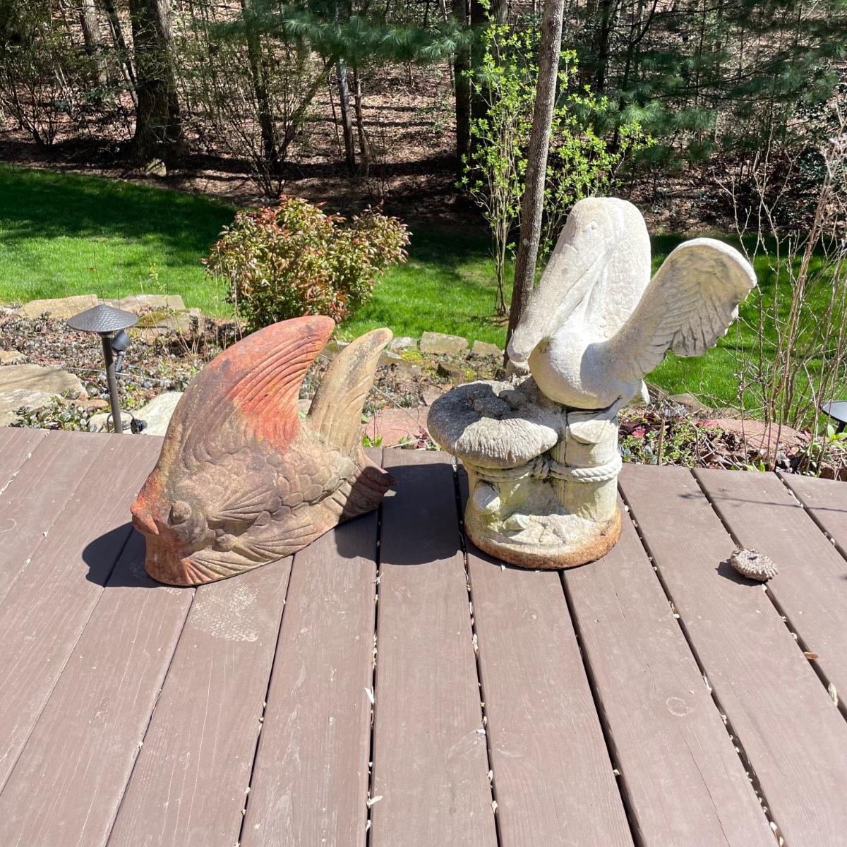 Two oceanic yard statues. A concrete pelican yard statue that measures approximately 10" x 18" x 21"H. The copper colored tropical fish is resin with a concrete texture. It has a significant crack and chip, see photos. Local pickup only. Winning bidder must bring assistance to help move and load the pelican due to its weight and/or size.