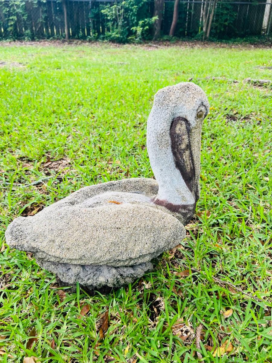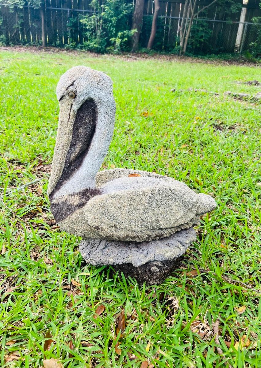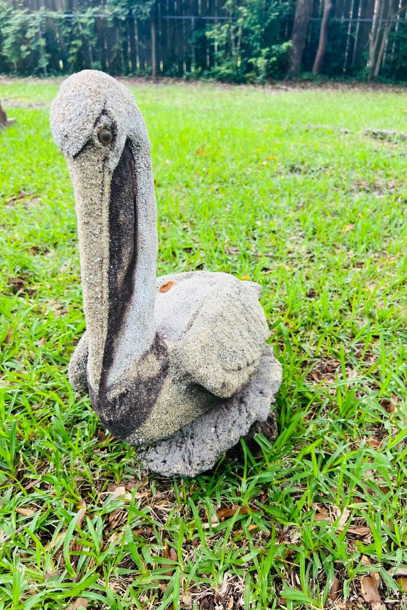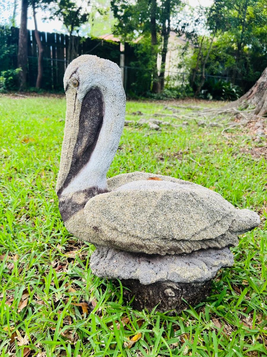 Very heavy, concrete pelican statue that can be painted or left as is. Measures approximately 19 inches tall and 17 1/2 inches long.