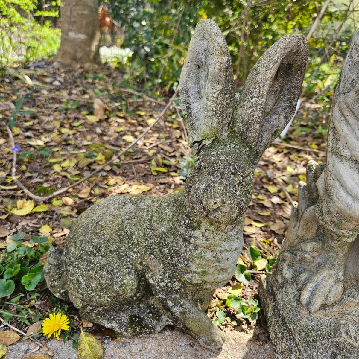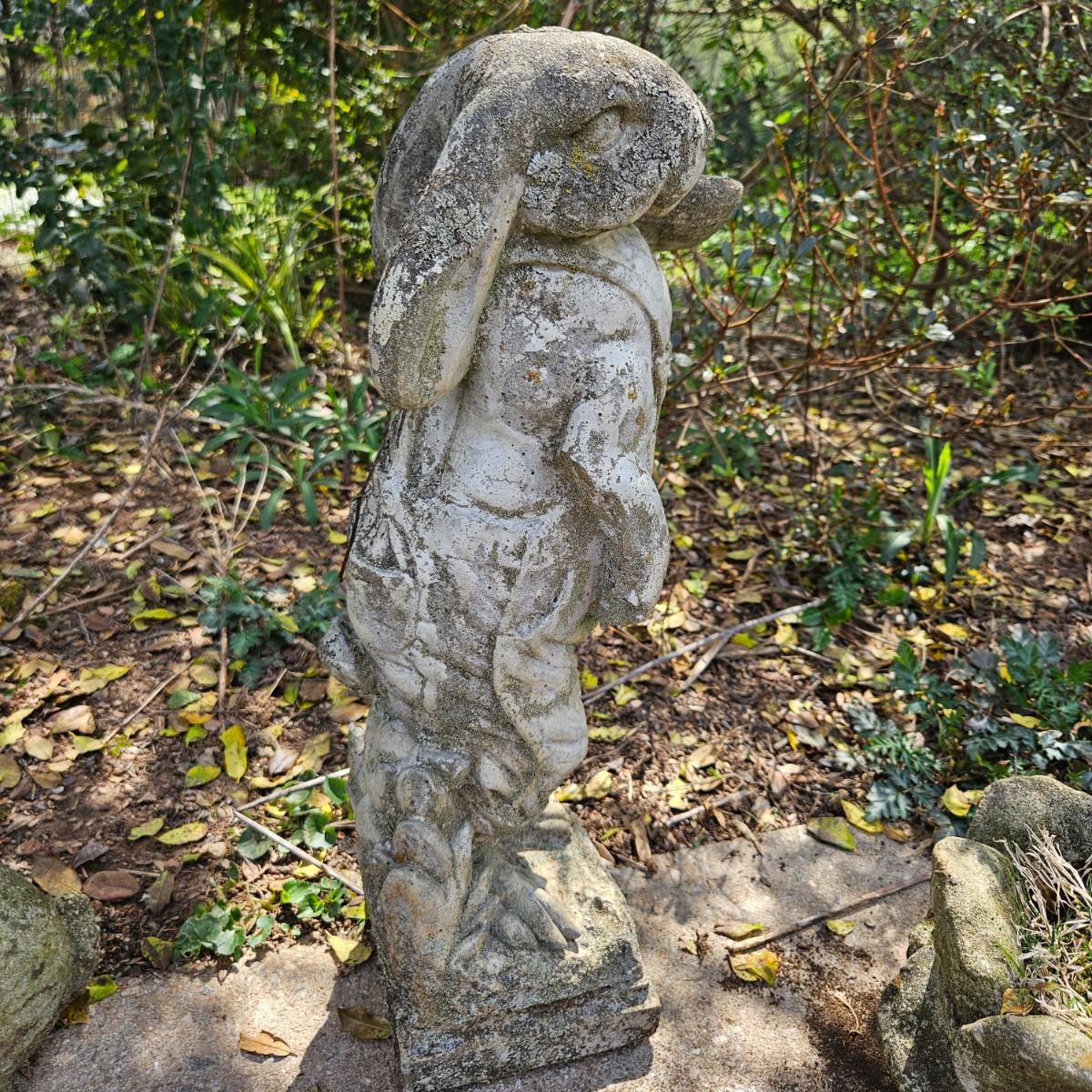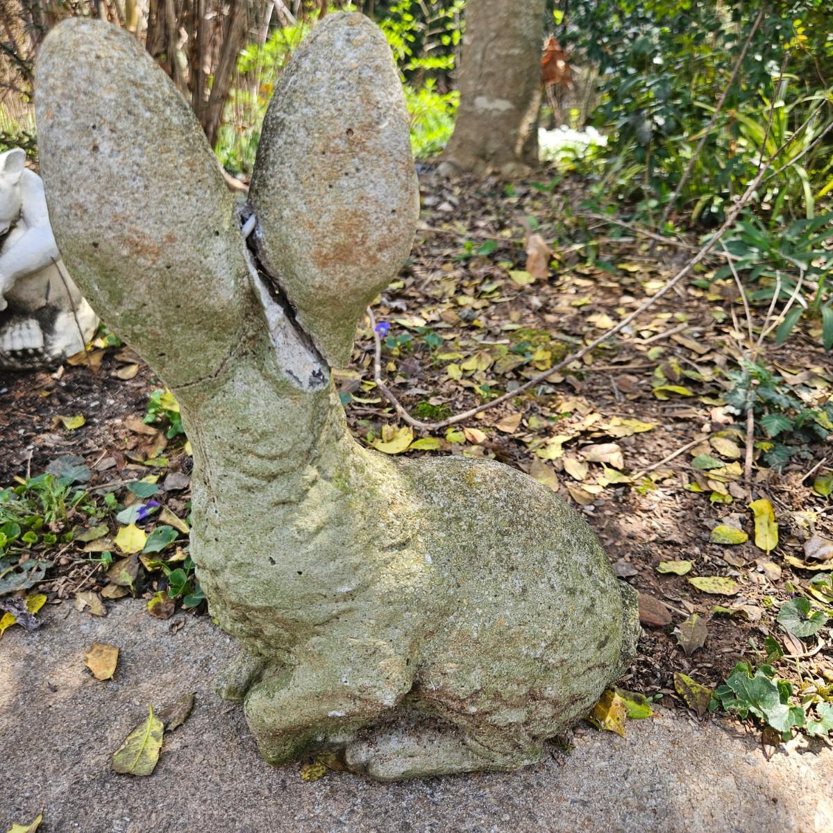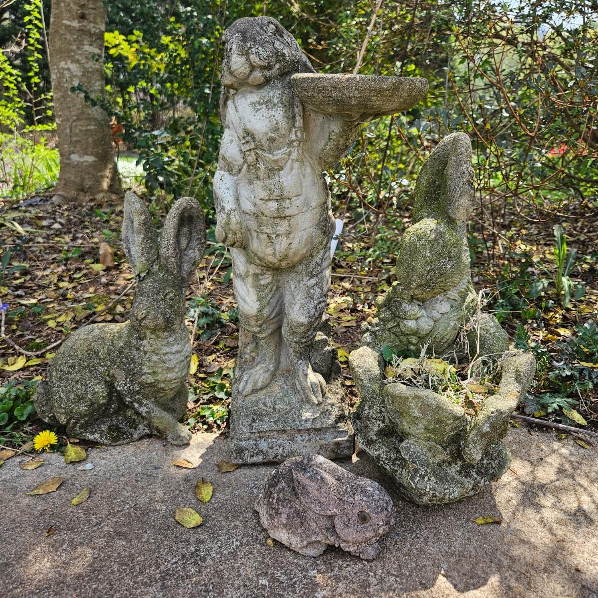 Four pieces of concrete yard art that are all rabbits. The largest piece measures approximately 10" x 6" x 22"H. Some pieces are damaged from years of being outside, see attached pictures for more detail. Local pickup only