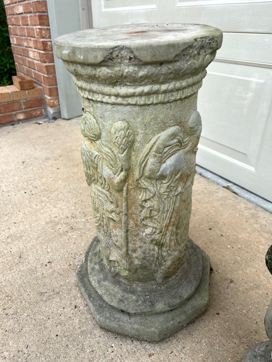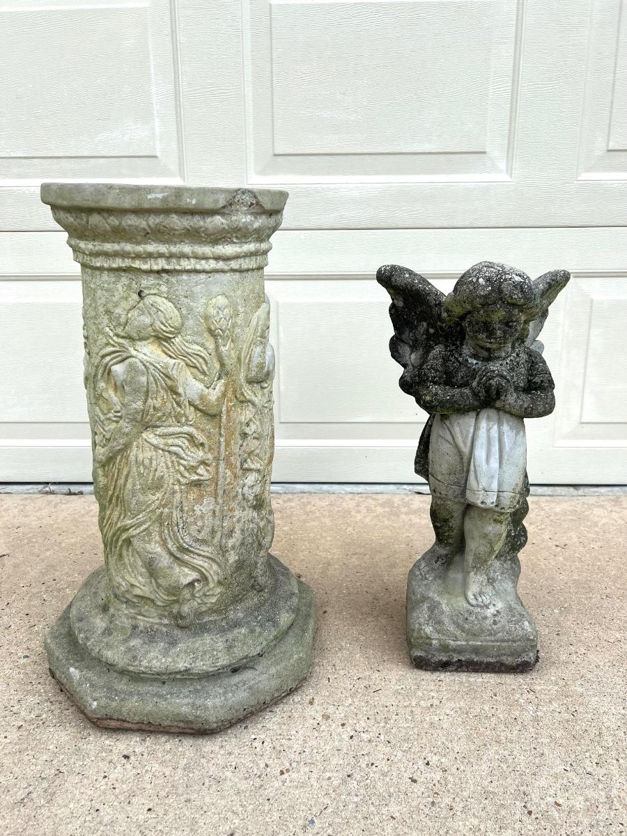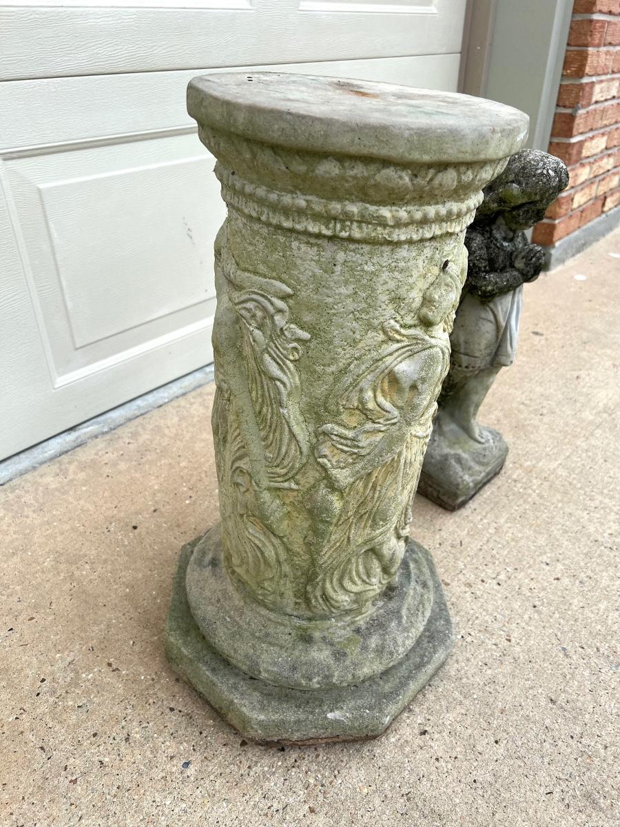 See pictures for condition. Both could use a good cleaning. Pedestal does have some chips(pictured). They do not go together but are being sold together. Pedestal measures 23” tall. Statue measures 20” tall.