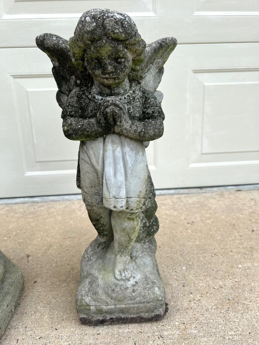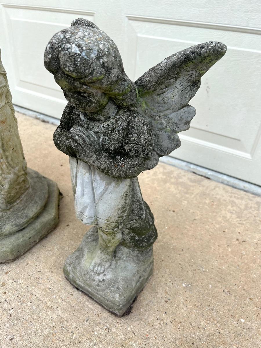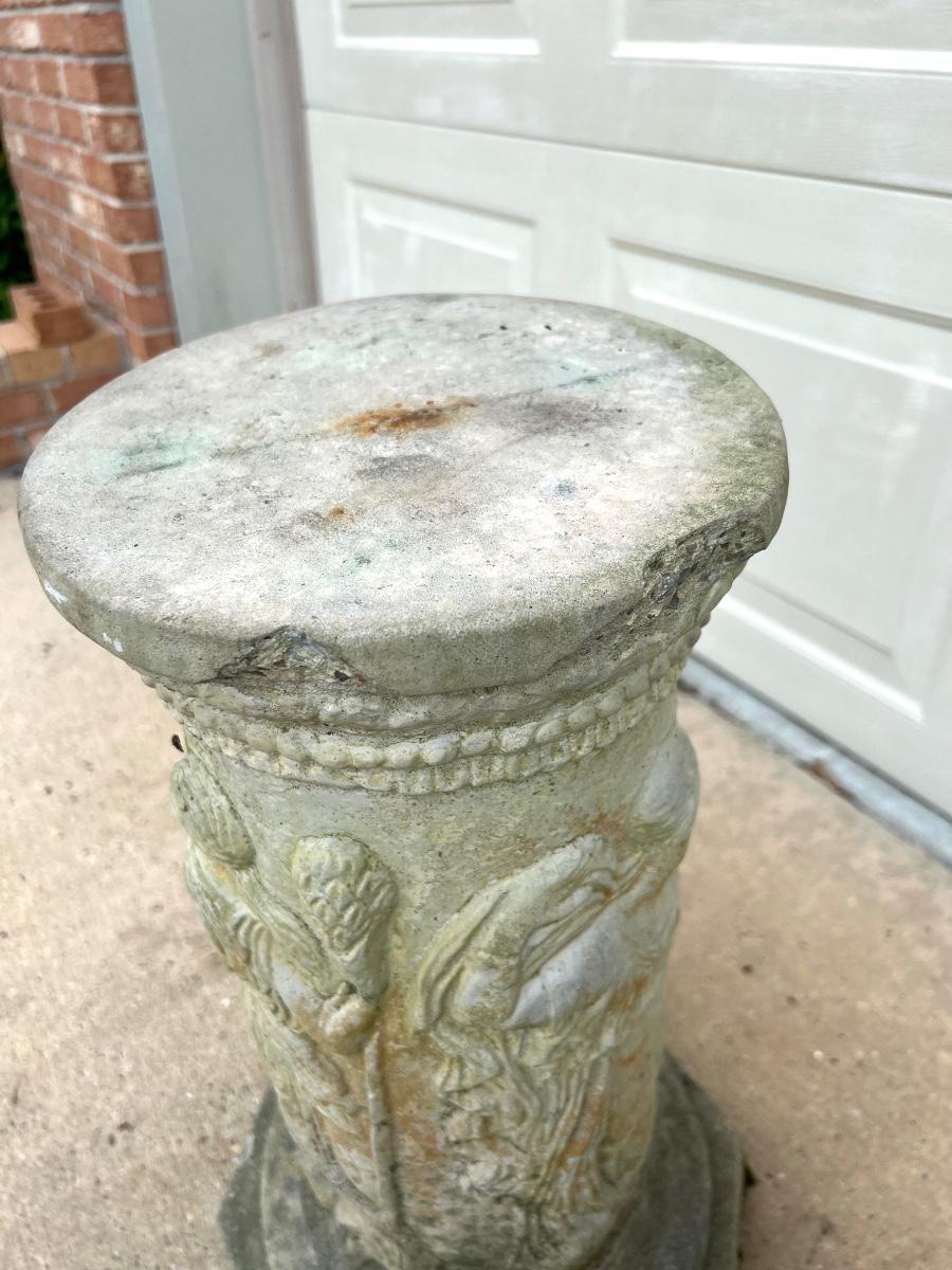 See pictures for condition. Both could use a good cleaning. Pedestal does have some chips(pictured). They do not go together but are being sold together. Pedestal measures 23” tall. Statue measures 20” tall.