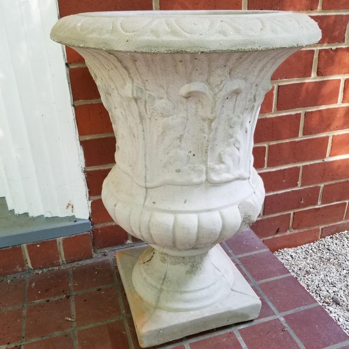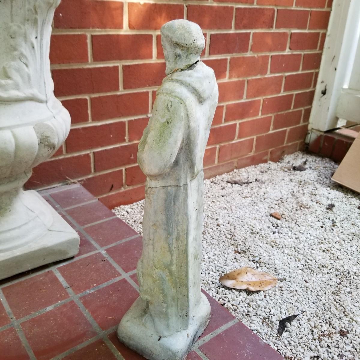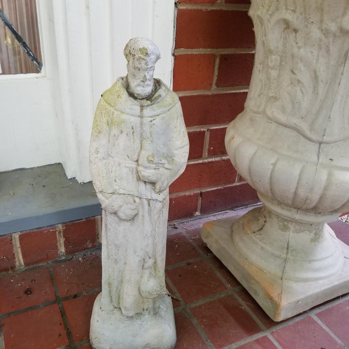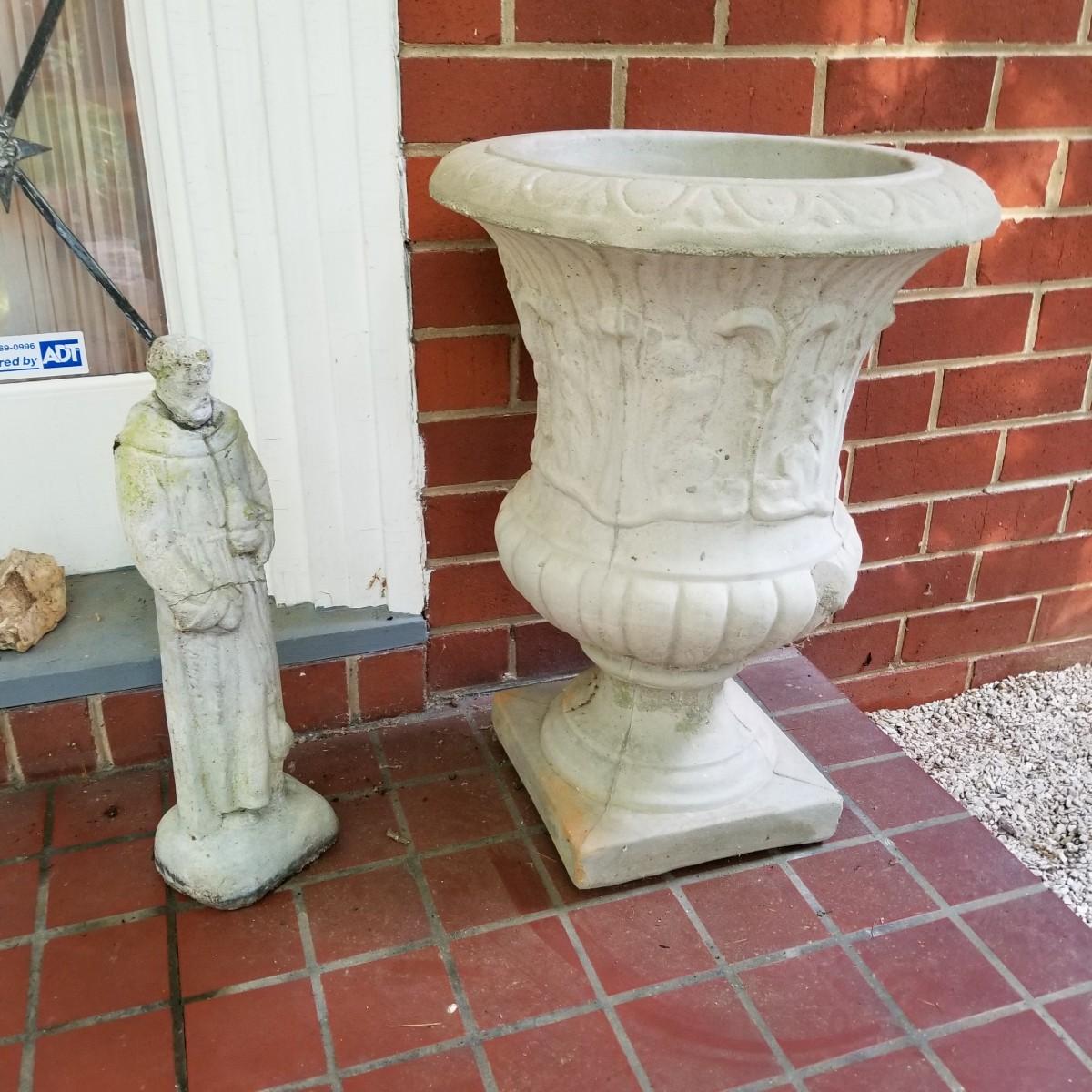 Outdoor display pieces, one small statue and one urn planter. The statue is 19" tall, a saint holding a bird. The saint has two breakage points, one in the middle and the head. The urn is 17"dx25" h, has patterned design molded in. See photos for detail. Very heavy; the winning bidder will need to bring help to move.  Local pickup only.