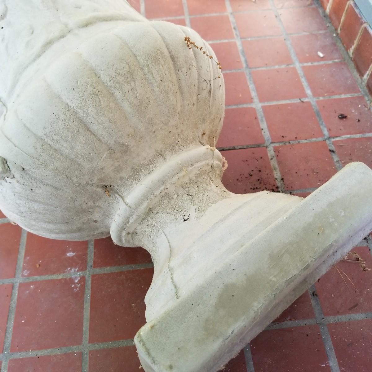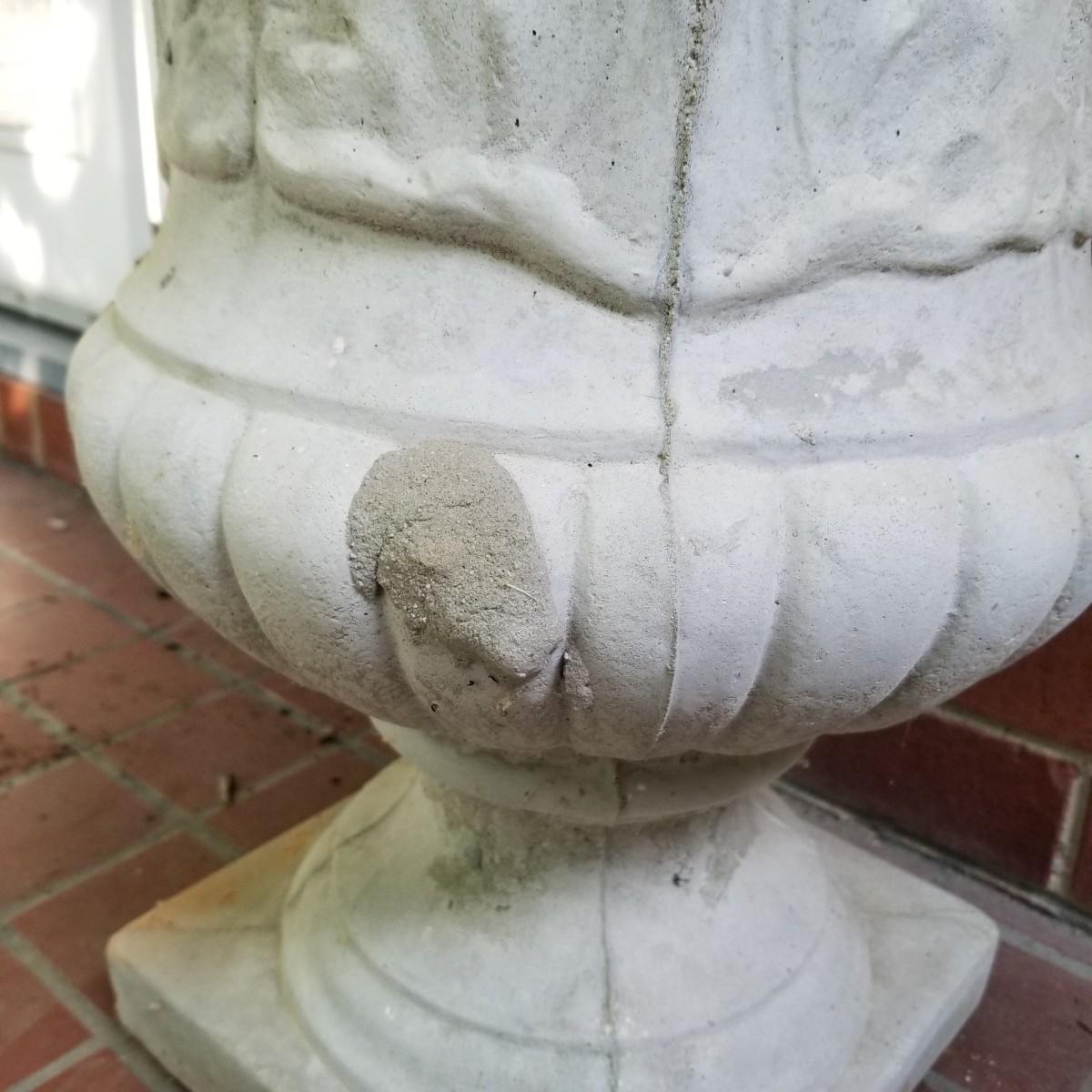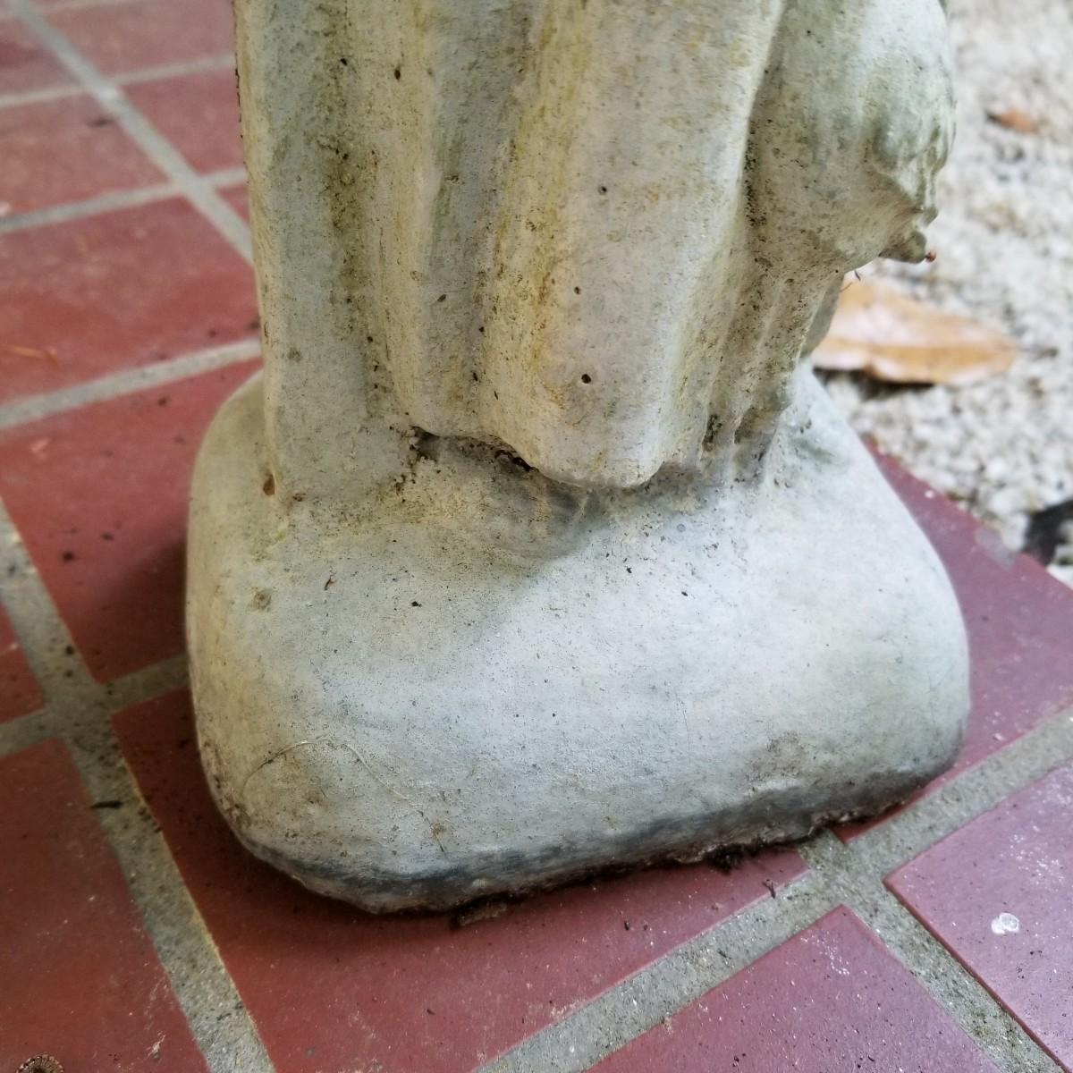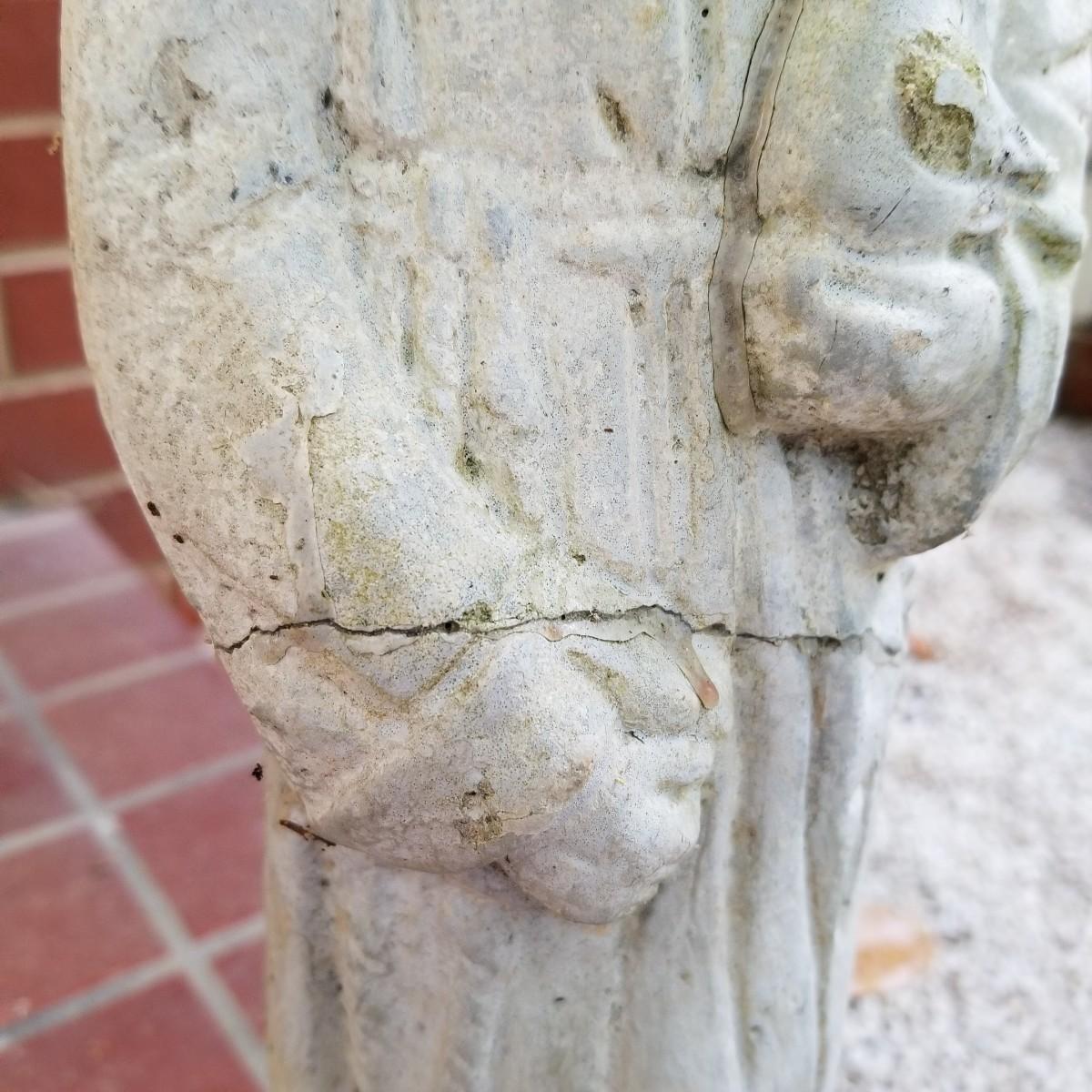 Outdoor display pieces, one small statue and one urn planter. The statue is 19" tall, a saint holding a bird. The saint has two breakage points, one in the middle and the head. The urn is 17"dx25" h, has patterned design molded in. See photos for detail. Very heavy; the winning bidder will need to bring help to move.  Local pickup only.