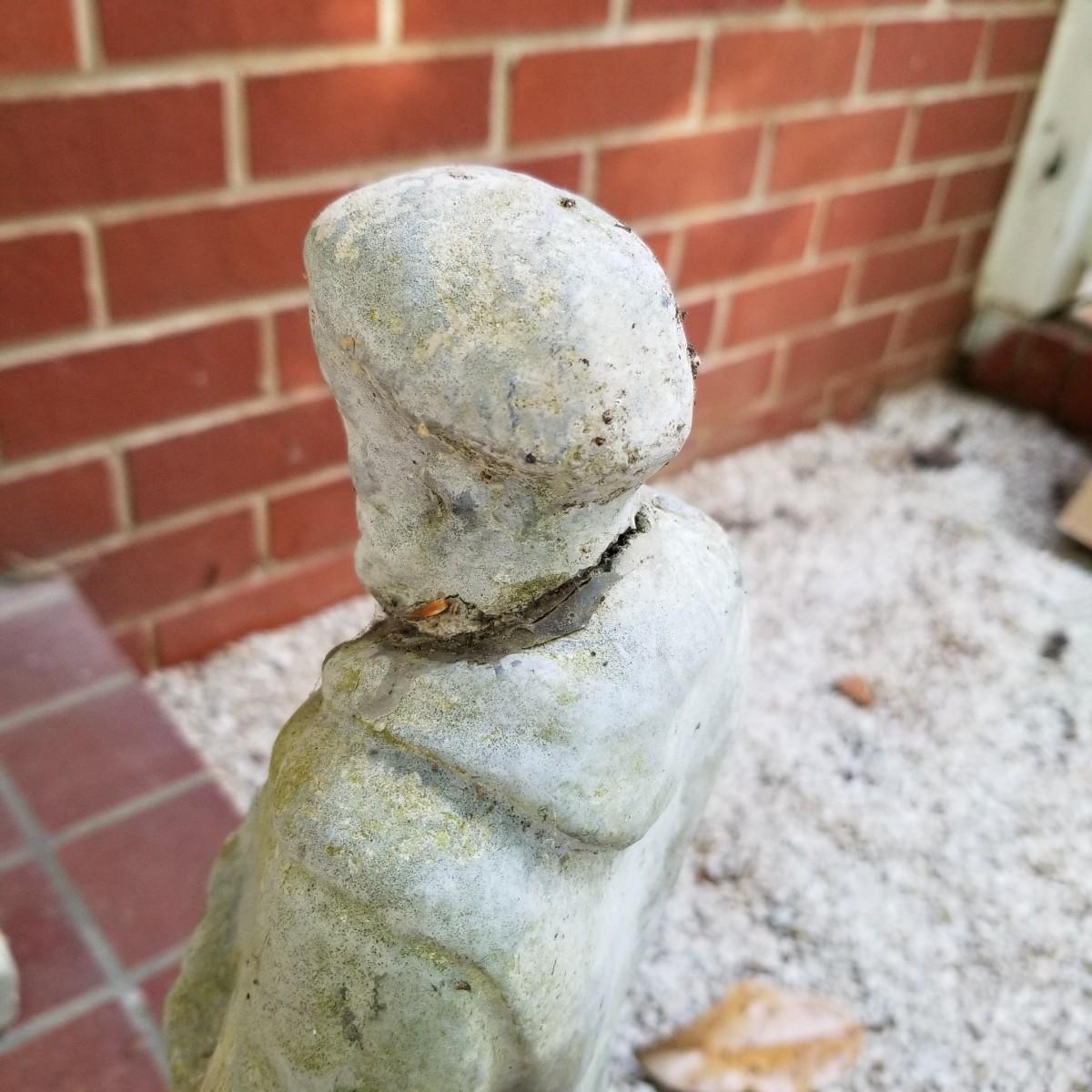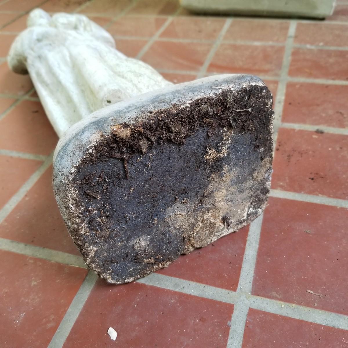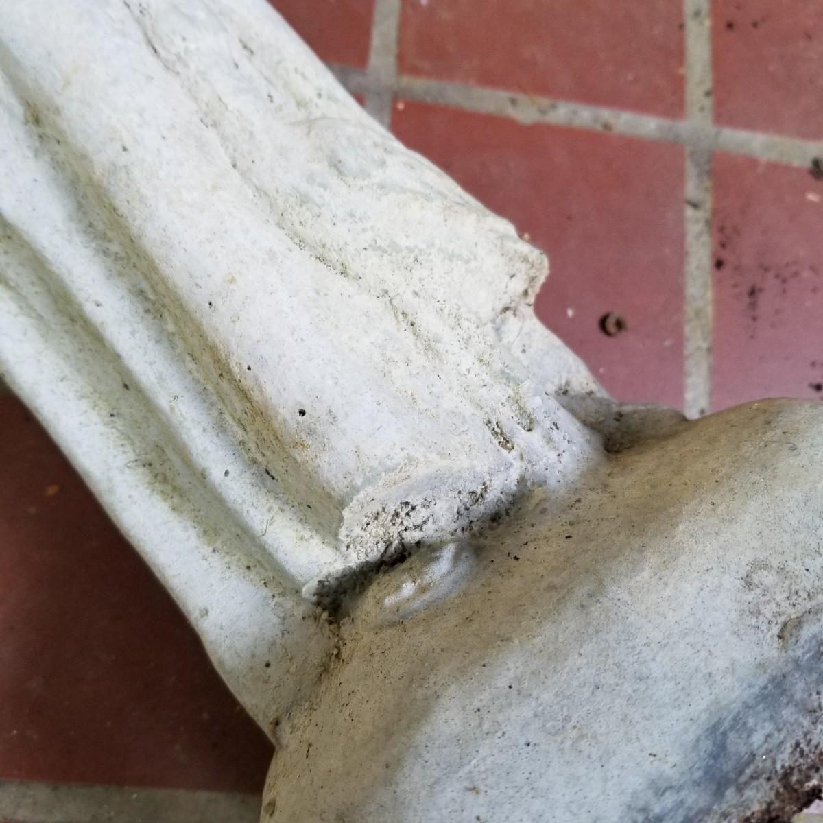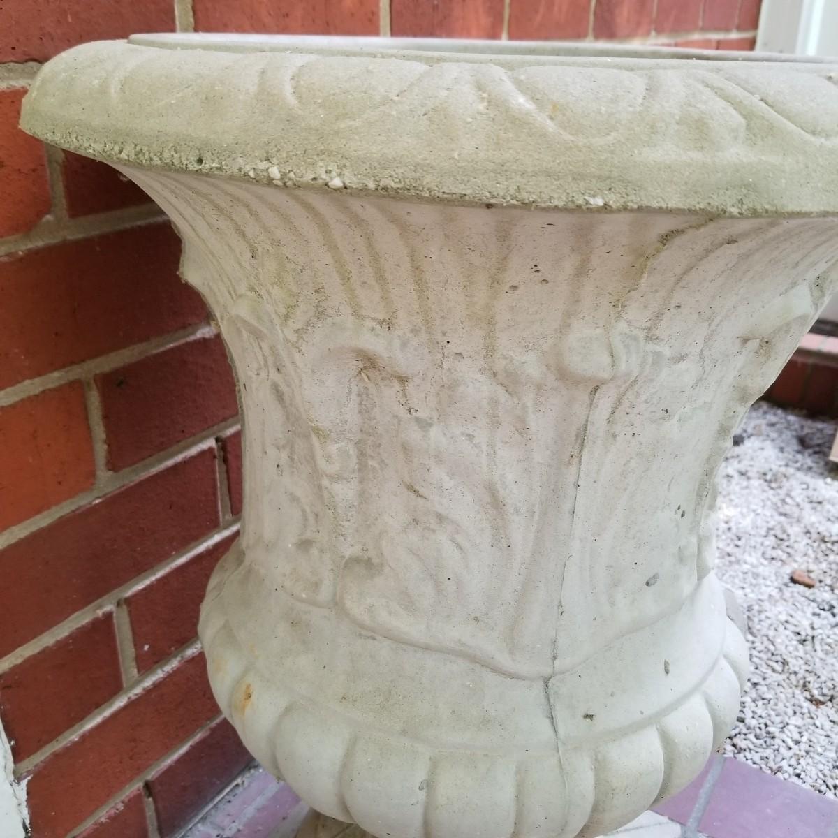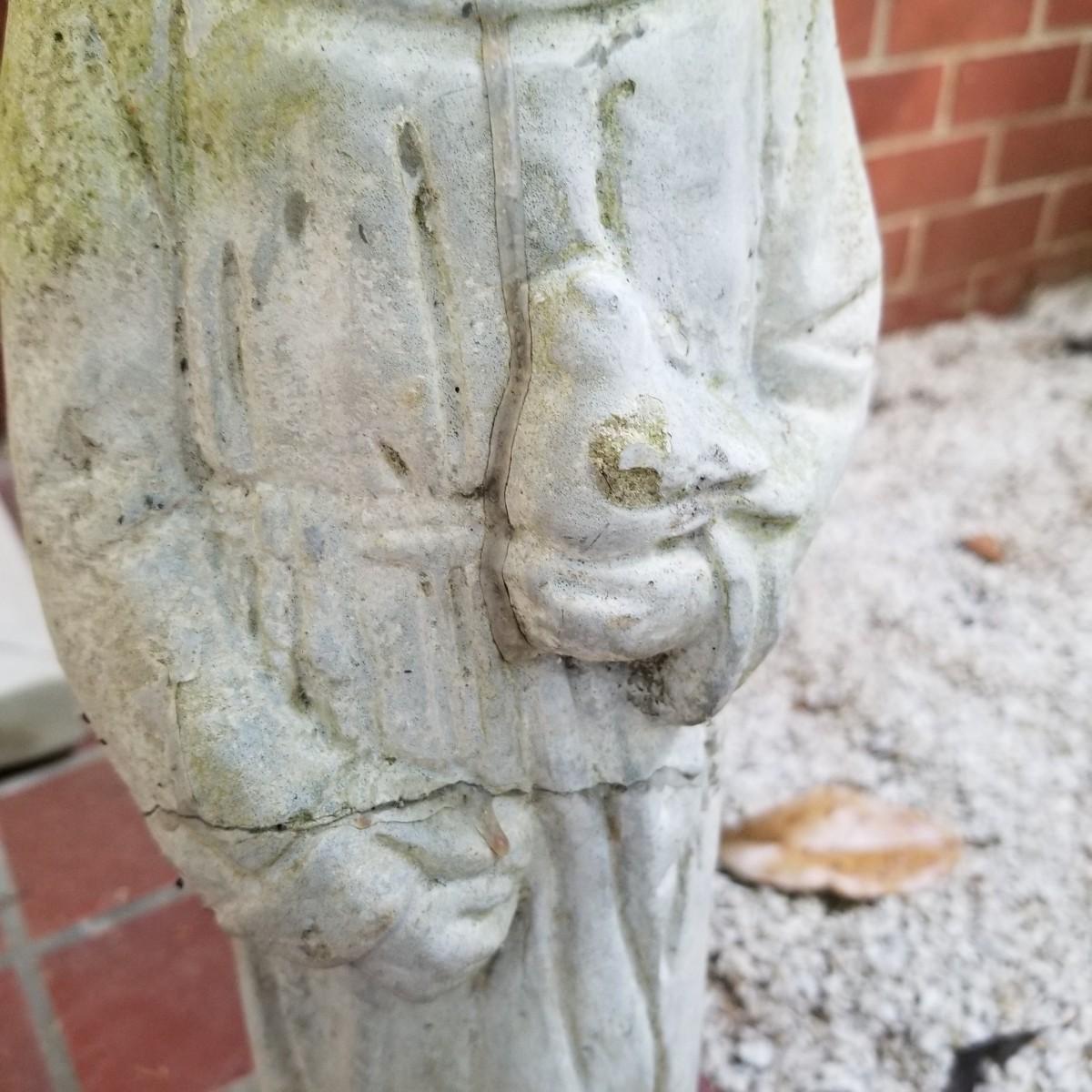 Outdoor display pieces, one small statue and one urn planter. The statue is 19" tall, a saint holding a bird. The saint has two breakage points, one in the middle and the head. The urn is 17"dx25" h, has patterned design molded in. See photos for detail. Very heavy; the winning bidder will need to bring help to move.  Local pickup only.