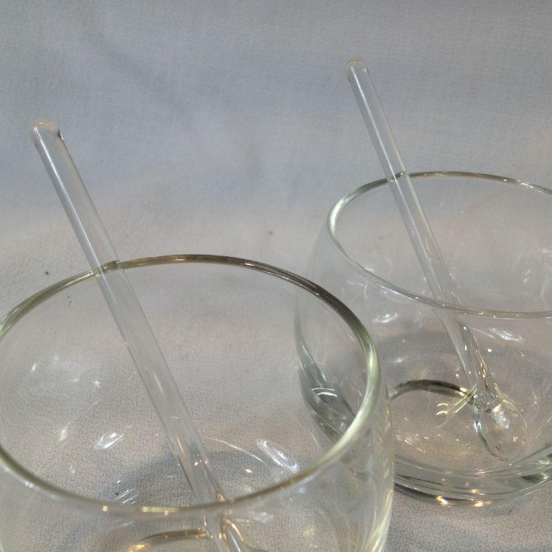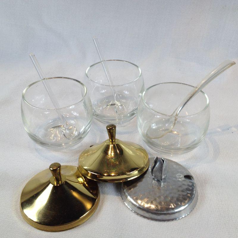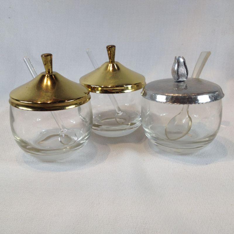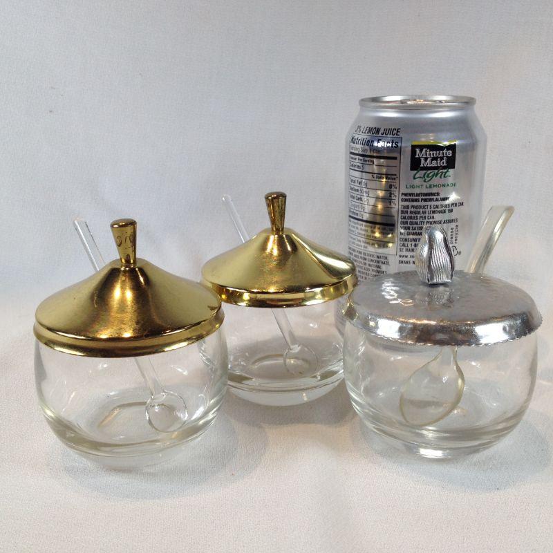 This is a trio of glass condiment jars. Two with brass lids and glass spoon the other is a more mid-century jar with an aluminum lid and plastic spoon. They are all 3-inches in diameter and are in very good condition. Serve your mustard, ketchup and chopped onions in them at your next weiner roast.
