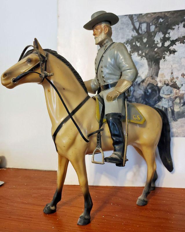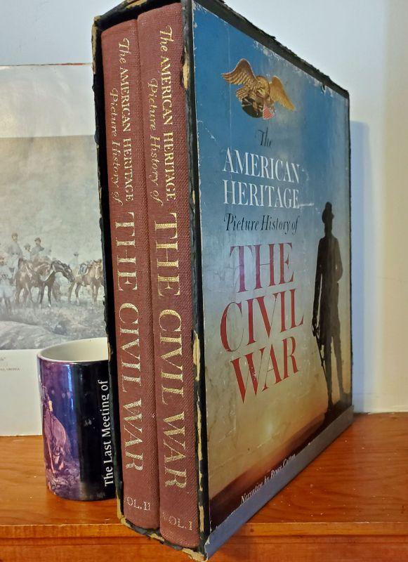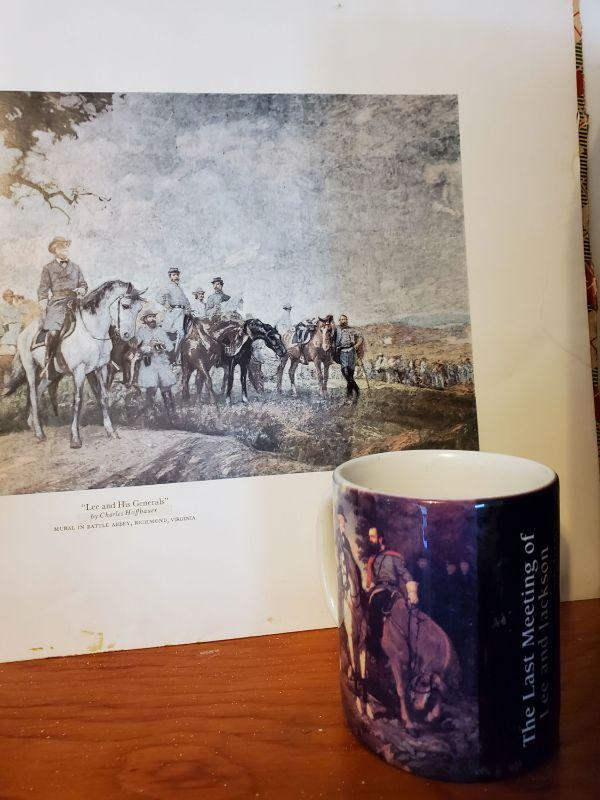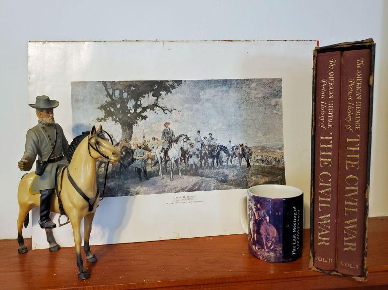 Lot includes plastic Figure of Robert E. Lee on Traveler, a mug depicting the Last Meeting of Lee and Jackson, a print of Lee and his Generals, and the 2 volume American Heritage set of The Civil war in a Slipcase.