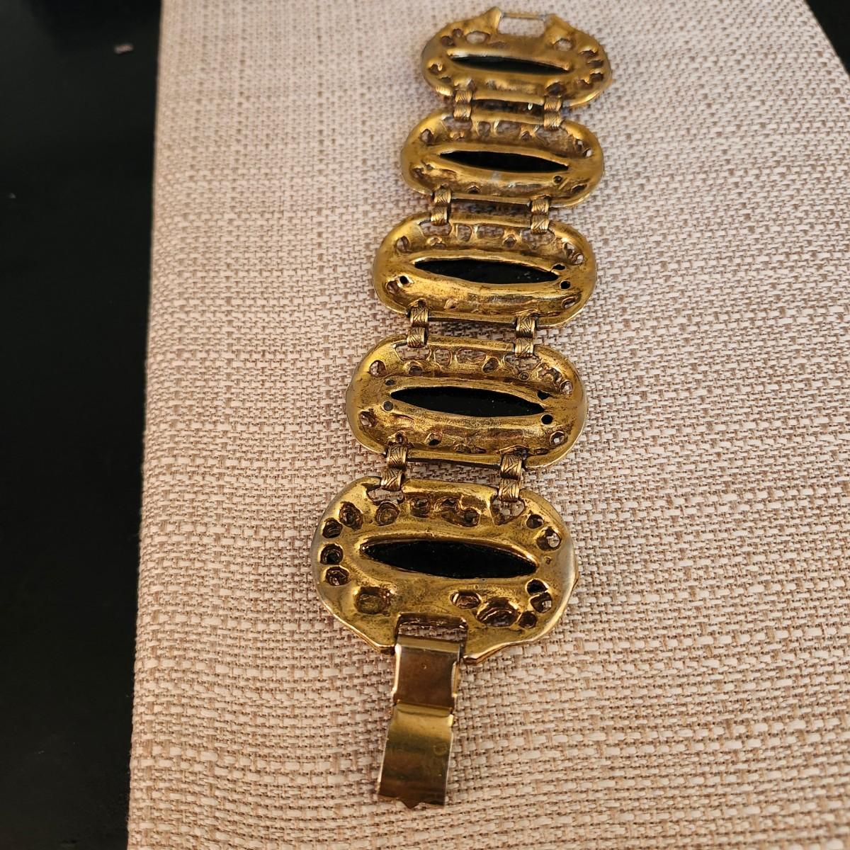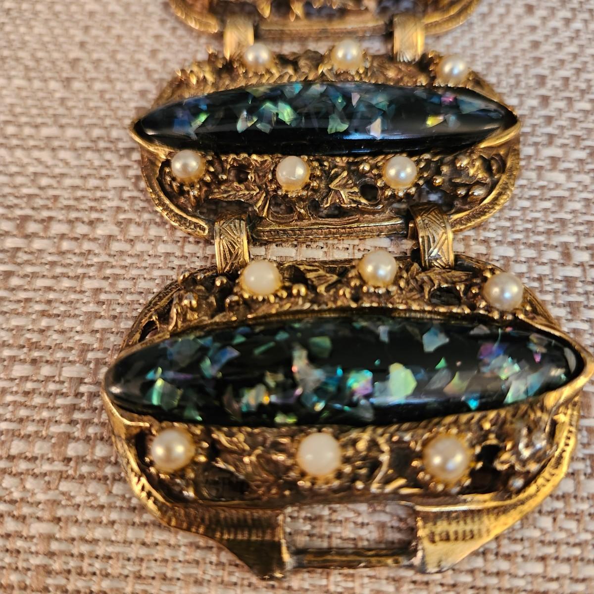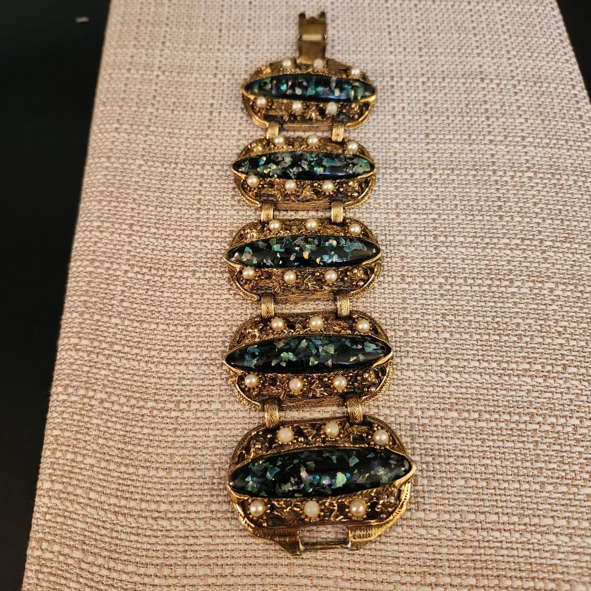 Vintage, Selro Selini Lucite bracelet. Each metallic link is wide, with gold plating and florets set with pearl and green rhinestones. Fold over clasp. Very nice condition for being pre-owned.