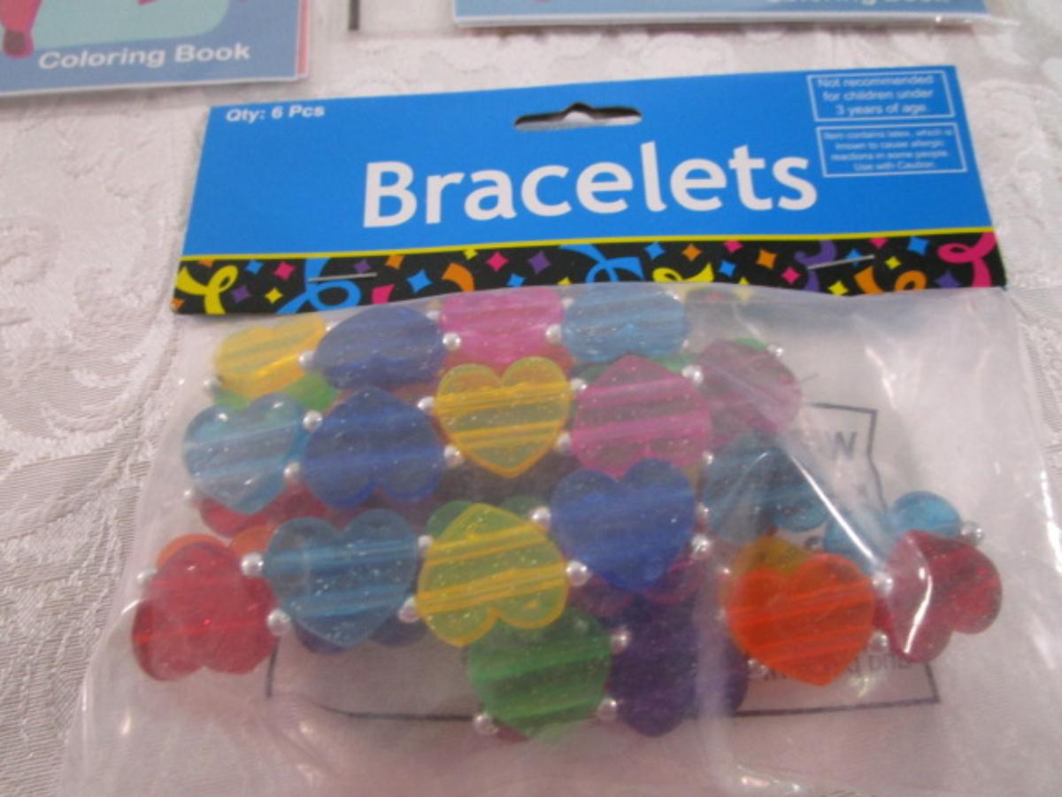 Valentine mailbox, 1 canister is a bear, one has cartoon characters, 4 coloring books (2 pk of 2 ea), pkg of toy bracelets, 2 necklaces, heart cutouts, confetti