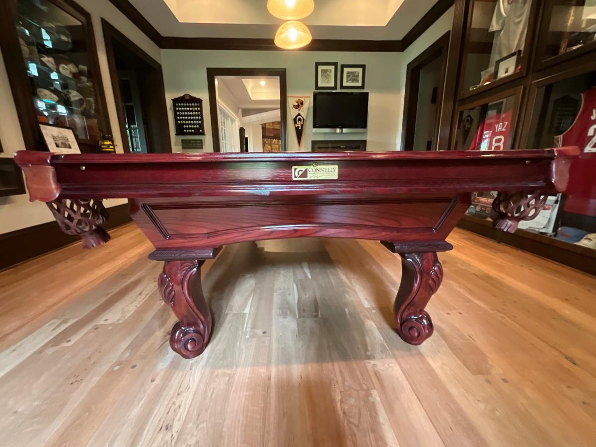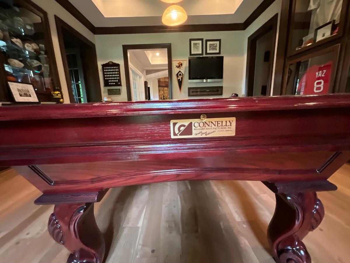 Connelly billiard manufacturing- Overall length is 112 inches, overall is 62 inches, and its 32 inches tall - Play area is 100 inches long and 51 inches wide. Comes with a pool table cover as well. Been played on maybe 10 times comes with a cover as well.
