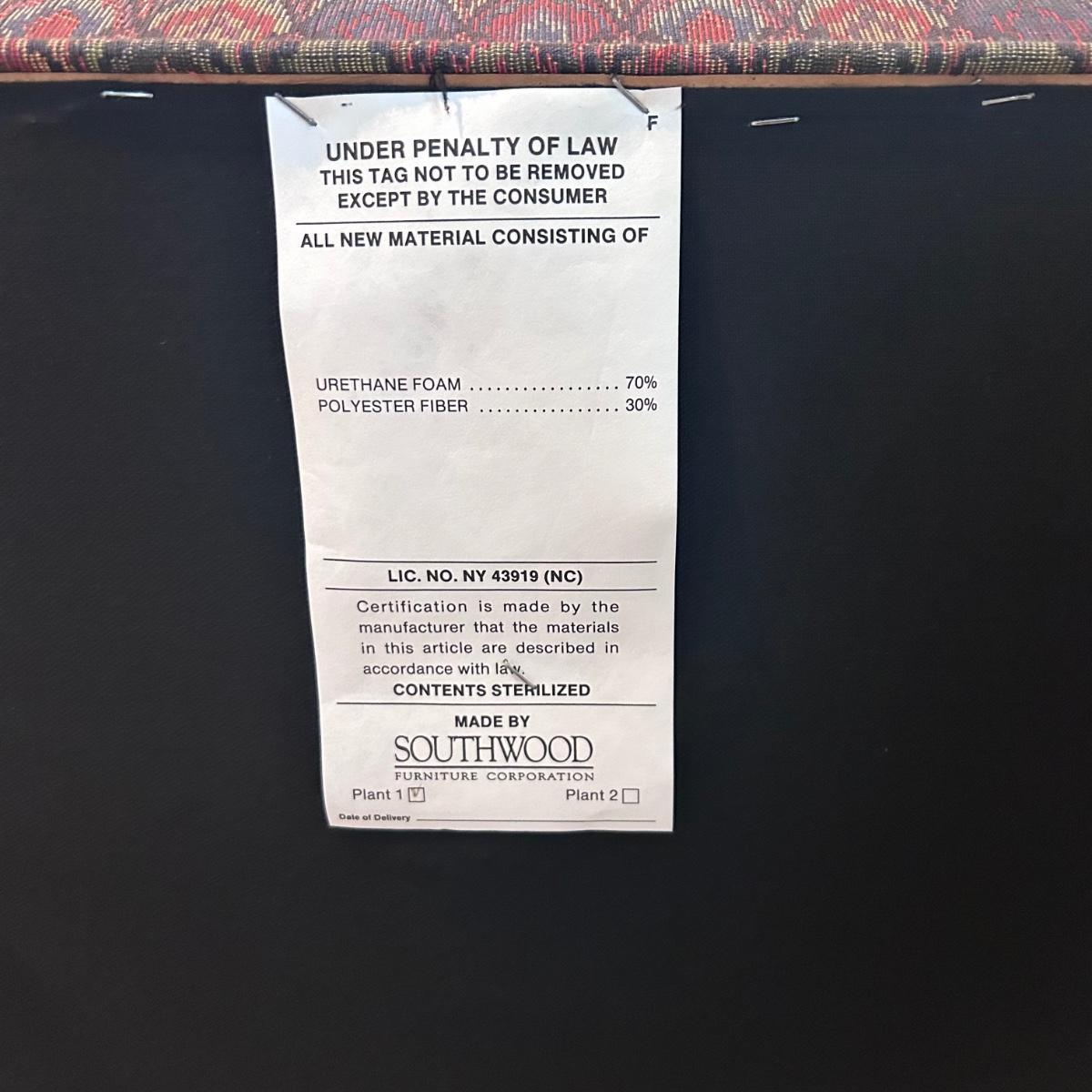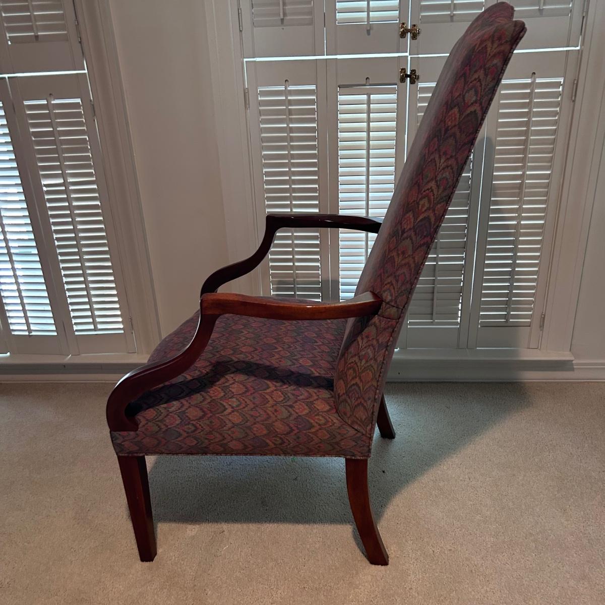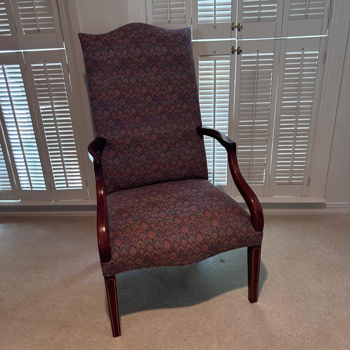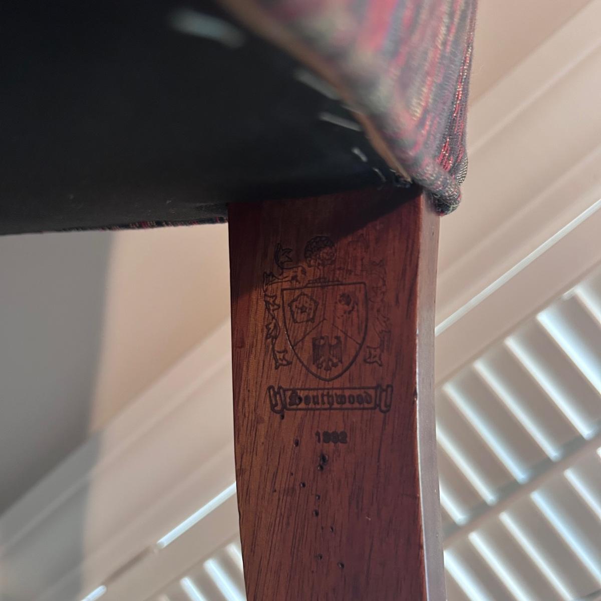 North Carolina made in 1992 by Southwood, this wood armchair with fabric seat and back is sturdy and no found blemishes. Chair measures 24” x 25” x 44”H with a seat height of 16.5”. Local pick up only.