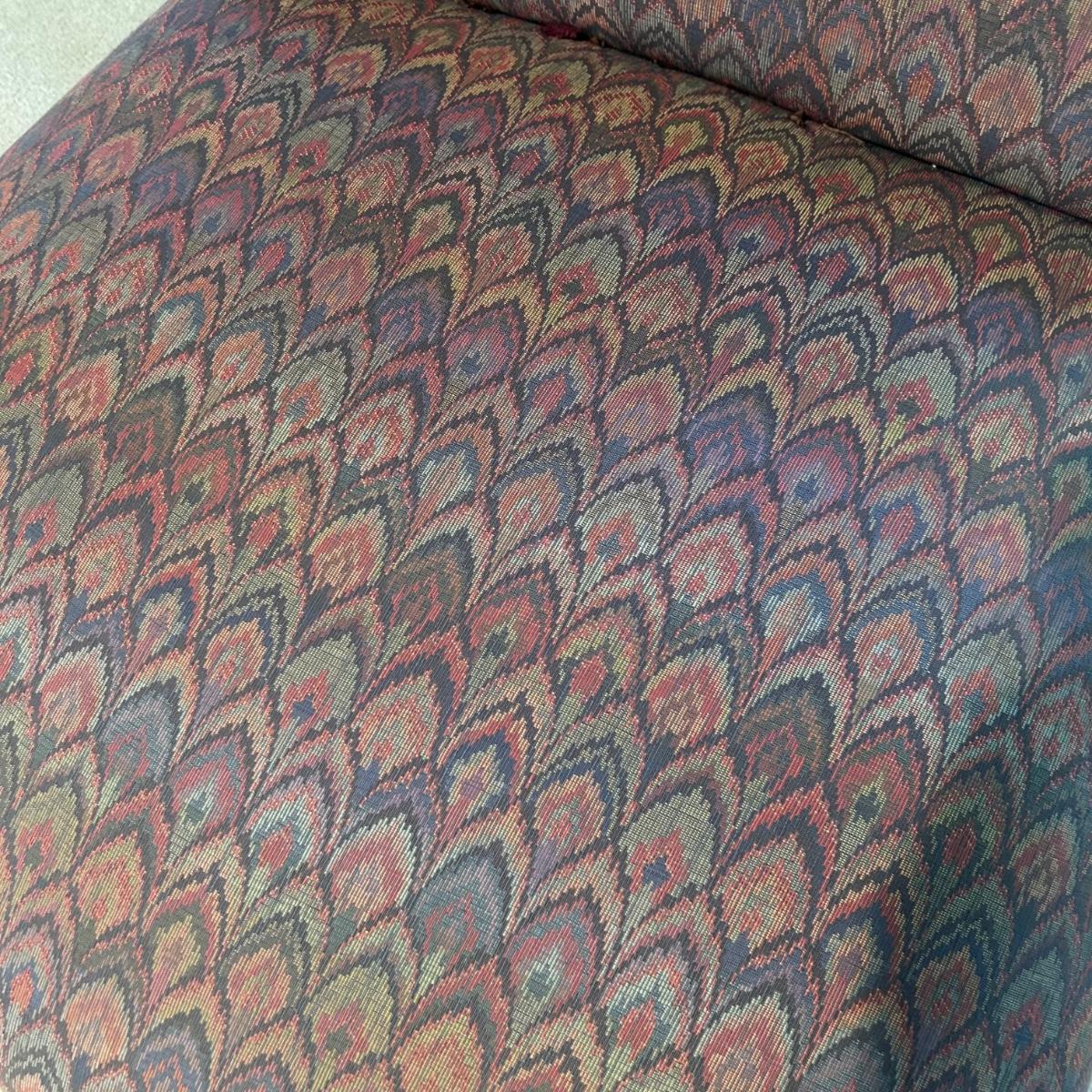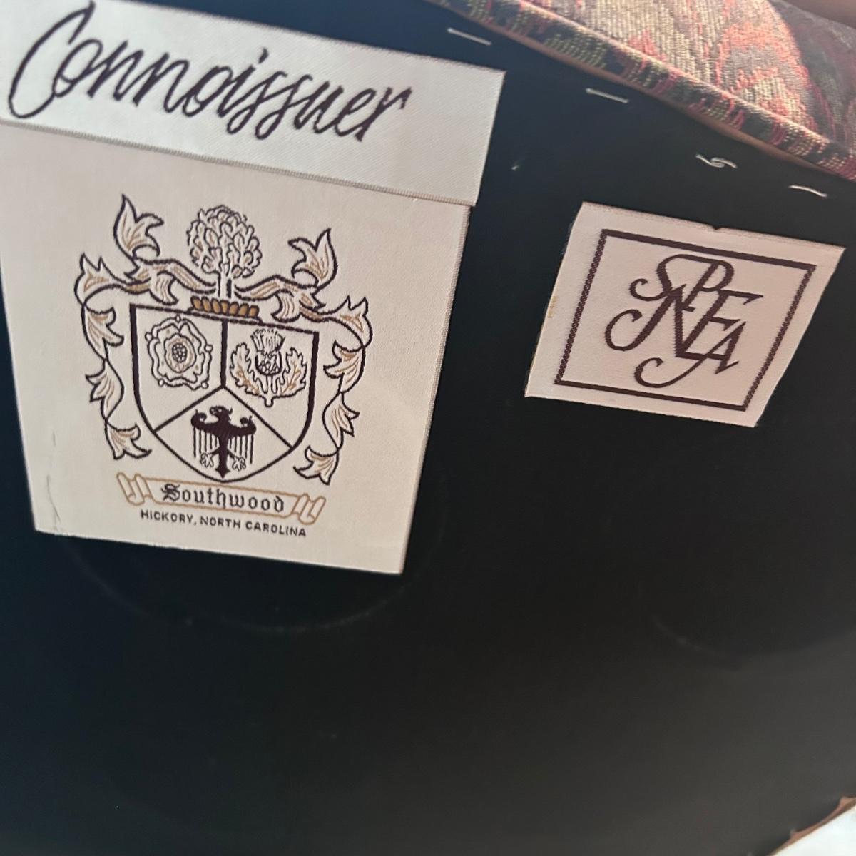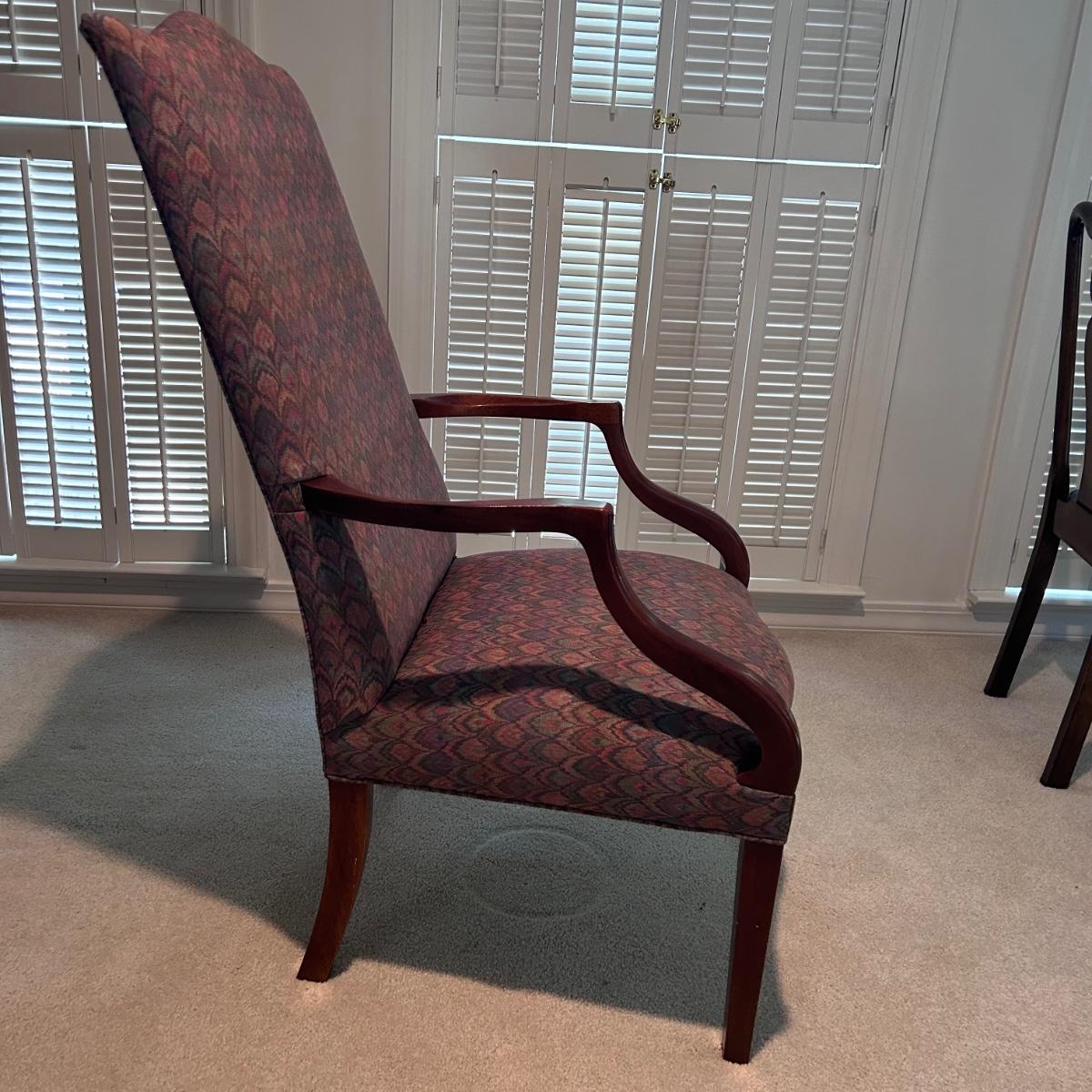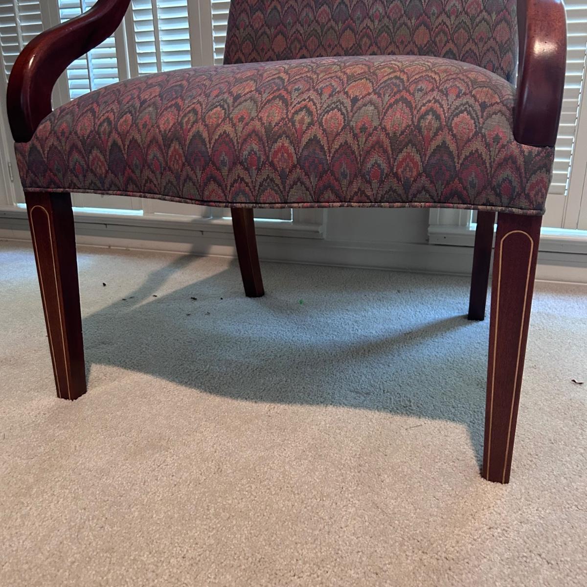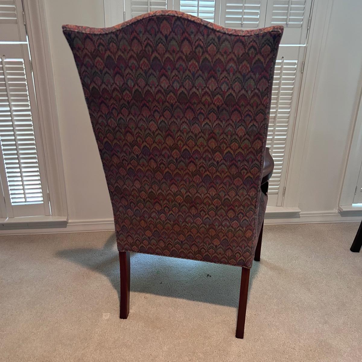 North Carolina made in 1992 by Southwood, this wood armchair with fabric seat and back is sturdy and no found blemishes. Chair measures 24” x 25” x 44”H with a seat height of 16.5”. Local pick up only.