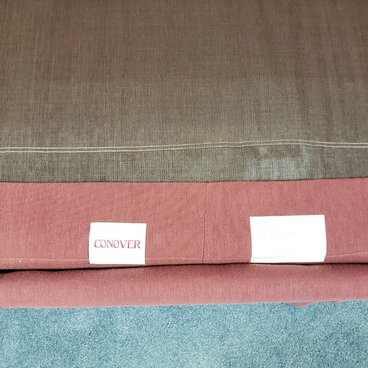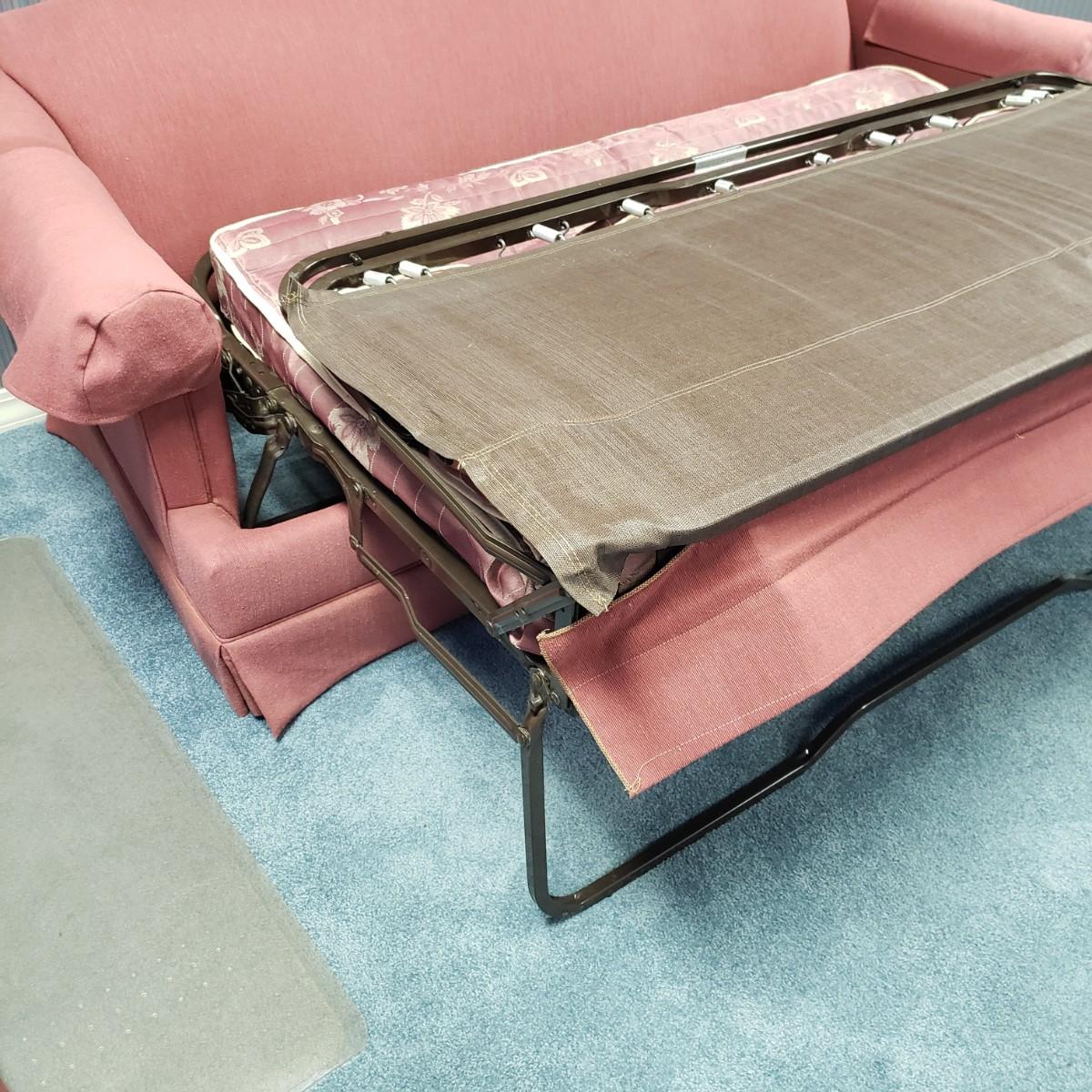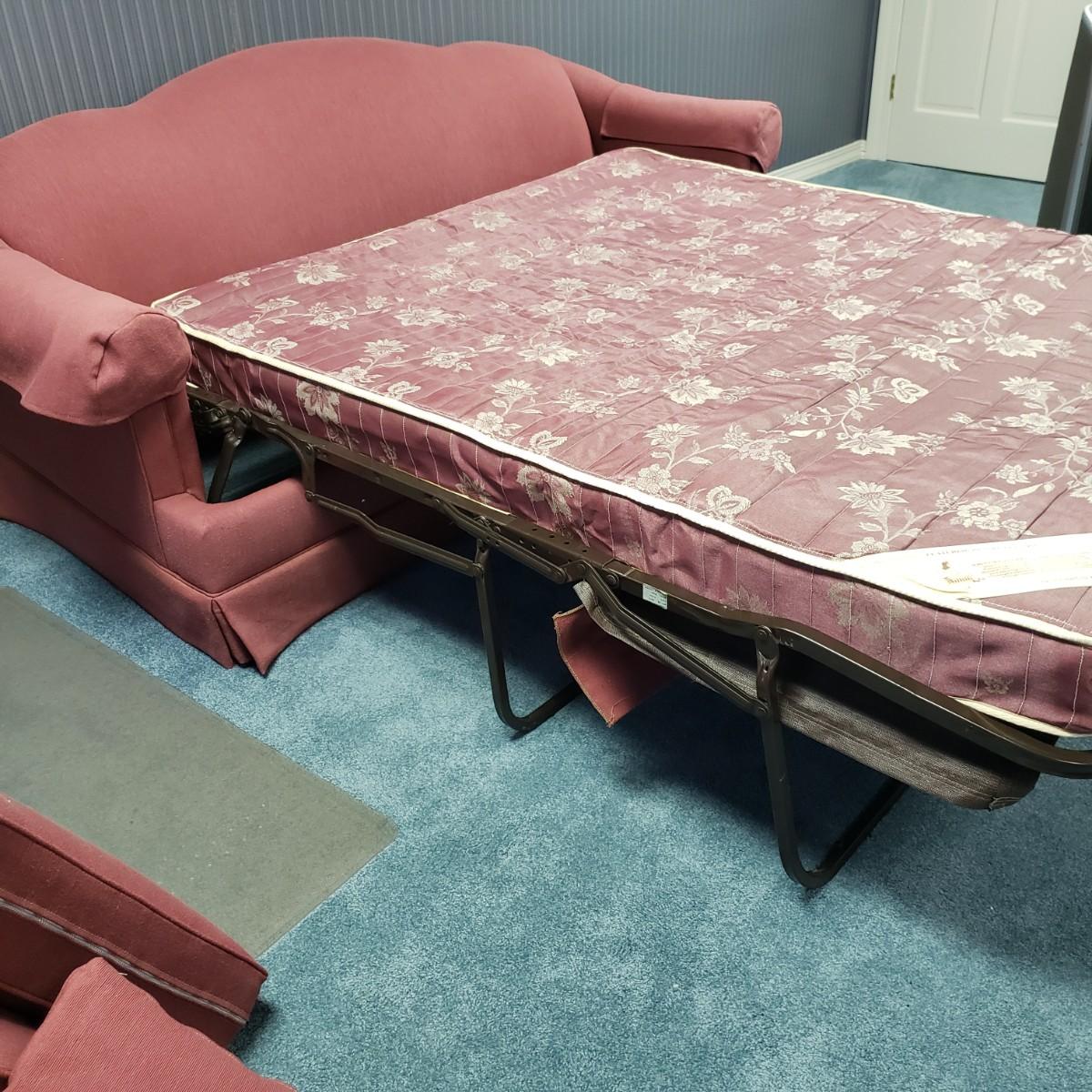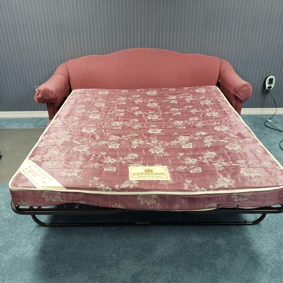 This Conover Chair Company sleeper sofa measures 80" x 35" x 32"H, with a seat height of 18". The mauve colored couch is covered with a textured, ribbed, heavy upholstered fabric. The cushion covers/matching pillows have zippers. The couch comes with two sets of matching decorative pillows. The pullout bed has a metal frame and a Kingsdown mattress. The bed measures 60"x 72"x 5"H.