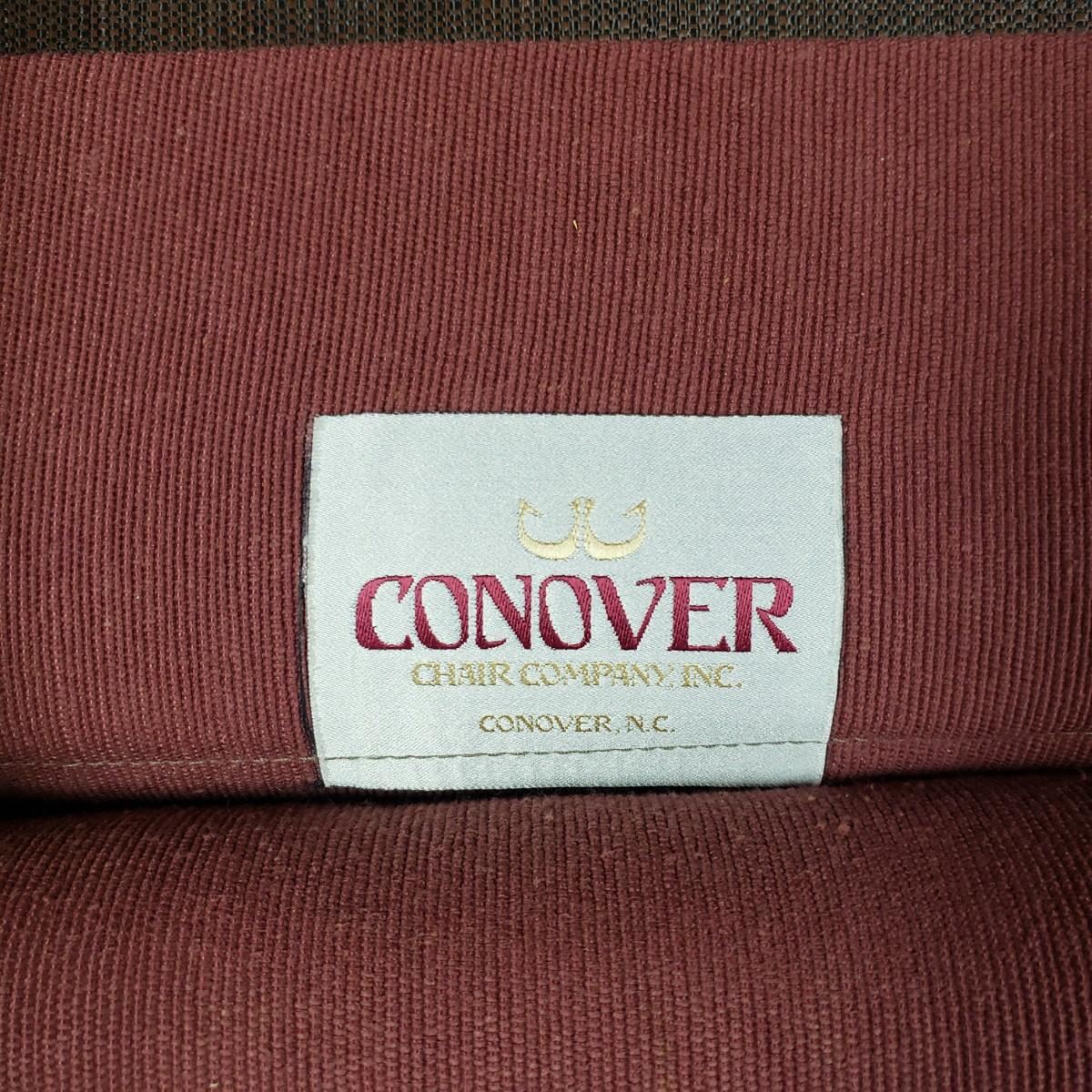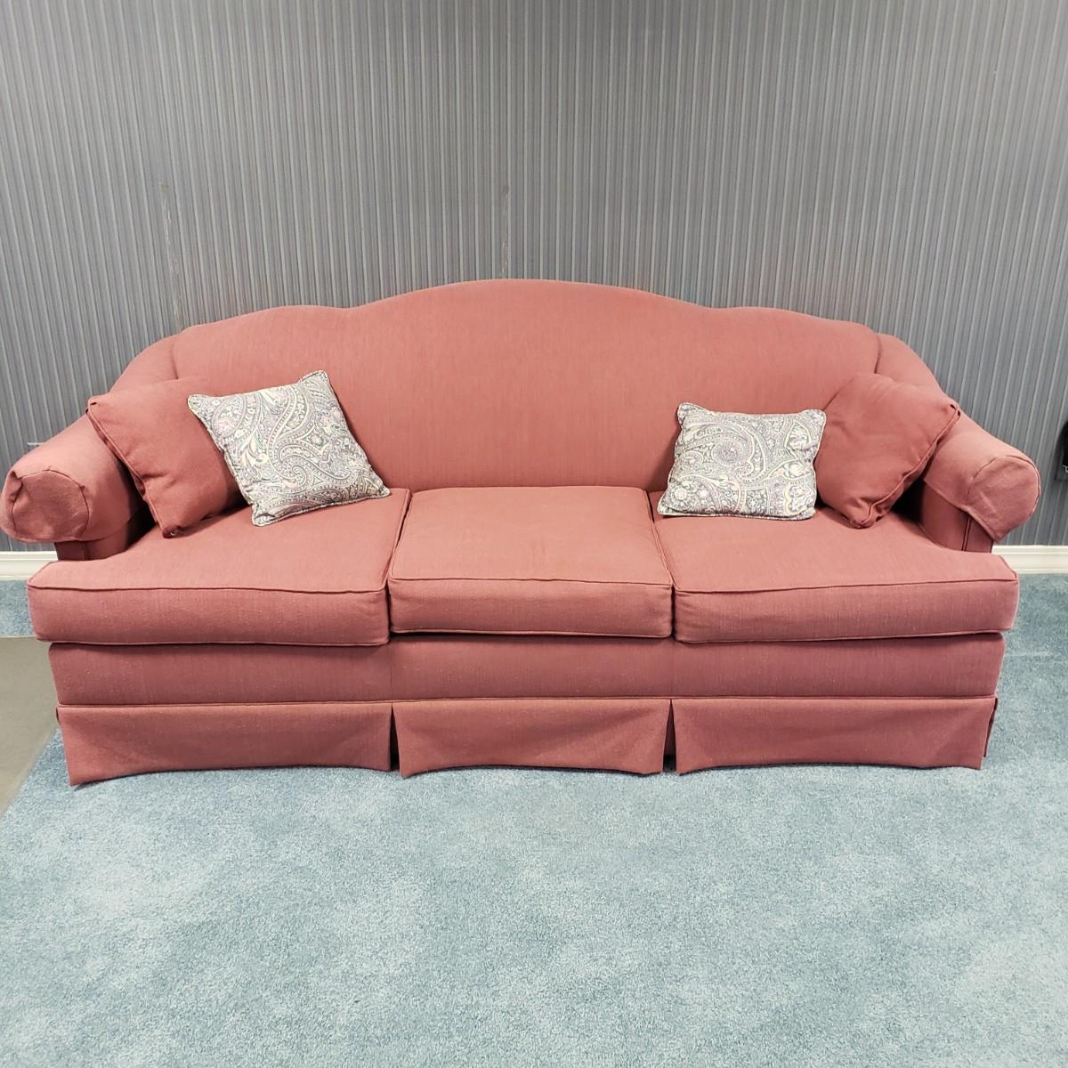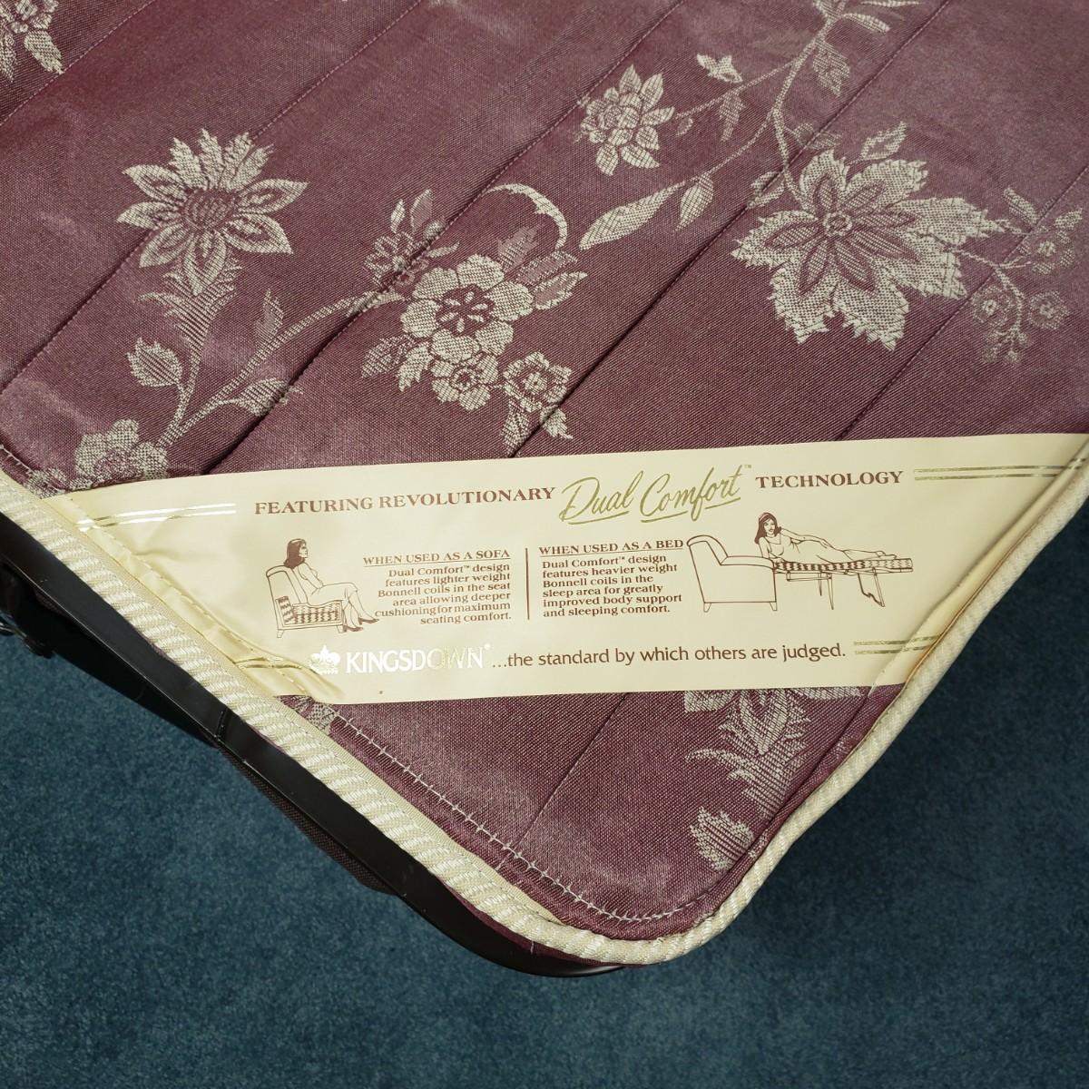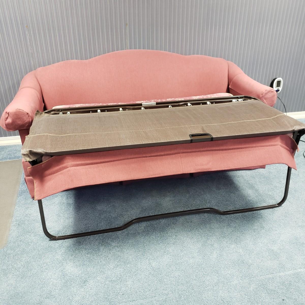 This Conover Chair Company sleeper sofa measures 80" x 35" x 32"H, with a seat height of 18". The mauve colored couch is covered with a textured, ribbed, heavy upholstered fabric. The cushion covers/matching pillows have zippers. The couch comes with two sets of matching decorative pillows. The pullout bed has a metal frame and a Kingsdown mattress. The bed measures 60"x 72"x 5"H.