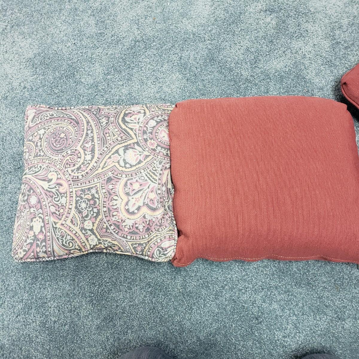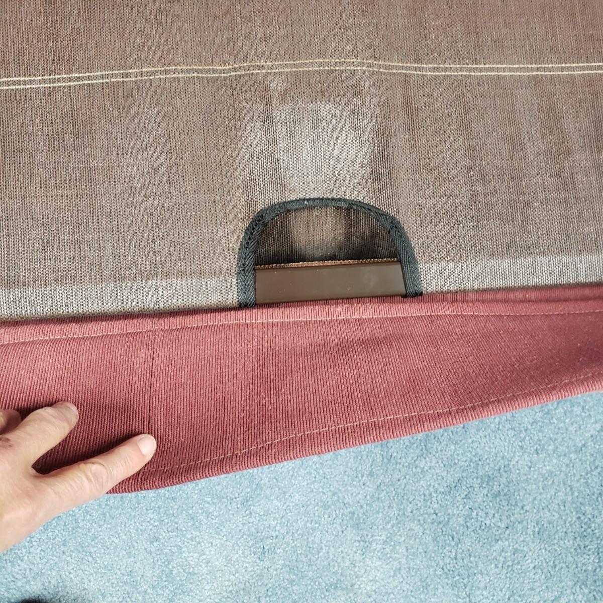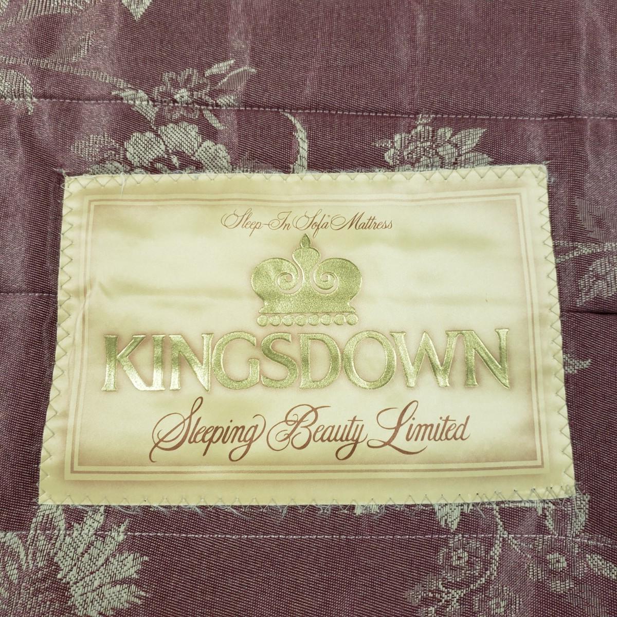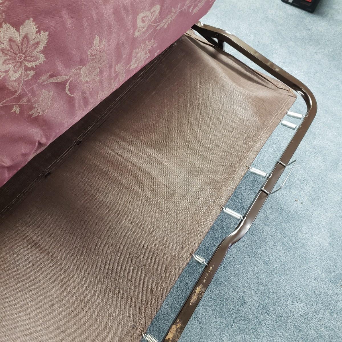 This Conover Chair Company sleeper sofa measures 80" x 35" x 32"H, with a seat height of 18". The mauve colored couch is covered with a textured, ribbed, heavy upholstered fabric. The cushion covers/matching pillows have zippers. The couch comes with two sets of matching decorative pillows. The pullout bed has a metal frame and a Kingsdown mattress. The bed measures 60"x 72"x 5"H.