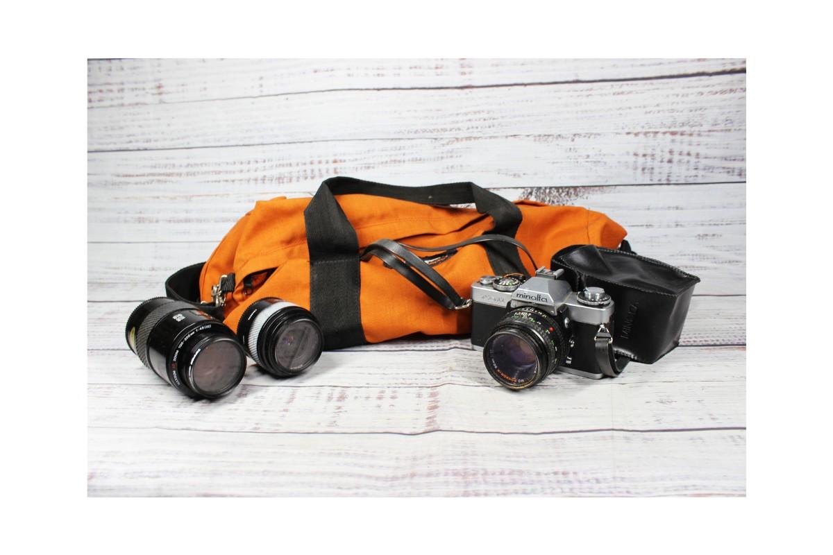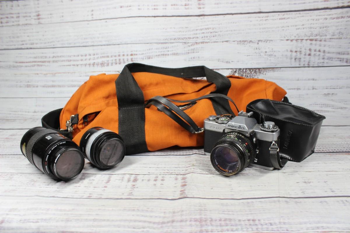 Vintage Minolta XD11 Film Camera, AF Lenses, and Camera Bag