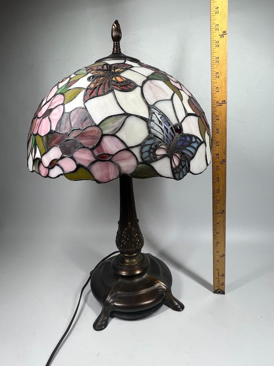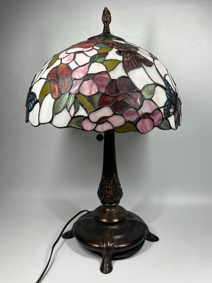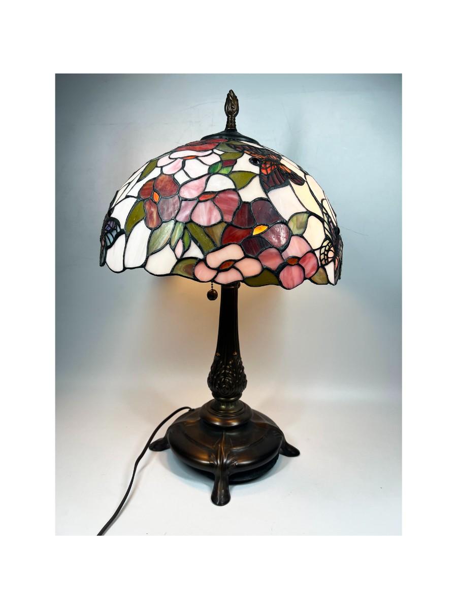 Retro Stained Glass Tiffany Styled Pink & Purple Flower Pattern Glass Cast Metal Base Lamp